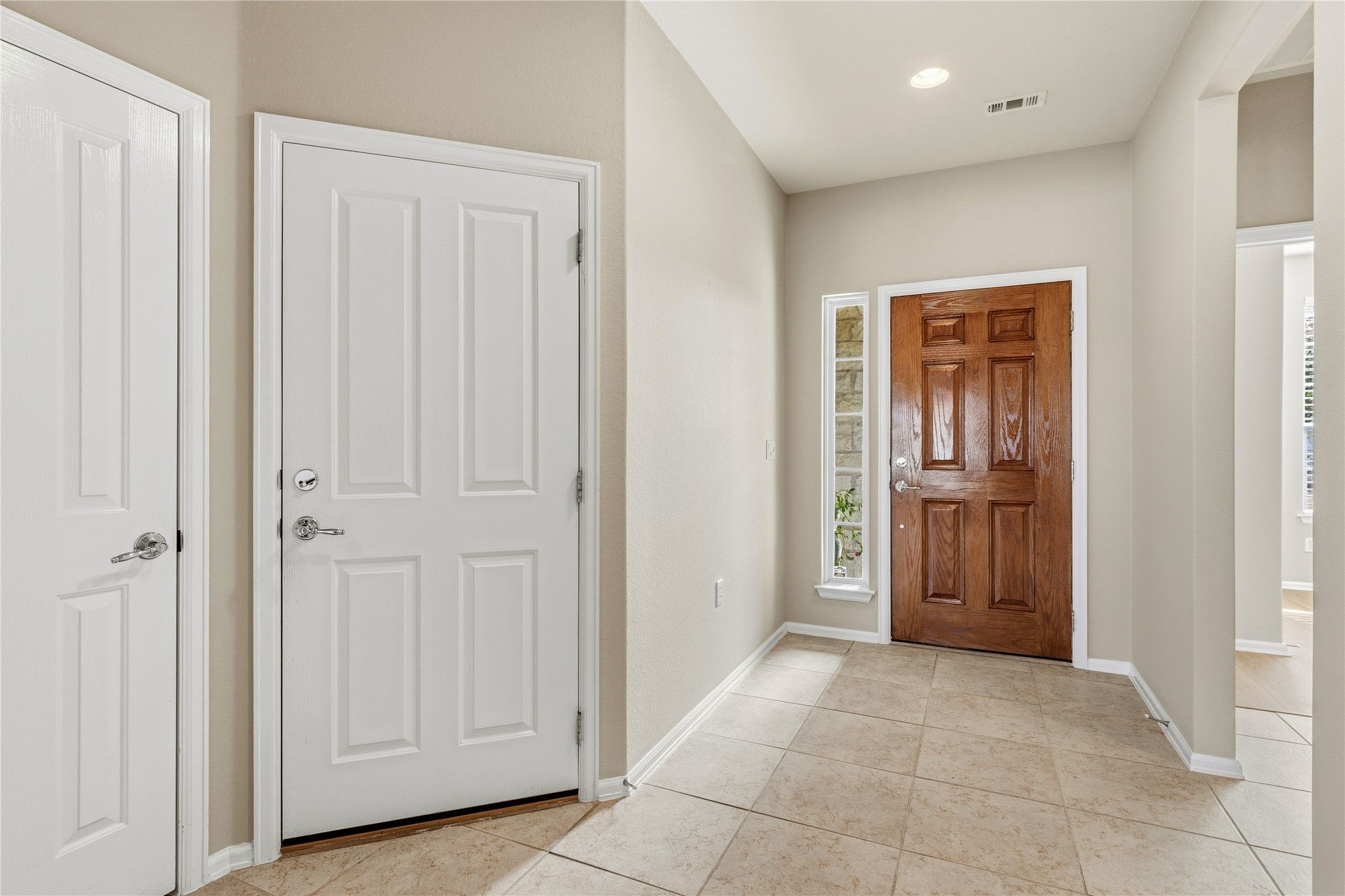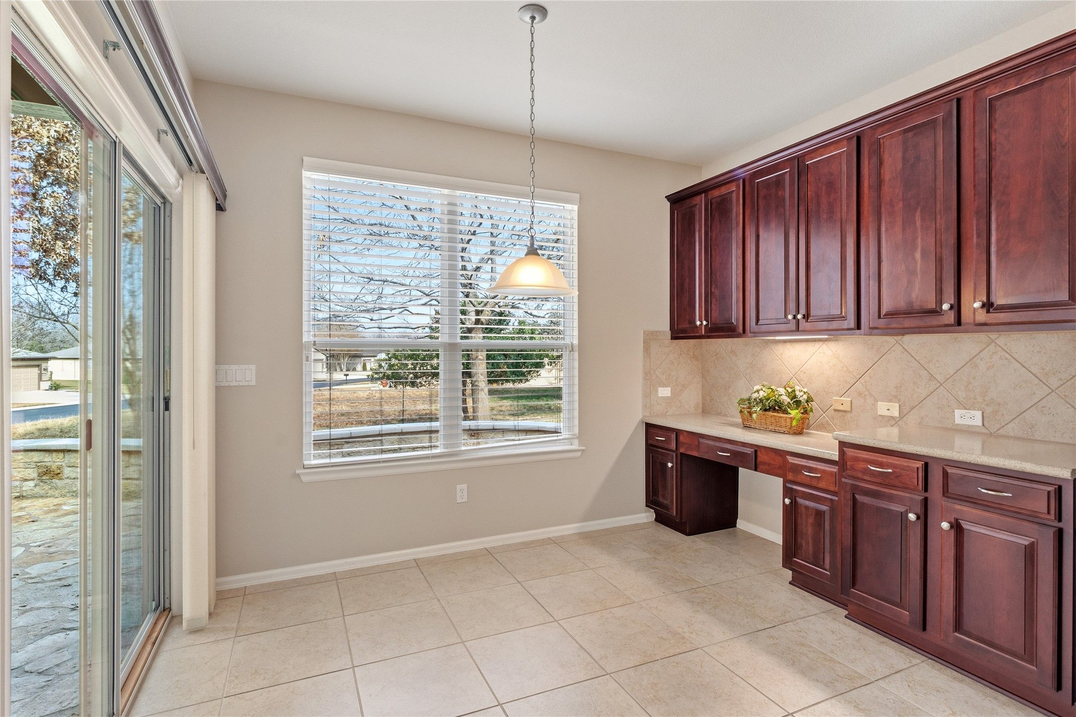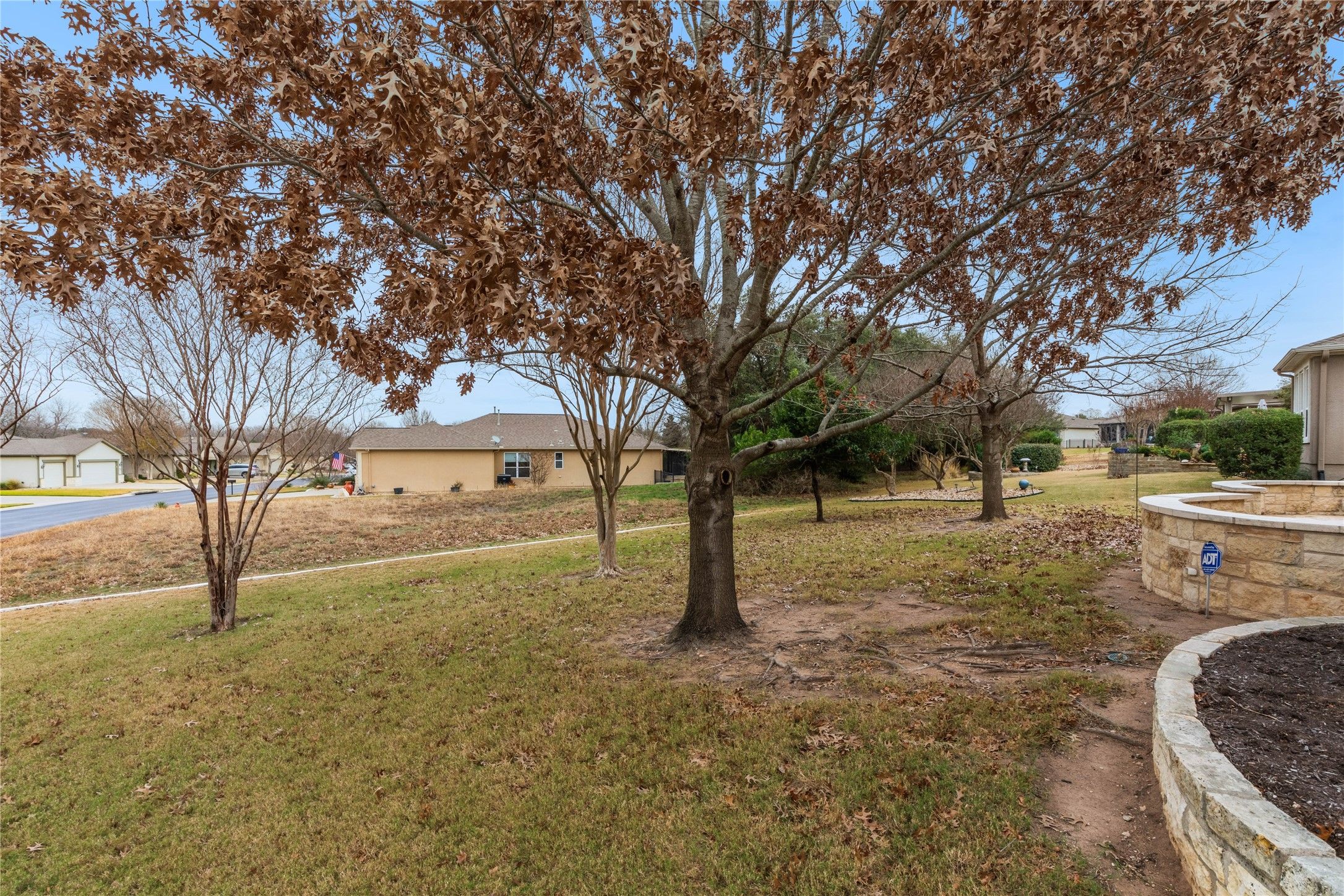 Located on nearly a third of an acre, this beautiful Longstreet model offers some unusual features: a full three car extended garage, 11 mature trees including 3 oaks, and a forever wild greenbelt area that is frequently visited by deer, turkeys, squirrels, and butterflies. With NO STEPS to either the front door or from the garage, one enters a welcoming foyer that is adjacent to 2 guest rooms and a full bath. Step into a spacious open-concept area with dining, family room, kitchen with bar, and a combined kitchen/eating space with desk. Stainless steel appliances include a dishwasher, refrigerator/freezer, glass-topped range, and microwave. A laundry room, complete with a sink and a window, and an office that is entered through a French door are adjacent to the family room. The master suite includes an expansive closet, dual vanities, a garden tub and a separate shower. Hunter Douglas blinds have been installed throughout the home. Tile is found throughout the main living areas and Vinyl Plank Tile is found in the bedrooms, closets, and the office, which promotes low maintenance. A sliding glass door opens onto a delightful patio that has been extended and has a seat wall. This is a perfect area to commune with neighbors, the wildlife including songbirds, the stars, read, or to have dinner or a morning coffee. Finally, two of the Sun City amenity centers are close by as is the new Parmer Ranch Marketplace.