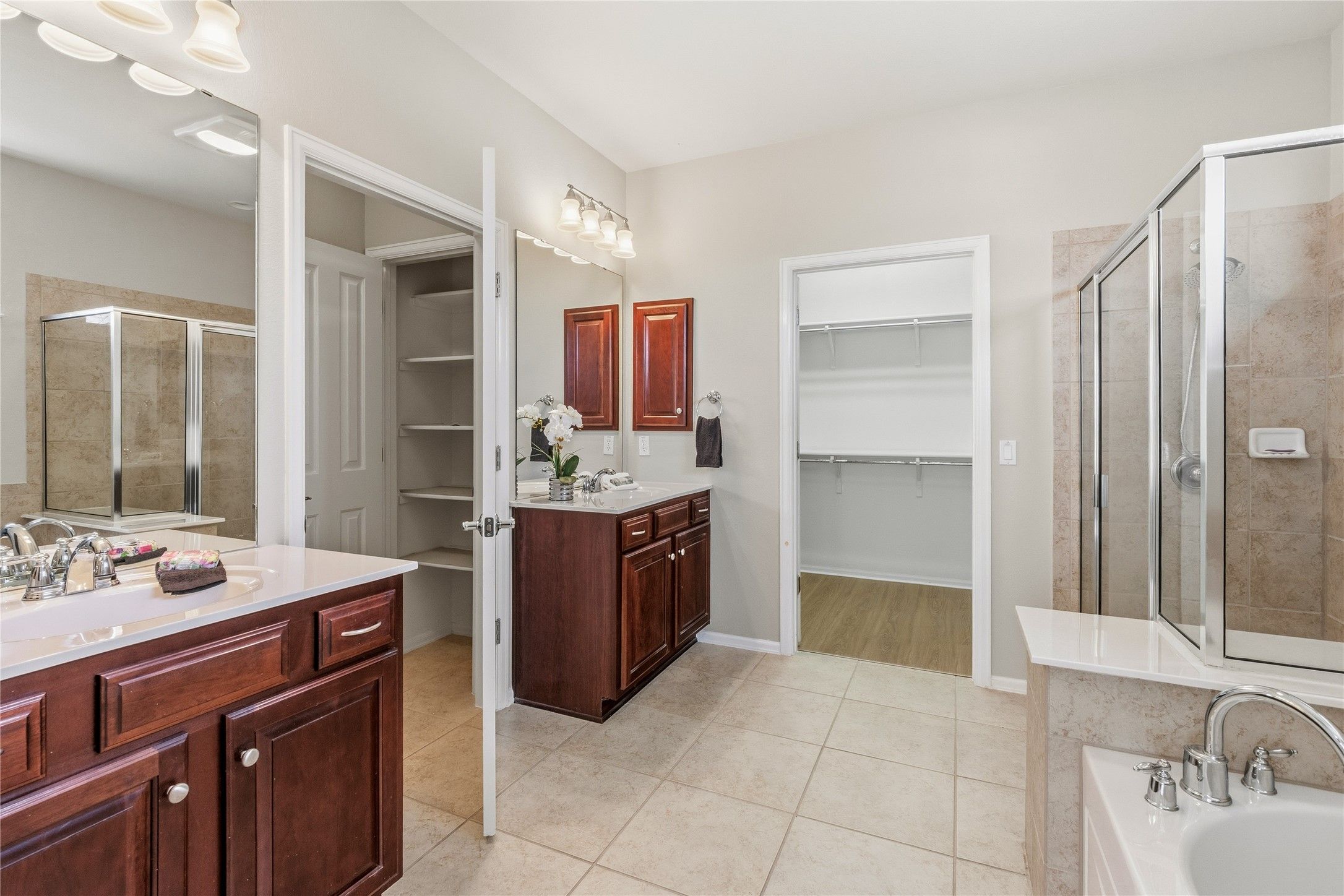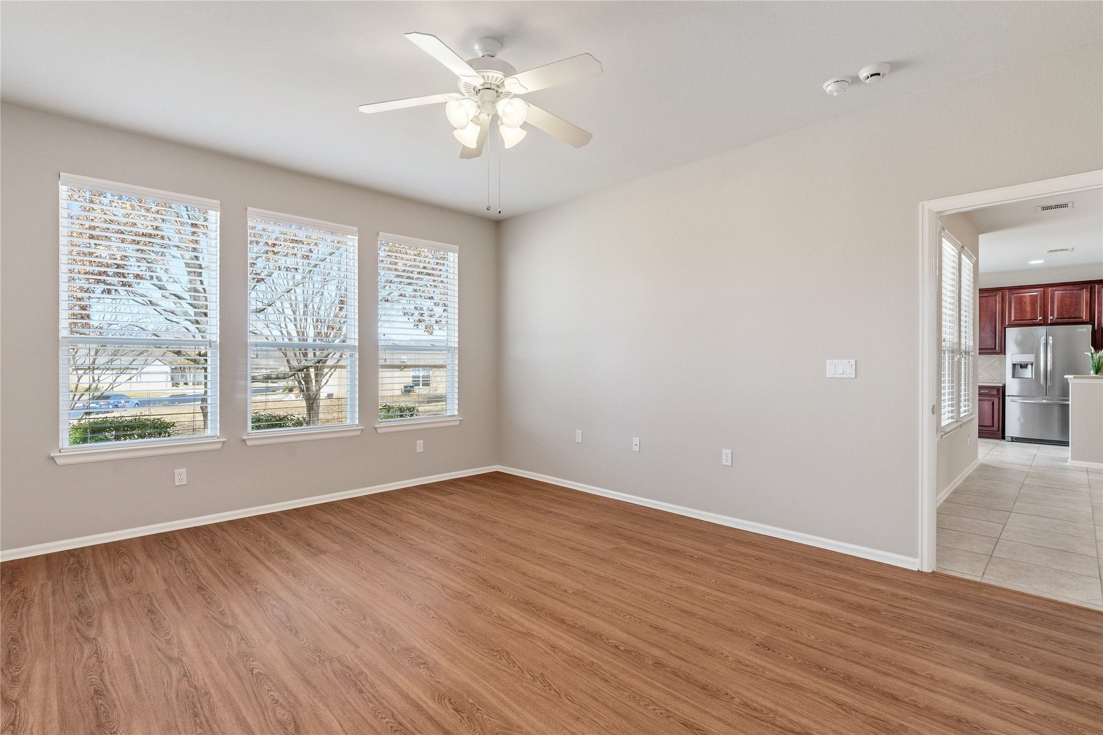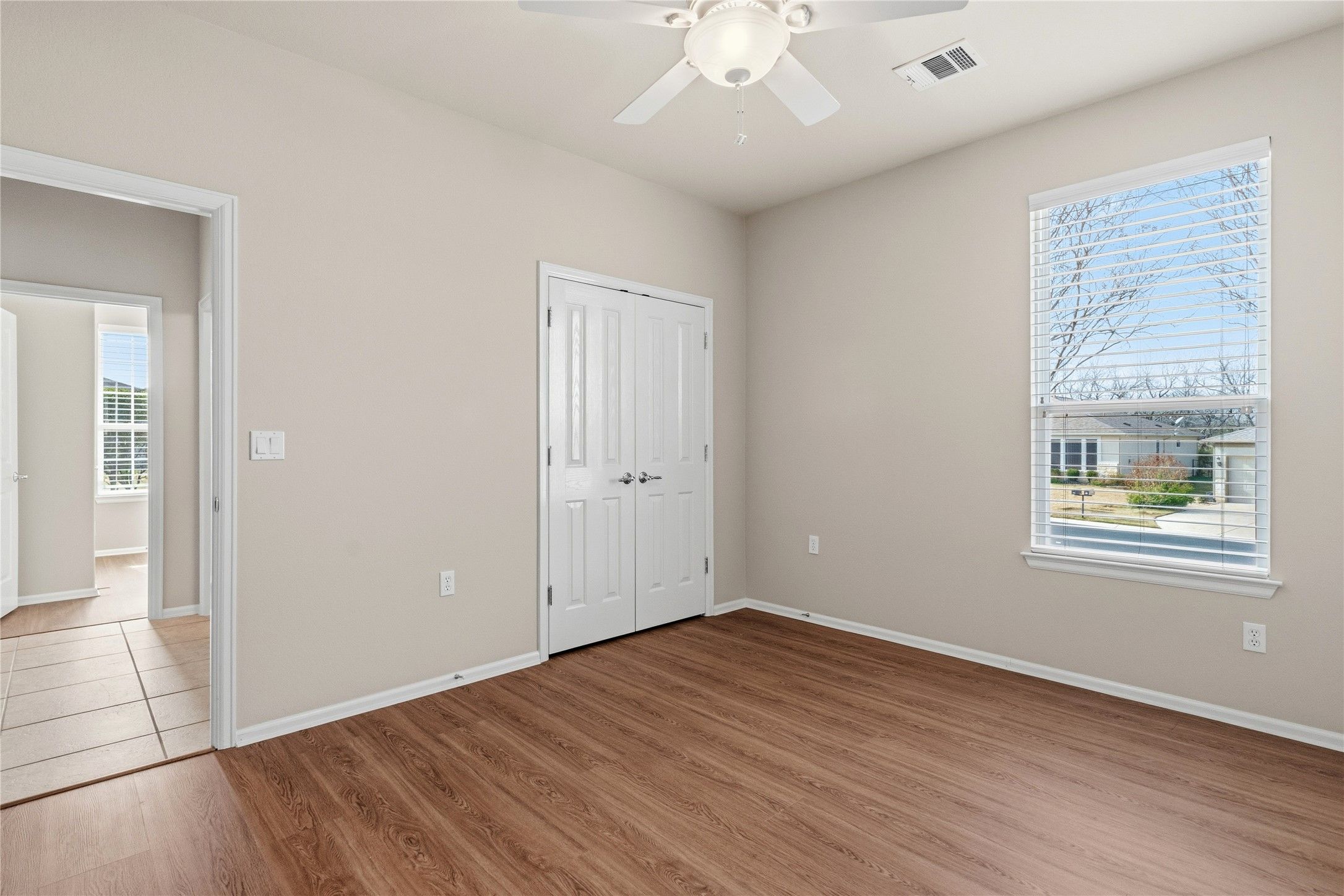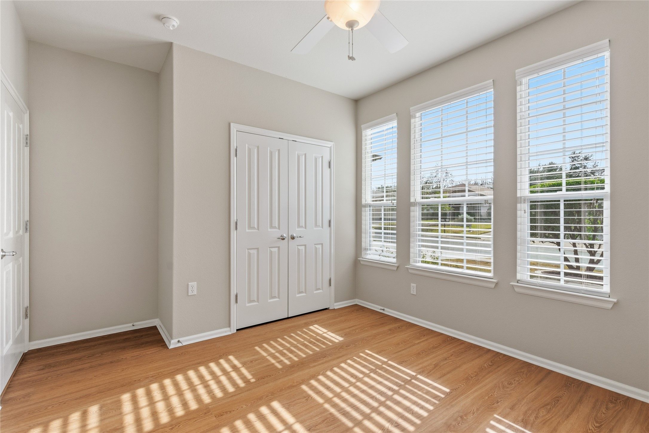 Located on nearly a third of an acre, this beautiful Longstreet model offers some unusual features: a full three car extended garage, 11 mature trees including 3 oaks, and a forever wild greenbelt area that is frequently visited by deer, turkeys, squirrels, and butterflies. With NO STEPS to either the front door or from the garage, one enters a welcoming foyer that is adjacent to 2 guest rooms and a full bath. Step into a spacious open-concept area with dining, family room, kitchen with bar, and a combined kitchen/eating space with desk. Stainless steel appliances include a dishwasher, refrigerator/freezer, glass-topped range, and microwave. A laundry room, complete with a sink and a window, and an office that is entered through a French door are adjacent to the family room. The master suite includes an expansive closet, dual vanities, a garden tub and a separate shower. Hunter Douglas blinds have been installed throughout the home. Tile is found throughout the main living areas and Vinyl Plank Tile is found in the bedrooms, closets, and the office, which promotes low maintenance. A sliding glass door opens onto a delightful patio that has been extended and has a seat wall. This is a perfect area to commune with neighbors, the wildlife including songbirds, the stars, read, or to have dinner or a morning coffee. Finally, two of the Sun City amenity centers are close by as is the new Parmer Ranch Marketplace.