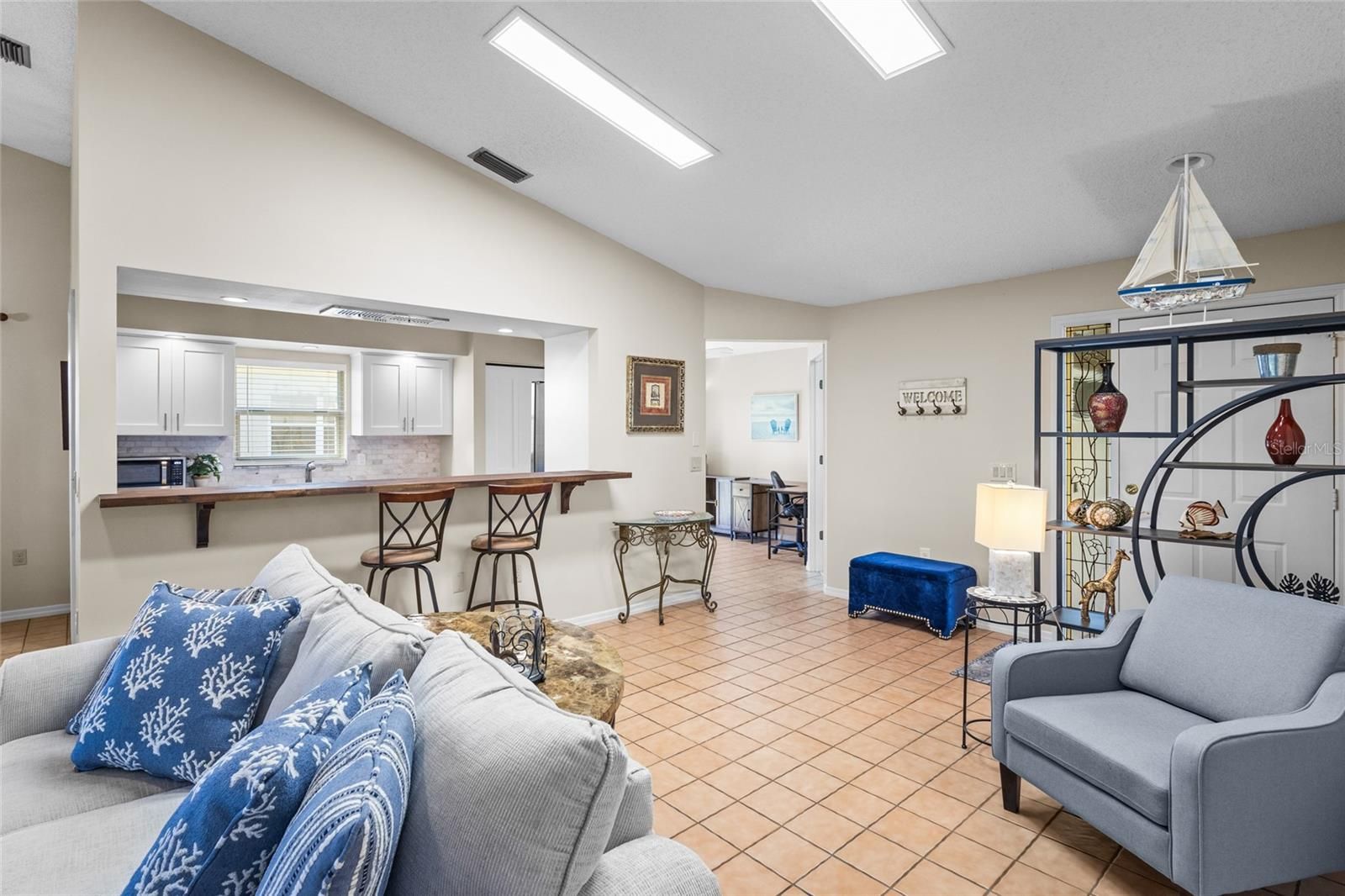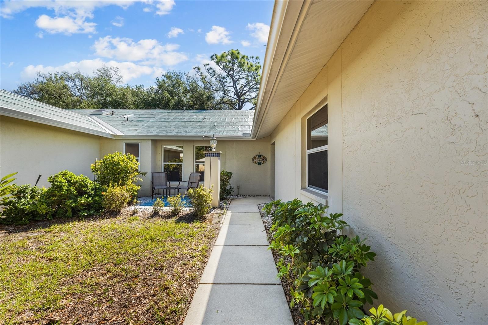 Enjoy effortless Florida living in this turnkey furnished villa in Myrtle Trace at Plantation Golf & Country Club, where exterior maintenance is handled for you, allowing more time to relax and enjoy the lifestyle you came for. This beautifully updated home is in the process of receiving a brand-new durable composite roof designed to offer the classic look of tile with enhanced longevity and performance. The kitchen has been completely renovated in 2025, featuring white shaker cabinet doors, Corian countertops, a stylish new backsplash, and stainless steel appliances, creating a fresh and modern space at the heart of the home. Just off the kitchen is a versatile flex space, currently used as an office, with sliding doors that lead to a private patio—perfect for convenient outdoor grilling. Natural light fills the home, highlighting the cathedral ceilings and open floor plan that create an airy and inviting atmosphere. The spacious enclosed lanai serves as a true Florida room, complete with sliding glass doors so it can be enjoyed year-round. From here, you’ll appreciate peaceful views with a glimpse of the 5th hole of the Bobcat Course, offering a relaxing backdrop for entertaining or unwinding. The thoughtfully designed layout offers excellent storage throughout. The primary suite is generously sized with a large walk-in closet, dual sinks, and a walk-in shower with glass enclosure. The guest suite is equally spacious, featuring its own en-suite bath with a tub/shower combination and a large walk-in closet. A convenient half bath is perfectly situated for guests, making this home ideal for hosting. Both bedrooms comfortably accommodate king-sized furnishings, enhancing the home’s livability. Additional updates include a 2019 HVAC system, full re-plumbing, and hurricane shutters for all windows, providing peace of mind. Residents of Myrtle Trace enjoy an active and welcoming community atmosphere with a well-used clubhouse that serves as the hub for social events, including weekly gatherings, coffee meetups, games, and seasonal celebrations. The clubhouse area surrounds a heated pool, where water aerobics and outdoor activities are regularly enjoyed, along with features such as an outdoor shower and gas barbecue. There is no CDD fee, and optional membership to Plantation Golf & Country Club expands your lifestyle even further with access to two 18-hole championship golf courses, 13 Har-Tru tennis courts, pickleball, bocce ball, a fitness center, Jr. Olympic pool, and exceptional dining and social events. This turnkey villa offers the perfect opportunity to step right into the Florida lifestyle and start enjoying it immediately.