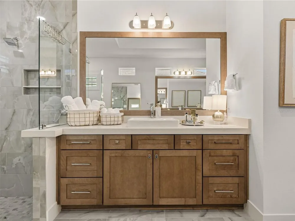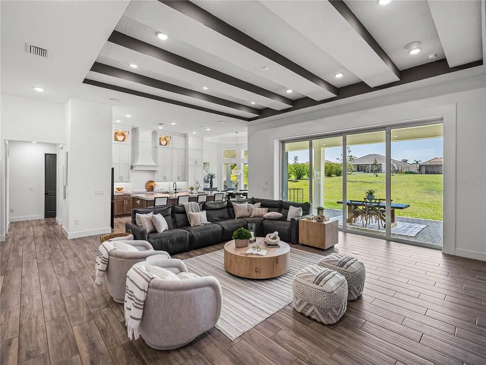 SELLER IS OFFERING UP TO $5,000. towards your LJ Golf Membership, or HOA Fees, or Closing Costs! This exquisite, elegant, and extraordinary, this stunning 2024-built luxury home in the desirable, gated community of Lake Jovita offers the ultimate Florida lifestyle. Perfectly positioned on nearly 3/4 of an acre, the striking exterior makes a lasting impression with manicured landscaping, stone accents, a long paver driveway with extended parking, and an oversized 4-car garage with sealed epoxy floors. A covered double-door entry welcomes you into the grand foyer, where the breathtaking interior unfolds. Soaring 12’ decorative ceilings accent nearly every room, including the foyer, dining, den, living room, kitchen nook, primary suite, and back porch- while long plank tile flooring, dark greige solid-core (6) interior doors, and plantation shutters throughout elevate the aesthetic. The expansive open floor plan is enhanced by prewired TV and internet stations in each room to keep cords hidden and the look seamless. The living room takes center stage, anchored by a statement electric fireplace set against a floor-to-ceiling stone feature wall, flanked by two well-placed floor outlets for flexible furniture placement. The kitchen is nothing short of spectacular, designed to inspire culinary works of art, with thick quartz countertops, an extended island offering wraparound seating for six, a separate ice maker, and glass display cabinets with dimmable lighting framing the beautifully elongated custom hood. Additional luxuries include under-cabinet lighting, pull-out shelving in all lower cabinets, and a hidden walk-in pantry with wooden shelves and outlets for small appliances. An elegant dining room with a tray ceiling offers seamless views of the living space- ideal for entertaining. Nearby, a dedicated office pairs beautifully with a conveniently located half bathroom upgraded with cabinetry, perfect for today’s work-from-home lifestyle. The primary suite is a private retreat with expansive sleeping quarters, two built-out walk-in closets with shelving, drawers, and charging outlets, and two recessed lights over the bed with dimmable switches at each nightstand. The ensuite bathroom is spa-inspired, with gorgeous tiled walls, a serene soaking tub, a custom walk-in shower, dual vanities with vessel sinks and stylish cabinetry, and built-in linen storage. Two guest bedrooms are thoughtfully located on the opposite side of the home, each with a walk-in closet and full ensuite bathroom. One guest bath includes an upgraded layout with an exterior door- perfect for a future pool bath. A full cabinet suite in the laundry room includes quartz countertops, a sink, a shelf over the washer/dryer with valet rods, and sliding shelves in all lower cabinets. An additional laundry sink in the garage and a second washer/dryer hookup add versatility. Other thoughtful touches include prewiring for patio ceiling fans, soffit outlets for Christmas lights, and enhanced recessed lighting throughout. Authentic Florida living awaits outdoors, where a covered porch- already plumbed for a summer kitchen- overlooks the expansive backyard, offering the ideal space to relax or entertain. Beyond the property, Lake Jovita provides an unparalleled lifestyle with two championship golf courses, a resort-style clubhouse, tennis and pickleball courts, dog parks, a fitness center, a one-third-mile walking and running loop with exercise stations, and more.