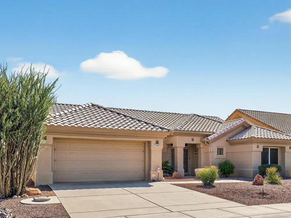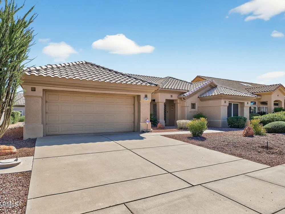 OUTSTANDING VALUE & GREAT LOCATION! This Safford is just blocks from Palm Ridge Rec center & Deer Valley Golf course. New HVAC in 2021, recently painted exterior, Hardwood floors, Plantation Shutters, Mirrored Wardrobe doors, 10' ceilings and a LARGE Lot. Primarily East/West Facing with a large covered back patio. Open Kitchen with a gas stove and views to the back patio and yard. Spacious primary bedroom with an ensuite bath featuring dual sinks, a walk in shower and a BIG walk-in closet. The second bedroom is also spacious & has a large walk-in closet! Extended garage with room for 2 cars and tandem GOLF CART STORAGE, plus storage cabinets and shelves! A clean, neutral palette that is move-in ready or update and customize to your own tastes and preferences. Low Taxes and No HOA fees. Easy cart ride to all SCW courses, rec centers and shopping. Sensationally priced Safford in a 5-Star location!