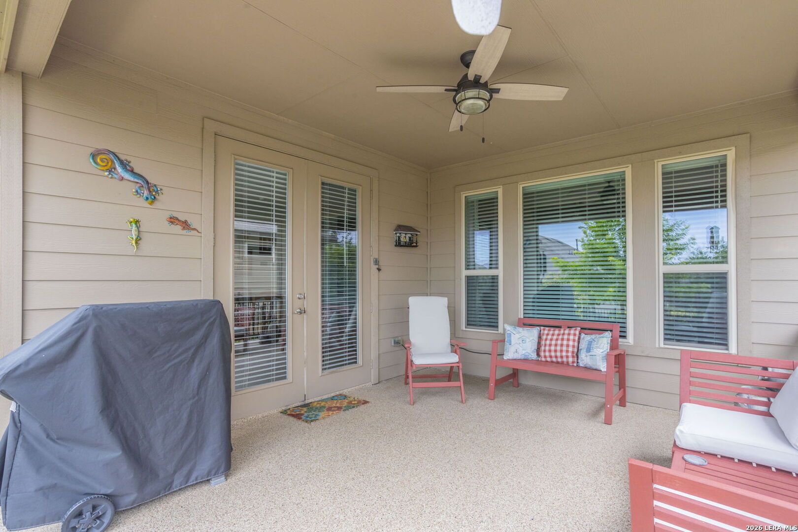This beautifully maintained one-story home offers the perfect blend of comfort, efficiency, and modern convenience - truly move-in ready from day one. Located within a secure gated community, it provides both privacy and peace of mind while still delivering an inviting, open atmosphere inside. Step through the front door and you're immediately welcomed by soaring high ceilings and a bright open floorplan that creates a seamless flow between the living, dining, and kitchen areas. The absence of carpet throughout the home adds a clean, contemporary feel while making maintenance simple and stress-free. Durable flooring not only enhances the aesthetic but also makes this home ideal for allergy-sensitive buyers or pet owners. The kitchen integrates effortlessly into the main living space, making entertaining easy and enjoyable. Whether hosting guests or enjoying a quiet evening at home, the layout allows everyone to stay connected. Ceiling fans in every room provide comfort and energy efficiency year-round. With two spacious bedrooms and two full bathrooms, the home offers flexibility for guests, a home office, or multi-generational living. The primary suite is designed as a relaxing retreat, while the second bedroom and bath are thoughtfully positioned for privacy and convenience. Functionality continues in the well-equipped laundry room, complete with its own utility sink - a practical feature that makes everyday chores easier. The attached garage includes a car charger, offering a forward-thinking amenity for electric vehicle owners. A keypad door lock adds both security and convenience, allowing easy access without the need for keys. Outdoor living is just as impressive. The covered back porch provides a shaded space to unwind, entertain, or enjoy morning coffee. A built-in gas connection for a grill makes weekend barbecues effortless - no propane tanks required. The backyard space extends your living area outdoors while remaining low maintenance. Every detail of this home reflects thoughtful care and modern living. From its open design and high ceilings to its practical upgrades and secure community setting, it checks all the boxes for comfort, convenience, and lifestyle. Whether you're downsizing, purchasing your first home, or seeking a low-maintenance property with upscale touches, this residence delivers exceptional value. Simply bring your furniture and start enjoying everything this home has to offer.