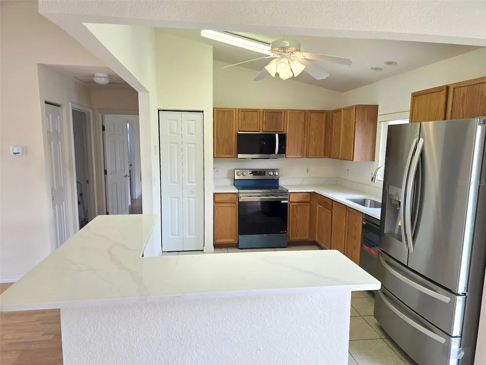 Discover this charming 2-bedroom, 2-bath home with a 2-CAR GARAGE in the desirable Del Webb Spruce Creek Golf And Country Club! Priced attractively, this home boasts a 2023 ROOF and A/C, LAMINATE FLOORING throughout most of the living areas, TILE in wet spaces, and carpeted guest bedroom. The kitchen has been updated to include QUARTZ COUNTER TOPS and BRAND NEW HIGH-END LG STAINLESS STEEL APPLIANCES Enjoy outdoor living on the expansive back patio featuring a roll-out shade. There is a SCREEN ROOM LANAI that has been ordered with a hard roof and screened in sides. Residents of Del Webb Spruce Creek enjoy abundant amenities, including two championship golf courses, indoor and outdoor pools, a state-of-the-art fitness center with classes, pickleball, softball, and more, all for a low HOA fee. Conveniently located minutes from Belleview's restaurants, The Villages' Spanish Springs Town Square, and under 30 minutes from Ocala's extensive shopping and entertainment. This value-priced home offers a fantastic opportunity to personalize and make it your own. Get an exclusive look at this incredible home! Watch our video on the Homes Around The Villages YouTube Channel, https://youtu.be/GMyKoR7ZCGc?si=aJoXSOXunDmonev7.