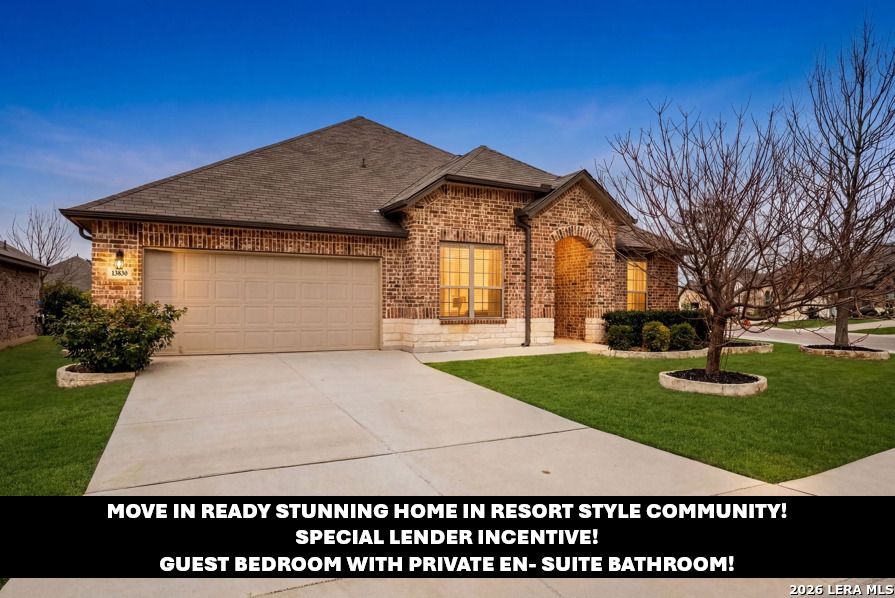 SPECIAL LENDER INCENTIVE AVAILABLE! Stunning MOVE-IN-READY brick home located in a GATED RESORT-STYLE community filled with incredible amenities. This beautifully maintained home offers quality construction, thoughtful design, and exceptional comfort, featuring 9-foot ceilings, an open-concept floor plan, and abundant natural light that create a bright and welcoming atmosphere ideal for both everyday living and entertaining. As you step inside, you are greeted by tall 9-foot ceilings and a spacious open layout that immediately makes the home feel inviting and comfortable. The main living areas feature beautiful tile flooring, while the carefully designed layout includes wider hallways and doors, no interior steps, and low-pile carpet, offering convenience and accessibility for a variety of lifestyles. The open-concept design flows seamlessly into the kitchen and dining areas, creating the perfect space for gatherings and daily living. The kitchen is both stylish and functional, featuring gas cooking, a large island, energy-efficient appliances, a spacious pantry, and plenty of kitchen cabinets providing abundant storage. The layout connects effortlessly to the separate dining area and bright living room, making the entire space feel open, connected, and perfect for entertaining. Located at the front of the home for added privacy, the guest bedroom includes a private en-suite full bathroom and a spacious walk-in closet, making it ideal for multigenerational living or comfortable accommodations for guests. An additional flexible room can easily serve as a home office, study, or hobby space, providing versatility to suit your needs. The primary bedroom is located at the back of the home for maximum privacy and features its own private en-suite bathroom, beautiful tile flooring with no carpet, abundant natural light, and a spacious layout. The en-suite bathroom includes a large walk-in shower, double vanity sinks, a private toilet area, and a generous walk-in closet. Step outside and enjoy the large covered patio and porch, complete with a built-in gas connection for grilling - no propane tanks required. The backyard features a level yard, sprinkler system, and a comfortable outdoor living space perfect for relaxing or entertaining guests. Additional highlights include fiber optic high-speed internet access, a well-equipped utility room with a utility sink, water softener, gutters, a garage door opener, and a finished garage. Residents enjoy spectacular resort-style community amenities just minutes away, including a large lap pool, water slides, a splash pad for kids, a basketball court, tennis courts, a stocked fishing pond with a pier, a fitness center, a gym, a community room, an outdoor pavilion, playgrounds, and beautiful recreational spaces. This exceptional home offers the perfect combination of comfort, accessibility, modern design, and resort-style living in one of the area's most desirable communities.