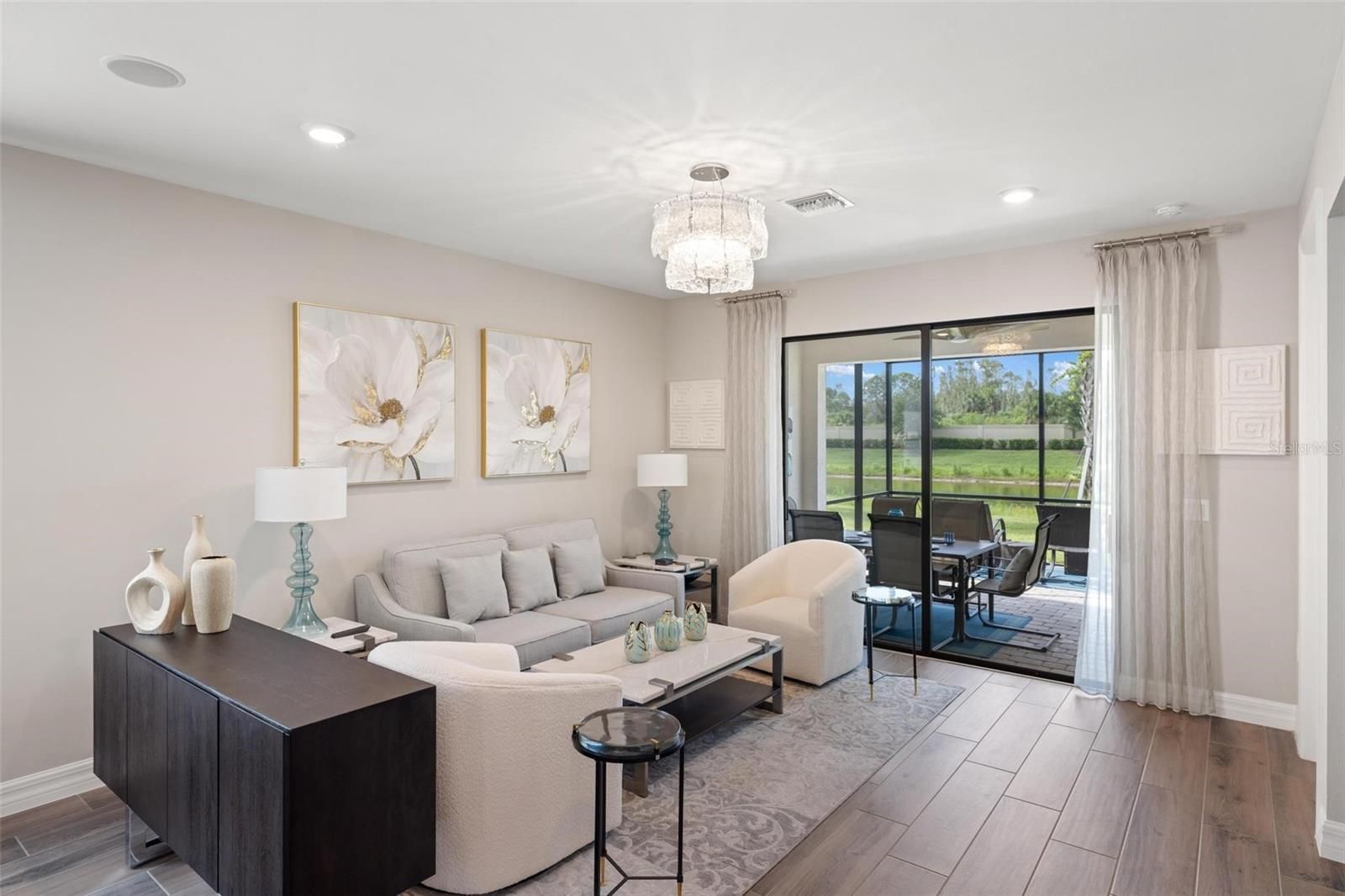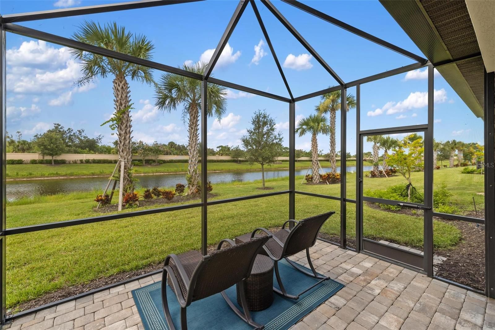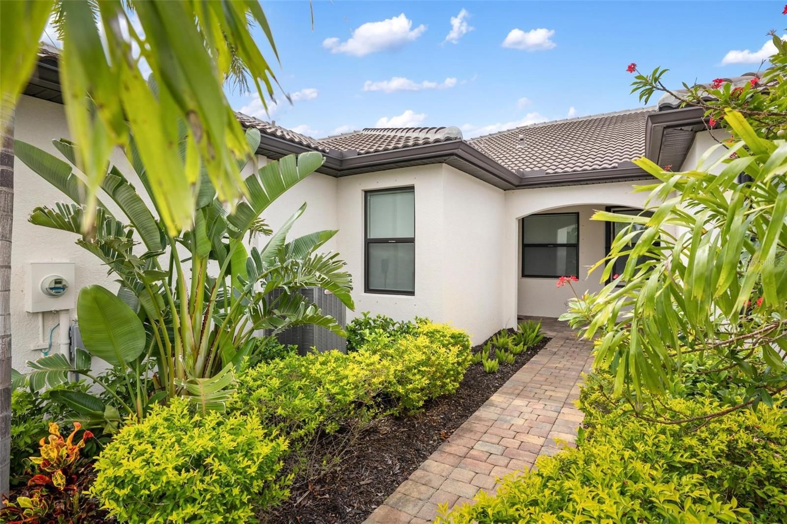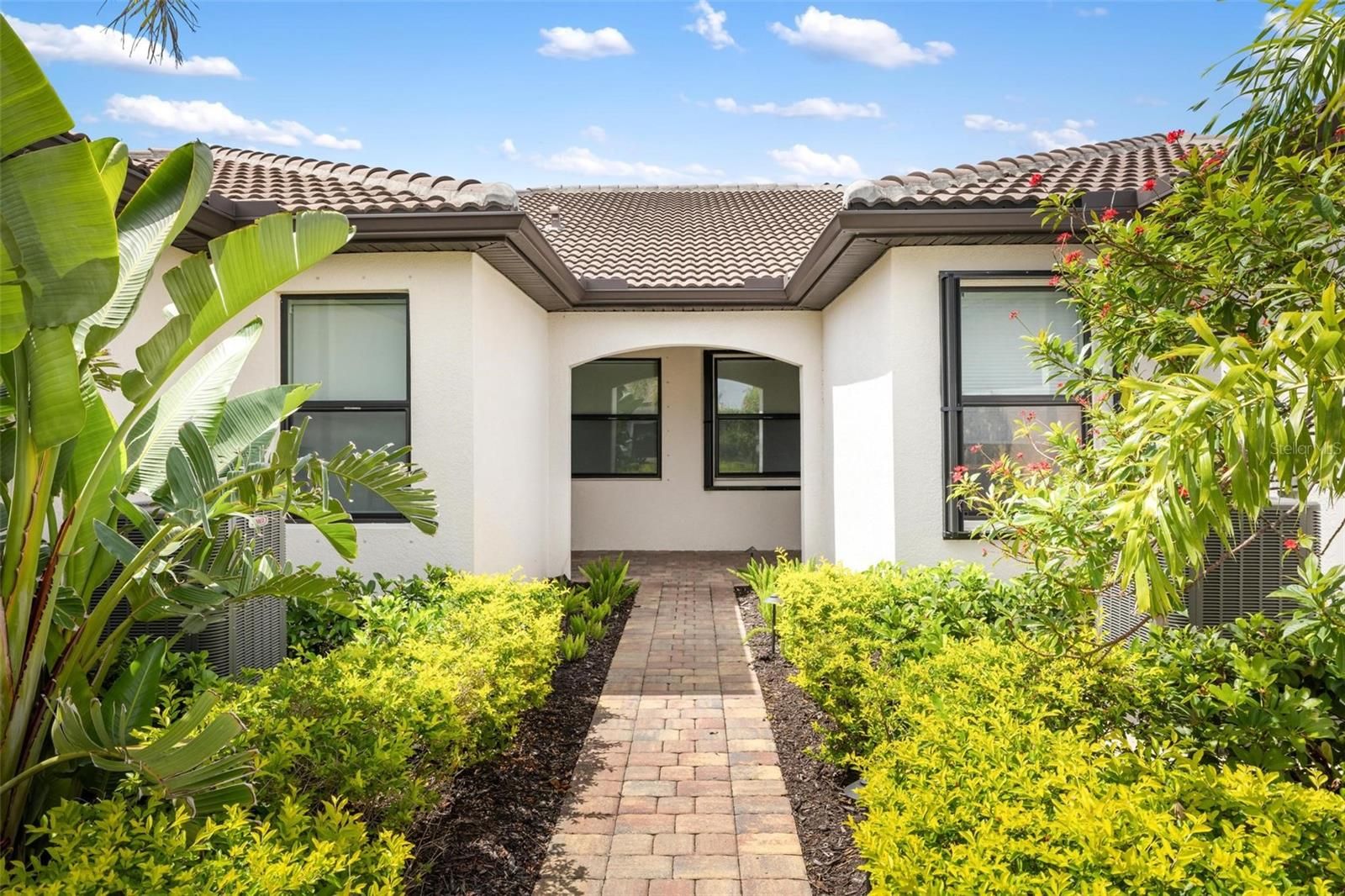 Lakefront Living Elevated — Where Every Upgrade Tells a Story. Wake up to tranquil lake views and end the day on your oversized pavered lanai, soaking in the serenity of your private oasis. Welcome to IslandWalk at the West Villages, a resort-style, 24/7 manned gated community, where this impeccably upgraded 2022 Mediterranean-style Cascadia Villa stands apart as a rare gem in a neighborhood full of standard finishes. From the moment you arrive, this home captivates with its barrel tile roof, widened pavered driveway and walkway, lush tropical landscaping, and peaceful waterfront views. Inside, top-tier builder upgrades meet designer flair across 1,600+ sq ft of thoughtfully curated living space featuring 2 bedrooms, 2 bathrooms, and a versatile office/flex room. Step into an open-concept layout grounded by premium wood-look, wide-plank, extra-long tile flooring—a statement in both durability and design. Designer lighting and fans enhance each room, casting a warm glow on the home’s clean lines and elevated finishes. Throughout, you’ll find 8-foot doors, custom blinds, and window treatments that add both elegance and privacy. The chef’s kitchen is the heart of the home, showcasing upgraded white cabinetry, quartz countertops, sleek stainless steel appliances, and a stunning glass tile backsplash. The expansive breakfast bar invites conversation and casual dining, seamlessly flowing into the open living and dining areas—ideal for entertaining or everyday living. The split-bedroom layout offers enhanced privacy. Your owner’s suite is a tranquil retreat featuring dual closets with custom built-ins for optimal organization, and storage, and a spa-like en-suite with dual sinks, upgraded cabinetry, and an oversized frameless glass walk-in shower with bench seating. Additional features include a dedicated laundry room with storage, built-in speaker system, upgraded 5+ inch baseboards, grounded electrical panel for surge protection, and an insulated attic with pull-down ladder and added storage space. The garage has been thoughtfully upgraded with lifetime flooring, built-in storage closets, and a gardener’s sink. Step outside to your oversized pavered lanai with a privacy wall and peaceful waterfront views—your own private oasis for relaxing or entertaining. IslandWalk is known for its vibrant, active lifestyle with world-class amenities including multiple resort and lap pools, two fitness centers, 12 pickleball courts, har-tru tennis courts, bocce ball, community garden, covered dining area with BBQ grills, fire pits, basketball, a dog park, playground, and a clubhouse with a full-time Lifestyle Director. HOA fees cover lawn care, tree trimming, mulch, high-speed internet, basic cable with DVRs, and on-site management, providing incredible value. Located near the exciting new Wellen Park Downtown and surrounded by lakes, preserves, and Gulf Coast beaches—this is Florida living at its finest. Don’t miss your chance to call this incredible home yours—schedule your private tour today!