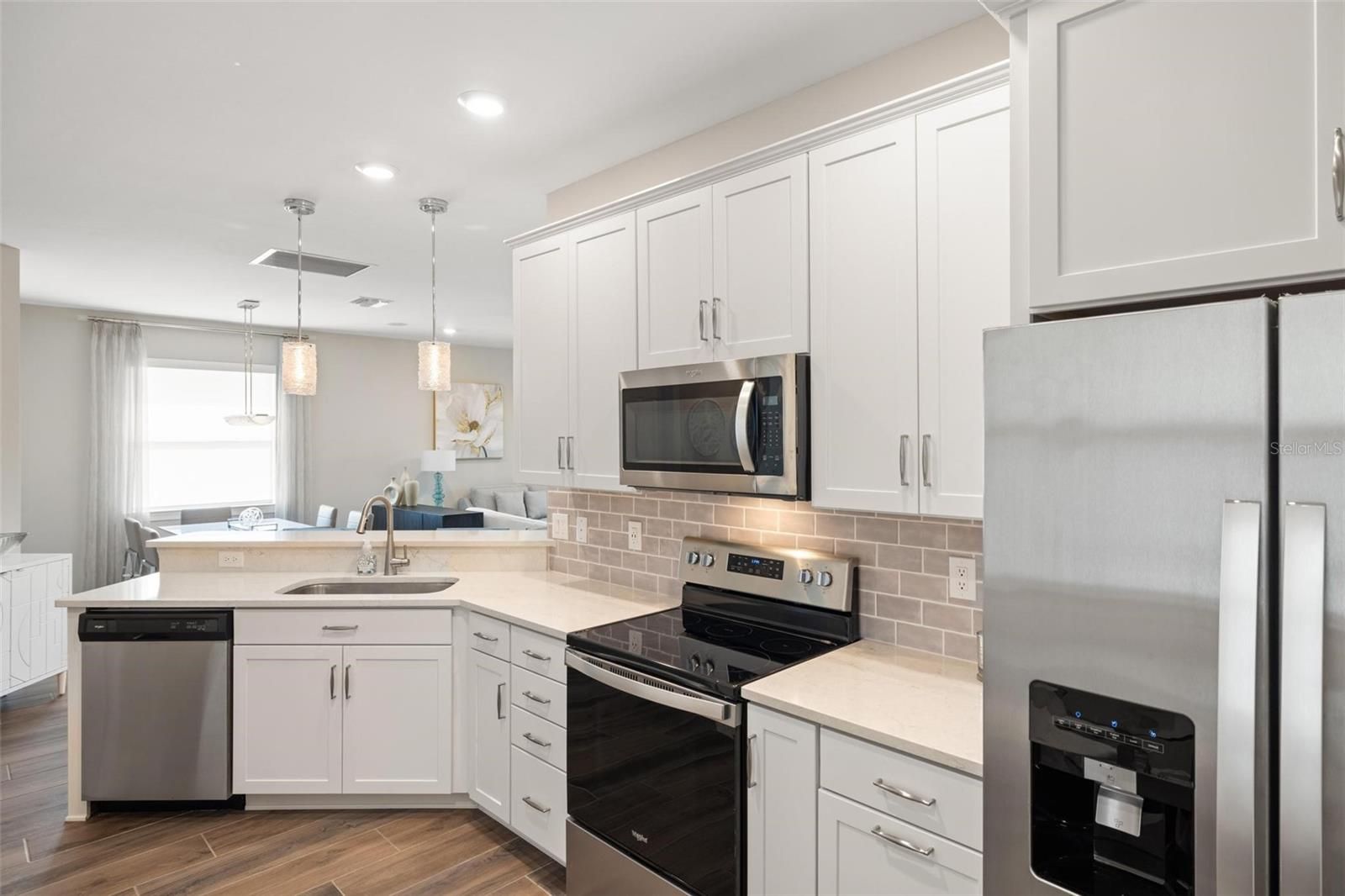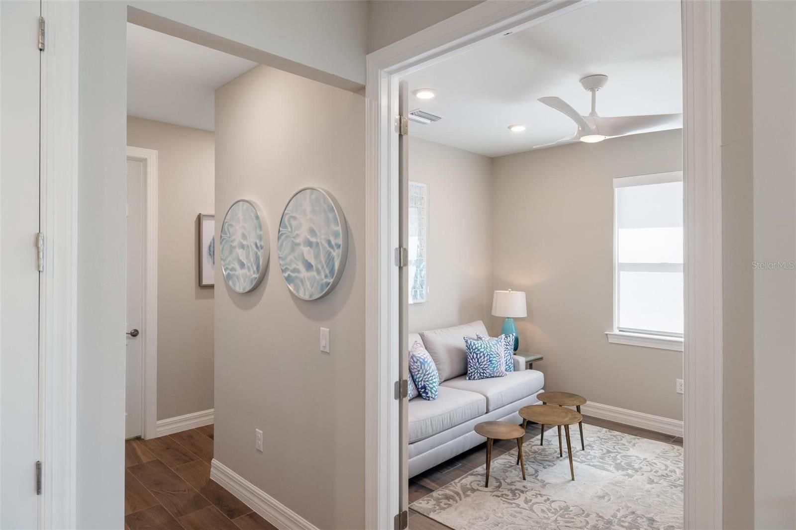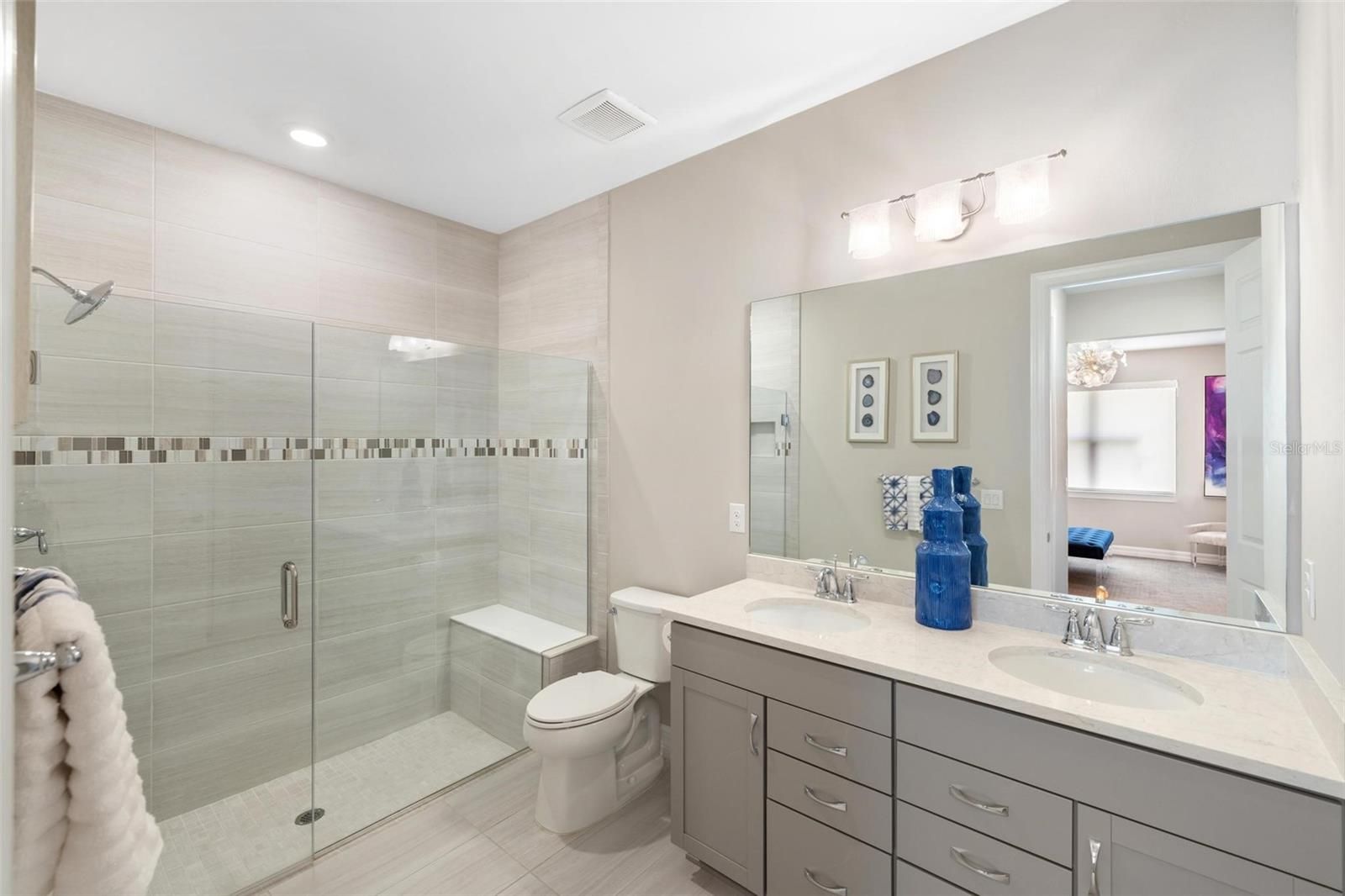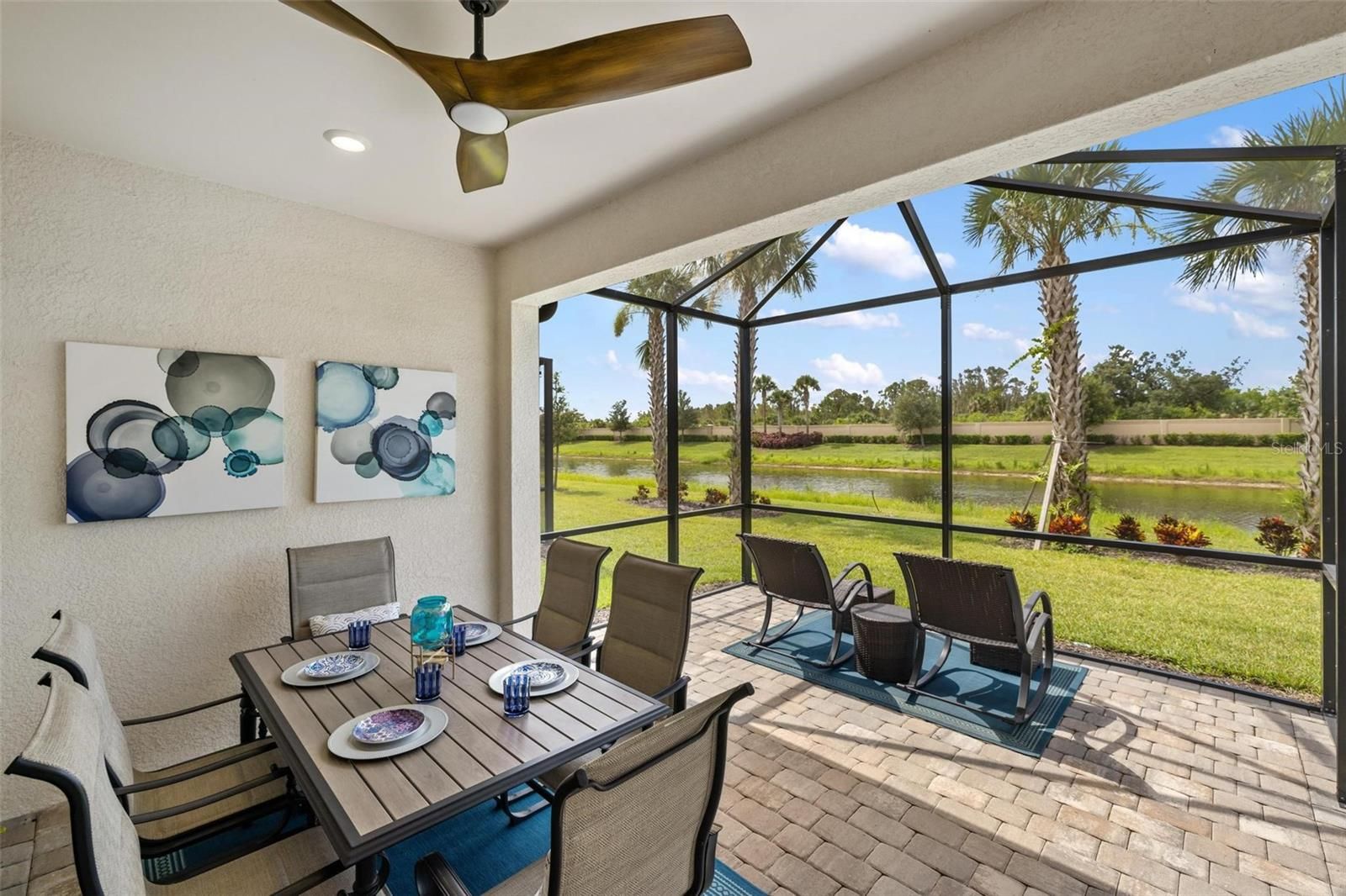 Lakefront Living Elevated — Where Every Upgrade Tells a Story. Wake up to tranquil lake views and end the day on your oversized pavered lanai, soaking in the serenity of your private oasis. Welcome to IslandWalk at the West Villages, a resort-style, 24/7 manned gated community, where this impeccably upgraded 2022 Mediterranean-style Cascadia Villa stands apart as a rare gem in a neighborhood full of standard finishes. From the moment you arrive, this home captivates with its barrel tile roof, widened pavered driveway and walkway, lush tropical landscaping, and peaceful waterfront views. Inside, top-tier builder upgrades meet designer flair across 1,600+ sq ft of thoughtfully curated living space featuring 2 bedrooms, 2 bathrooms, and a versatile office/flex room. Step into an open-concept layout grounded by premium wood-look, wide-plank, extra-long tile flooring—a statement in both durability and design. Designer lighting and fans enhance each room, casting a warm glow on the home’s clean lines and elevated finishes. Throughout, you’ll find 8-foot doors, custom blinds, and window treatments that add both elegance and privacy. The chef’s kitchen is the heart of the home, showcasing upgraded white cabinetry, quartz countertops, sleek stainless steel appliances, and a stunning glass tile backsplash. The expansive breakfast bar invites conversation and casual dining, seamlessly flowing into the open living and dining areas—ideal for entertaining or everyday living. The split-bedroom layout offers enhanced privacy. Your owner’s suite is a tranquil retreat featuring dual closets with custom built-ins for optimal organization, and storage, and a spa-like en-suite with dual sinks, upgraded cabinetry, and an oversized frameless glass walk-in shower with bench seating. Additional features include a dedicated laundry room with storage, built-in speaker system, upgraded 5+ inch baseboards, grounded electrical panel for surge protection, and an insulated attic with pull-down ladder and added storage space. The garage has been thoughtfully upgraded with lifetime flooring, built-in storage closets, and a gardener’s sink. Step outside to your oversized pavered lanai with a privacy wall and peaceful waterfront views—your own private oasis for relaxing or entertaining. IslandWalk is known for its vibrant, active lifestyle with world-class amenities including multiple resort and lap pools, two fitness centers, 12 pickleball courts, har-tru tennis courts, bocce ball, community garden, covered dining area with BBQ grills, fire pits, basketball, a dog park, playground, and a clubhouse with a full-time Lifestyle Director. HOA fees cover lawn care, tree trimming, mulch, high-speed internet, basic cable with DVRs, and on-site management, providing incredible value. Located near the exciting new Wellen Park Downtown and surrounded by lakes, preserves, and Gulf Coast beaches—this is Florida living at its finest. Don’t miss your chance to call this incredible home yours—schedule your private tour today!