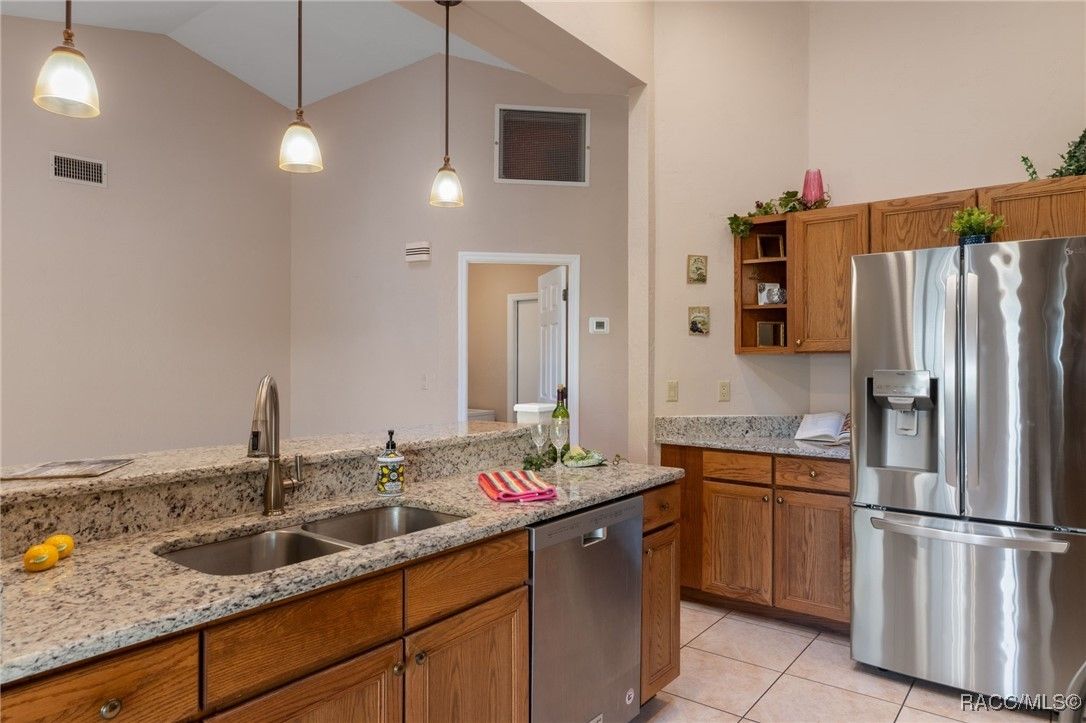 - Eat-in Kitchen, High Ceilings, Primary Suite, Split Bedrooms, Separate Shower, Solid Surface Counters, Vaulted Ceiling(s), Walk-In Closet(s), WoodCabinets, Window Treatments, First Floor Entry