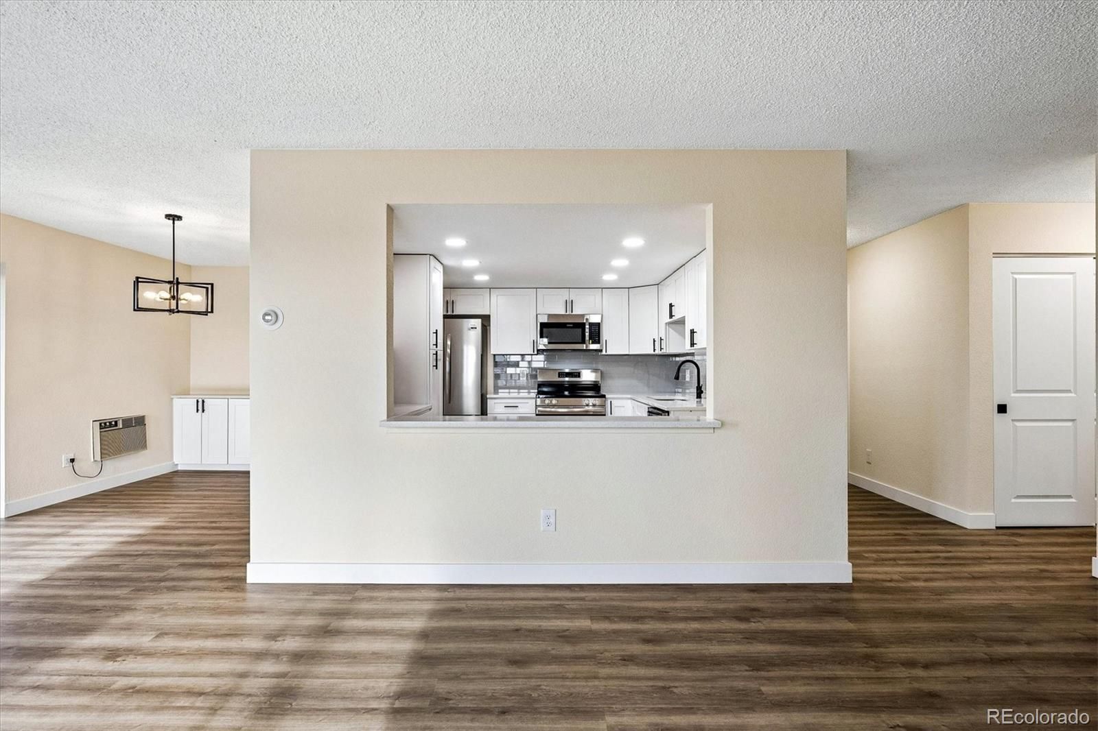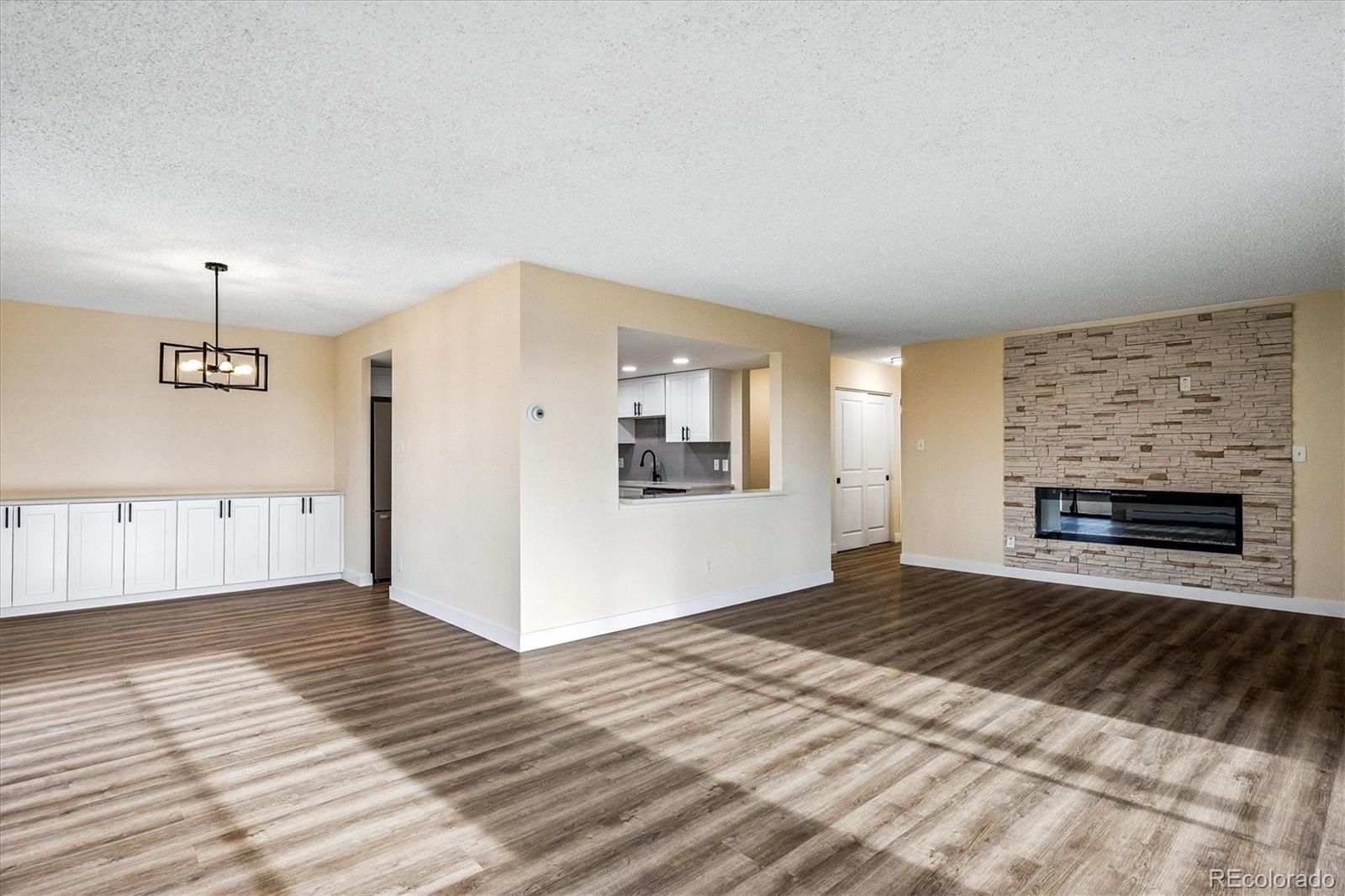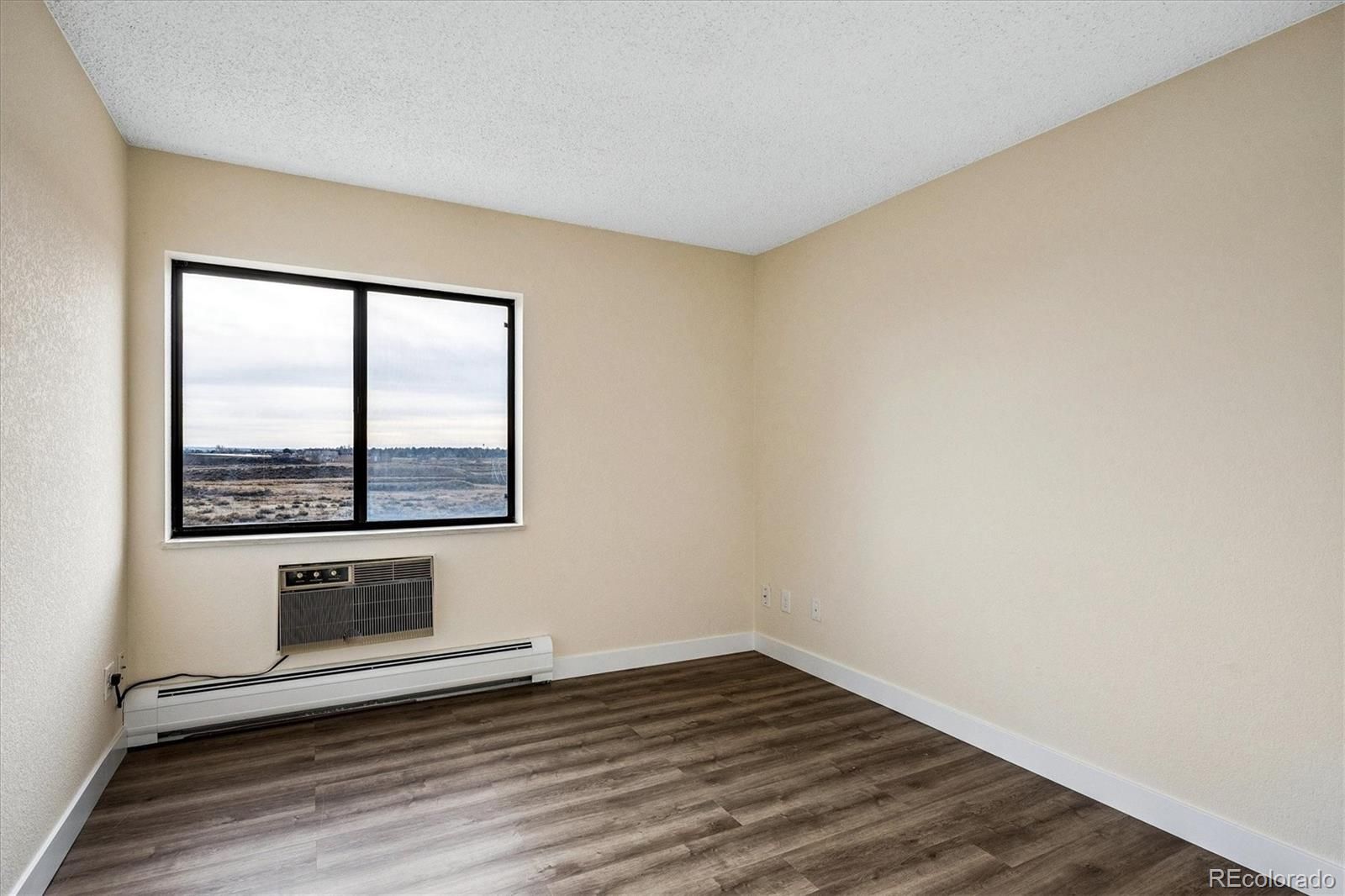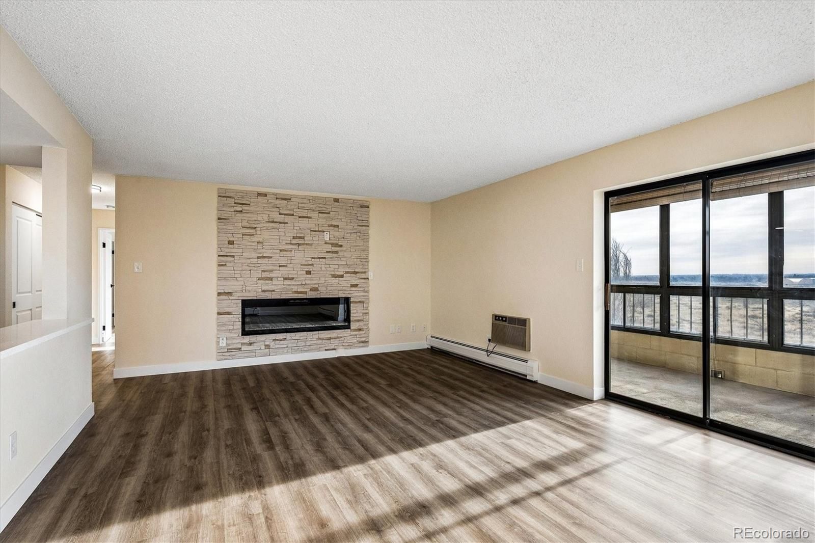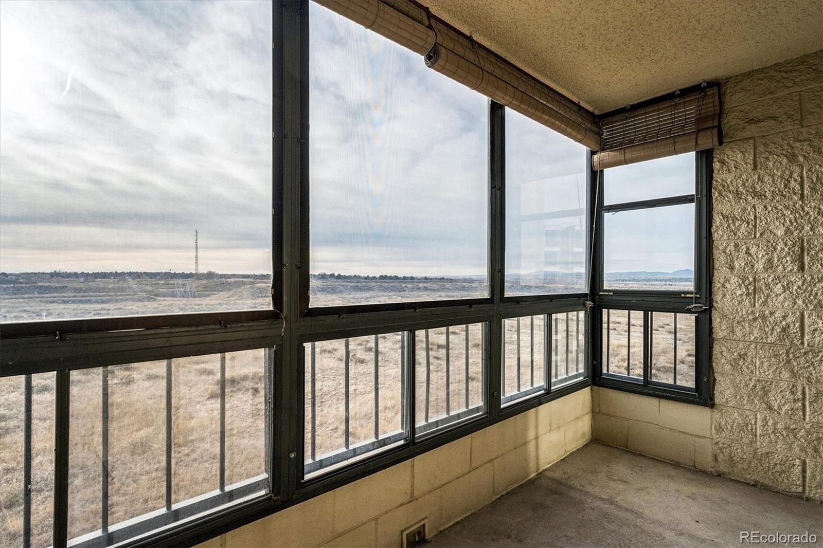 Newly remodeled in January of 2026. FANTASTIC MOUNTAIN VIEWS off two separate balconies, one of which is enclosed. Private end-unit condo w/ views of DTC and mountains w/ private land to the east for serenity. Enjoy all that Heather Gardens has to offer, including a golf course, swimming pools and tennis courts PLUS the private pickleball courts and pool for Seville residents. Updates to unit include: brand new Coretec Pro Plus Copano Oak Vinyl Plank flooring throughout unit; brand new White Shaker Cabinets in fully remodeled kitchen; new canned lights in kitchen; brand new quartz counters in kitchen + in dining area and bathrooms; brand new stainless steel appliances including refrigerator, dishwasher, stove/range/oven & microwave oven; classic subway tile backsplash in kitchen; new sinks throughout plus new garbage disposal; new light fixtures throughout unit; new electric fireplace w/ floor-to-ceiling stone enhances great room; wonderful bathroom tile and glass shower enclosure; new mirrors and cabinetry hardware; buffet-style cabinetry in dining area; new white panel doors throughout w/ new hardware; new wall texture (knockdown) really enhances the remodel. The in-unit laundry has washer/dryer hook-ups. There are a total of three room air conditioner units in the condo. An enclosed lanai helps you enjoy colder weather, plus an open balcony to take in summer evenings and wonderful mountain views. Secure parking space #57 w/ one remote. The condo was just painted w/ Sherwin Williams "Crisp Linen" paint, with white paint for trim baseboard and doors. Include this unit in your showings to see all we've done and mostly to feel the privacy and experience the amazing views!
