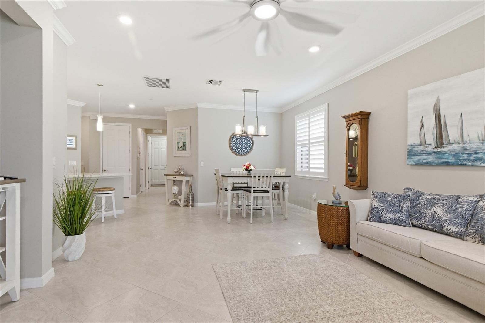 - Crown Molding, High Ceilings, Living/Dining Room, Open Floorplan, Main Level Primary, Smart Home, Solid Surface Counters, Solid-Wood Cabinets, Split Bedrooms, Stone Counters, Thermostat, Walk-In Closet(s), Window Treatments