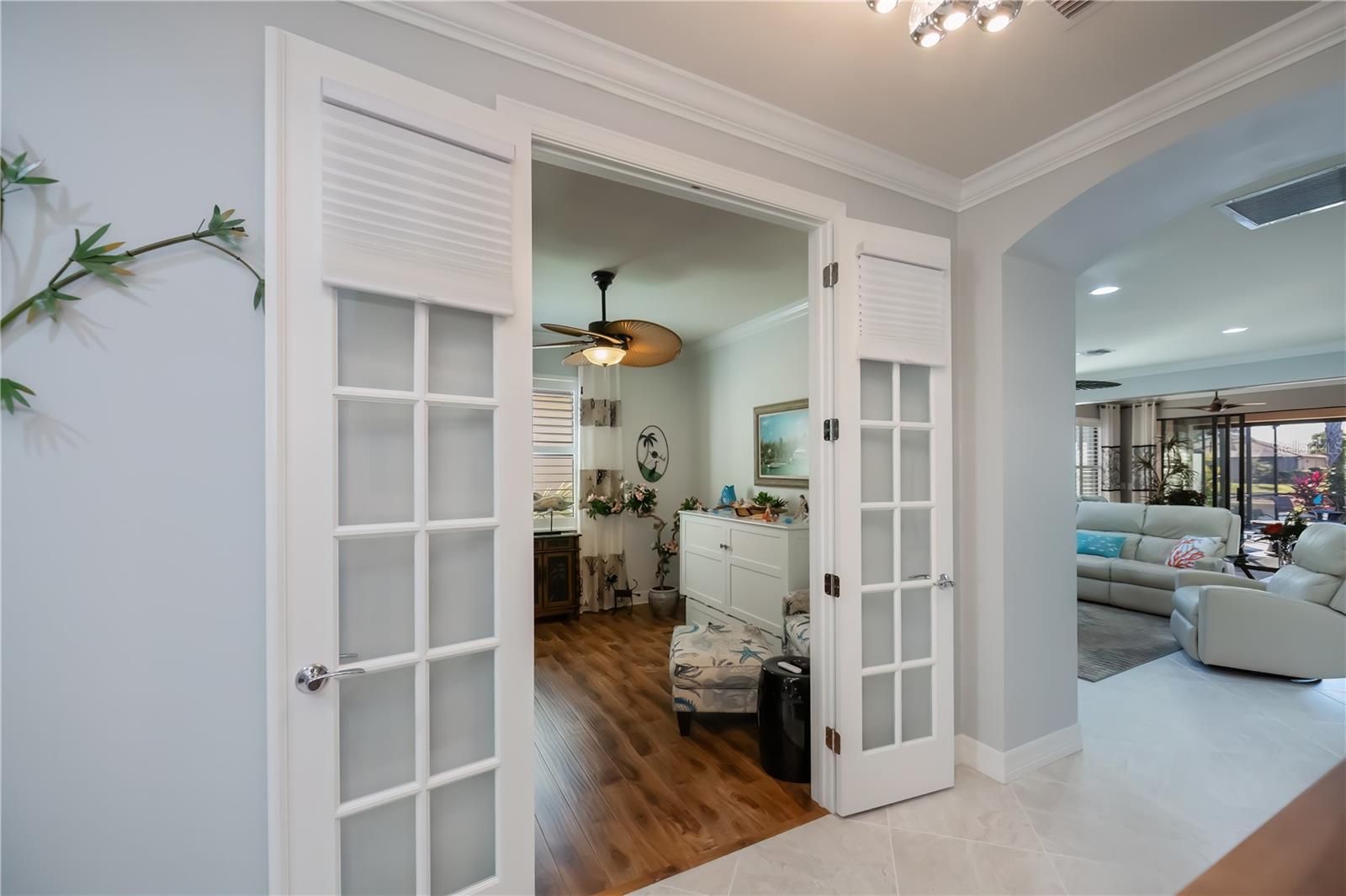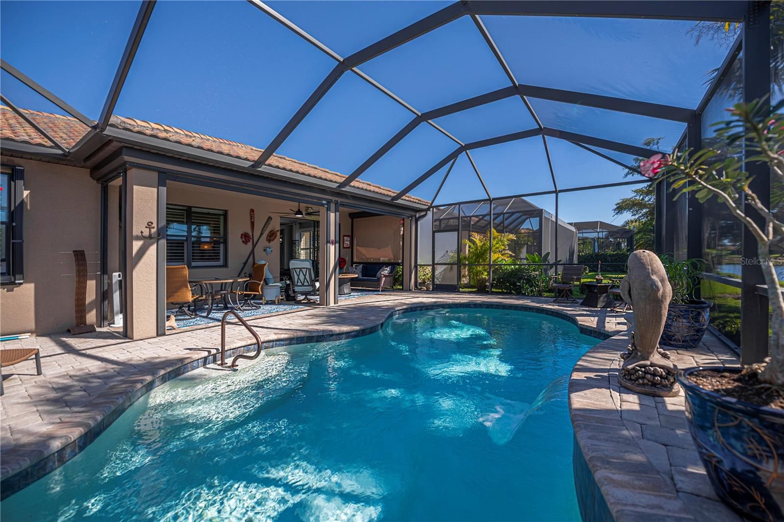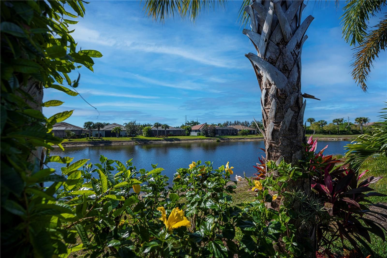 Welcome to Your Floridian Retreat--discover this beautifully maintained Summerwood model in the highly sought-after and amenity-rich community of IslandWalk—this home is thoughtfully updated and finished with exceptional quality throughout. From the moment you arrive, the paver driveway and walkway lead you to a striking glass front door, offering a preview of the elegance inside. Step into freshly repainted interior with crisp walls and baseboards as well as high ceilings that create a bright, inviting atmosphere. The open floor plan flows effortlessly, beginning with a spacious living room anchored by an electric fireplace—a true showpiece. The chef’s kitchen is the heart of the home, featuring a large quartz-topped island and newer appliances including a stove, microwave, and refrigerator. Just off the kitchen, the sunroom provides a cheerful space to enjoy morning coffee or unwind with a good book. The primary suite offers comfort and sophistication with engineered hardwood floors and a custom walk-in closet. The ensuite bath includes dual sinks, granite countertops, a garden tub, and a separate shower. A versatile den with Murphy bed adds flexibility—perfect for a home office, creative studio, or occasional guest room. Step outside to your private oasis: a large covered porch (measuring 9'x25') and screened lanai (measuring 32'x40') overlooking peaceful lake views, complete with a sparkling saltwater pool (with recently replaced salt cell) and a tranquil waterfall feature. Storm Smart power screens and accordion shutters provide added peace of mind. Additional highlights of the home include an extended 20x30 tandem garage with epoxy floors and built-in storage room, as well as a thoughtfully-designed laundry room featuring extensive custom cabinetry and a two-year-old washer and dryer. The home also comes with a current and transferrable Home Choice warranty for added peace of mind. With ceramic tile and engineered hardwood throughout—no carpet in sight!--maintaining this home is a breeze. IslandWalk offers true resort-style living with two geothermal pools, a lap pool, fitness center, pickleball and tennis courts, dog park, and more. This home blends luxury, functionality, and comfort—ready for you to move right in and embrace the Florida lifestyle.