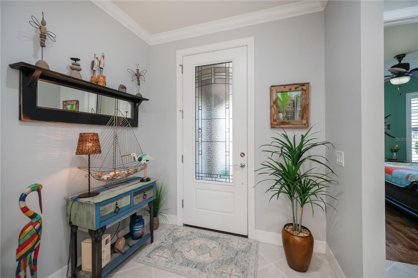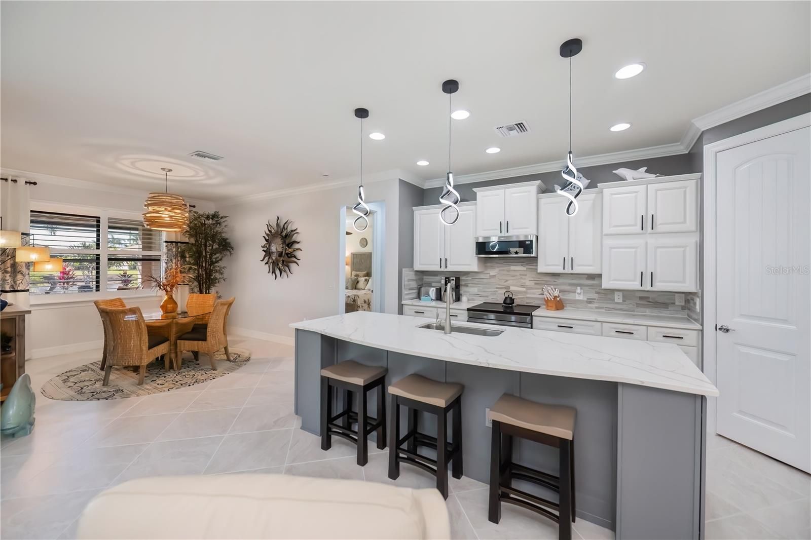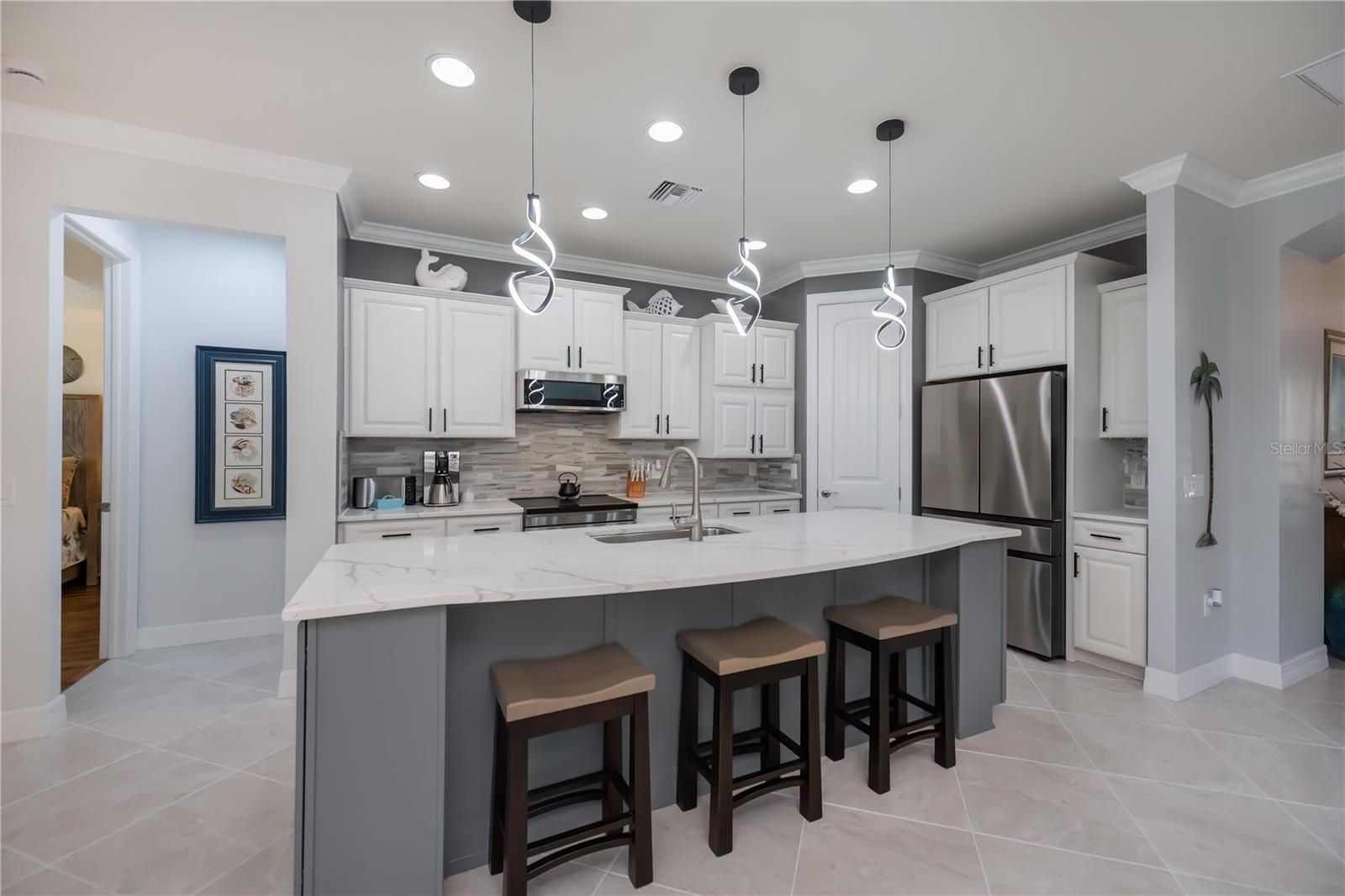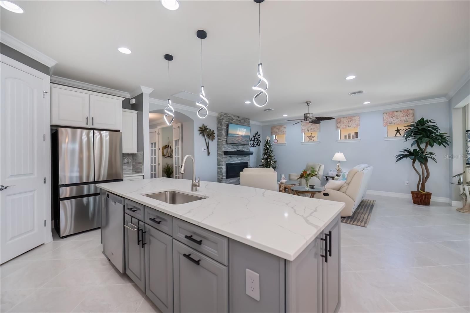 Welcome to Your Floridian Retreat--discover this beautifully maintained Summerwood model in the highly sought-after and amenity-rich community of IslandWalk—this home is thoughtfully updated and finished with exceptional quality throughout. From the moment you arrive, the paver driveway and walkway lead you to a striking glass front door, offering a preview of the elegance inside. Step into freshly repainted interior with crisp walls and baseboards as well as high ceilings that create a bright, inviting atmosphere. The open floor plan flows effortlessly, beginning with a spacious living room anchored by an electric fireplace—a true showpiece. The chef’s kitchen is the heart of the home, featuring a large quartz-topped island and newer appliances including a stove, microwave, and refrigerator. Just off the kitchen, the sunroom provides a cheerful space to enjoy morning coffee or unwind with a good book. The primary suite offers comfort and sophistication with engineered hardwood floors and a custom walk-in closet. The ensuite bath includes dual sinks, granite countertops, a garden tub, and a separate shower. A versatile den with Murphy bed adds flexibility—perfect for a home office, creative studio, or occasional guest room. Step outside to your private oasis: a large covered porch (measuring 9'x25') and screened lanai (measuring 32'x40') overlooking peaceful lake views, complete with a sparkling saltwater pool (with recently replaced salt cell) and a tranquil waterfall feature. Storm Smart power screens and accordion shutters provide added peace of mind. Additional highlights of the home include an extended 20x30 tandem garage with epoxy floors and built-in storage room, as well as a thoughtfully-designed laundry room featuring extensive custom cabinetry and a two-year-old washer and dryer. The home also comes with a current and transferrable Home Choice warranty for added peace of mind. With ceramic tile and engineered hardwood throughout—no carpet in sight!--maintaining this home is a breeze. IslandWalk offers true resort-style living with two geothermal pools, a lap pool, fitness center, pickleball and tennis courts, dog park, and more. This home blends luxury, functionality, and comfort—ready for you to move right in and embrace the Florida lifestyle.