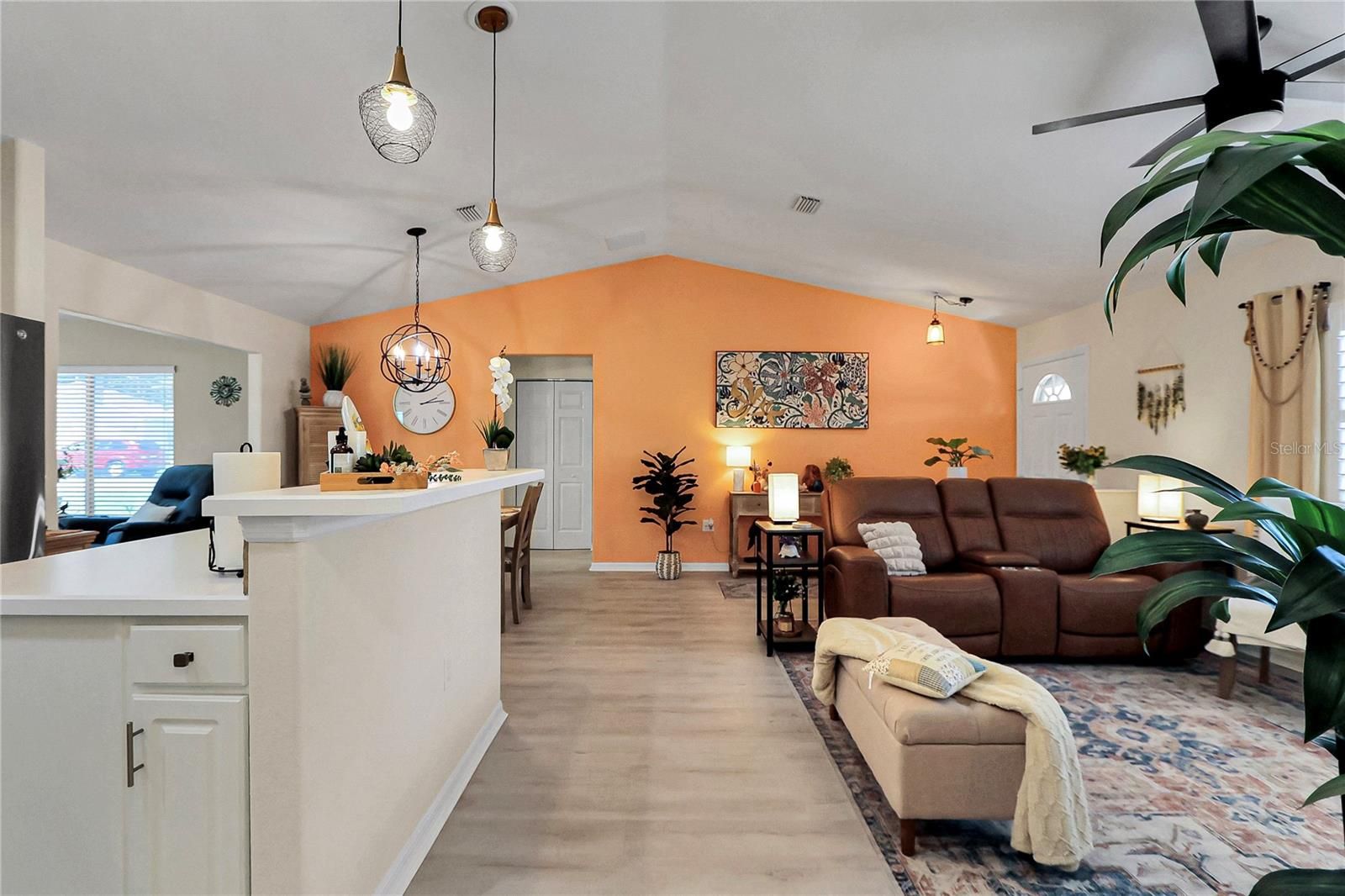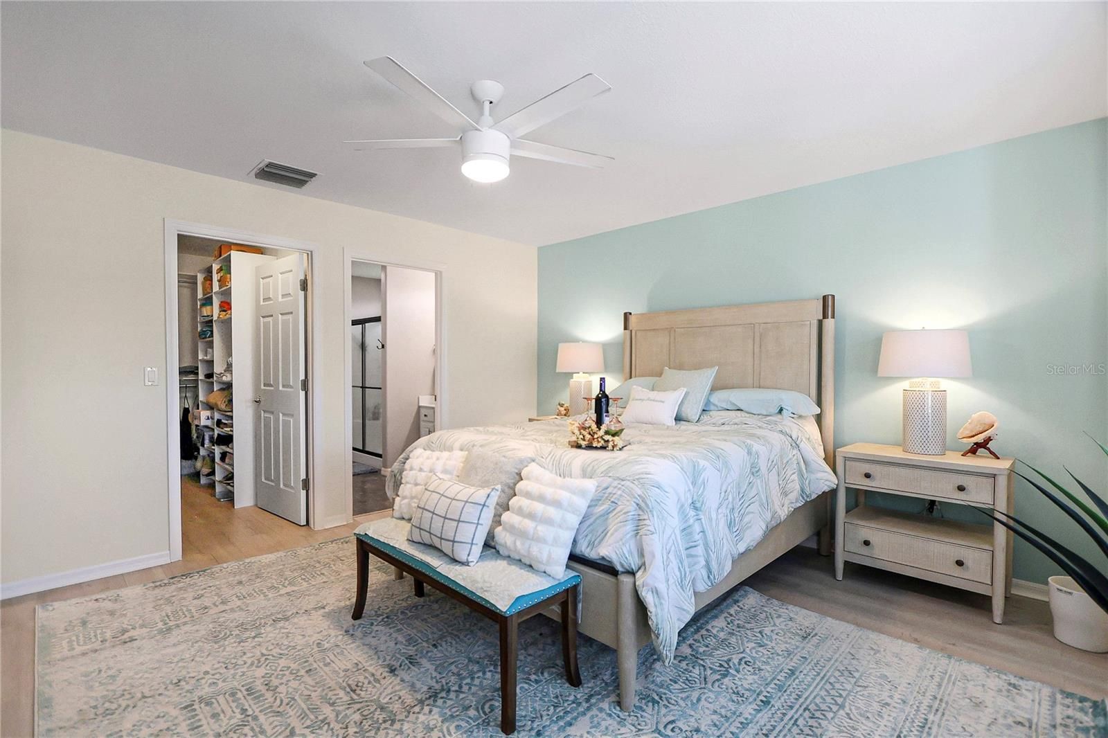 - Ceiling Fan(s), Crown Molding, Eat-in Kitchen, Kitchen/Family Room Combo, Living/Dining Room, Open Floorplan, Main Level Primary, Solid Surface Counters, Split Bedrooms, Thermostat, Walk-In Closet(s), Window Treatments