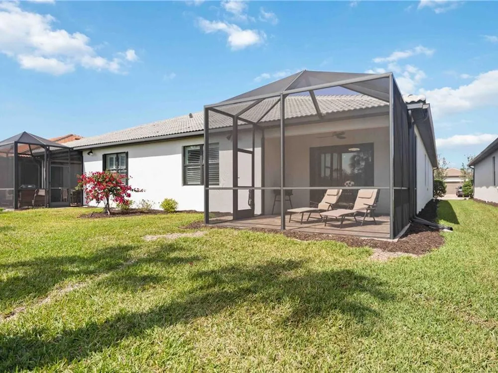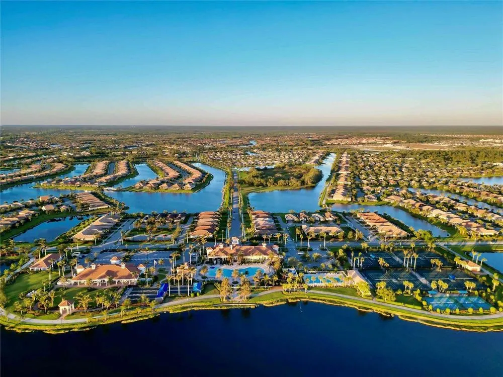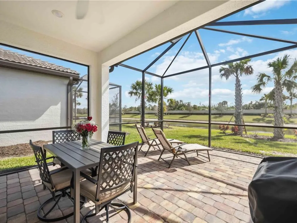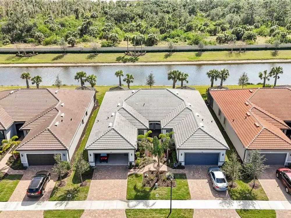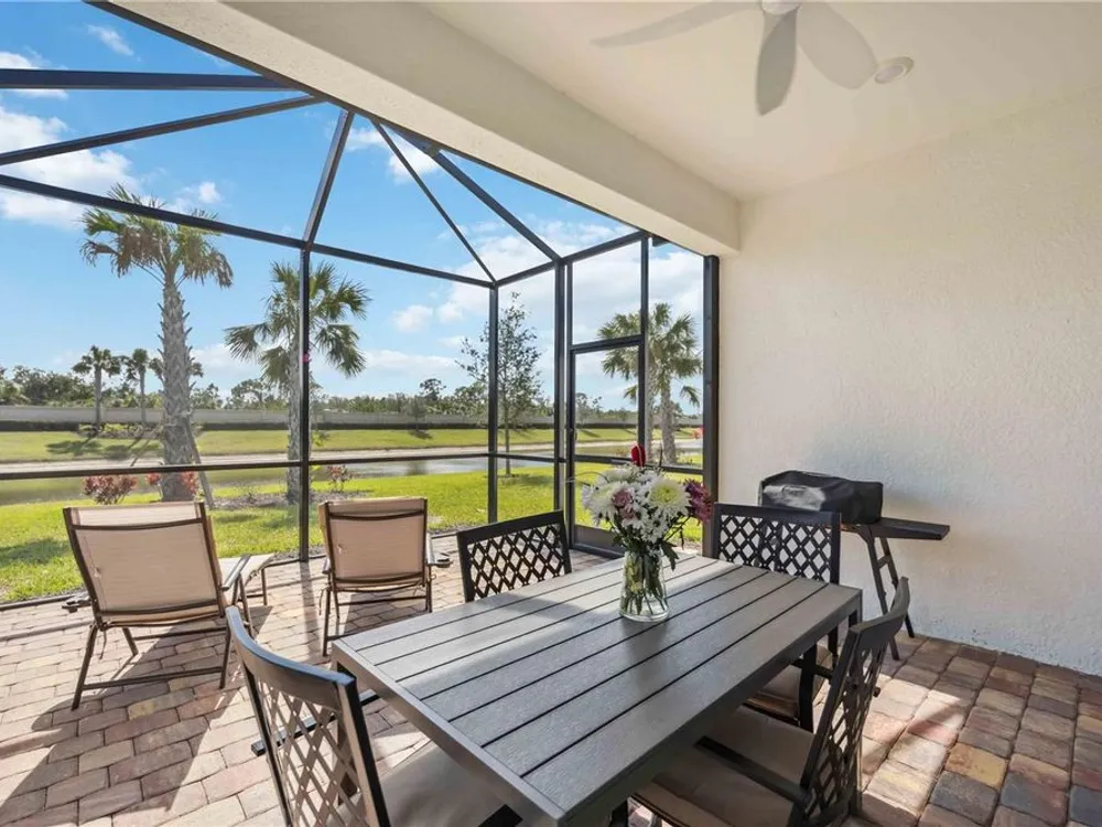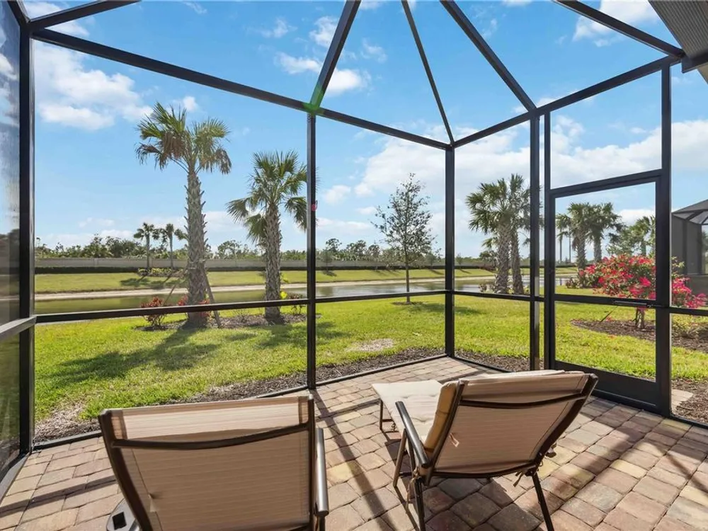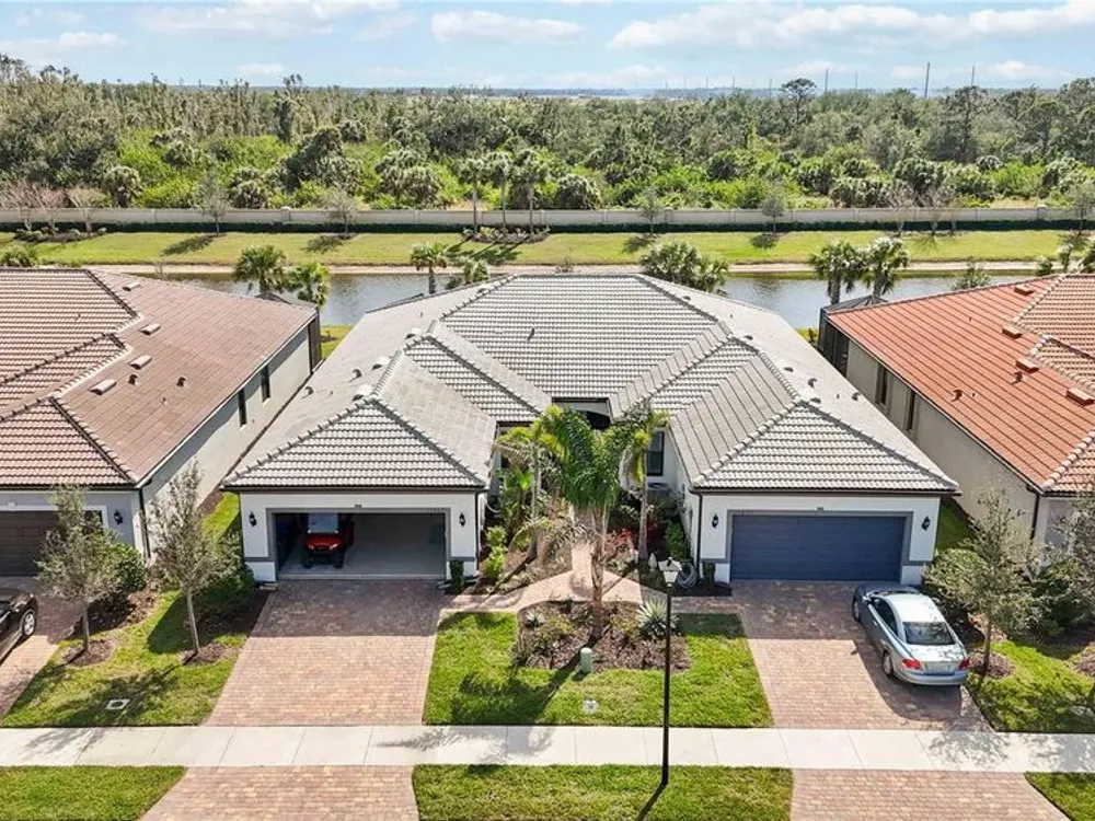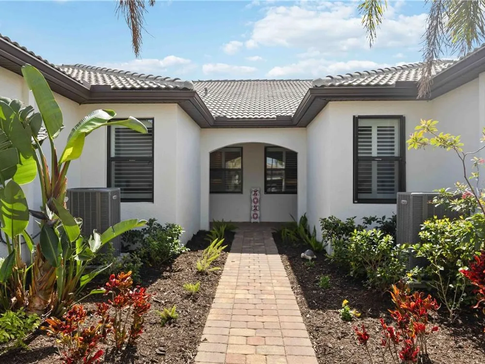 Peace of mind with IMPACT WINDOWS & DOORS! Built in 2021 and lightly lived in seasonally, with 1611 sqft, this Cascadia Villa features 2 bedrooms, 2 bathrooms, and a versatile flex room, offering an exquisite blend of comfort and style in a resort-style, maintenance-free community. From the moment you step inside, you'll be captivated by the villa’s bright and sun-filled living spaces, adorned with crown molding and custom plantation shutters for an elegant coastal feel. Large tile flooring flows seamlessly throughout the main areas, while the bedrooms boast upgraded plush carpet for ultimate comfort. Entertaining is effortless with a thoughtfully positioned gourmet kitchen that fosters interaction between hosts and guests. This well-designed space boasts 42” upgraded cabinets, quartz countertops, a stylish glass tile backsplash, and premium appliances, including an induction stove and sleek refrigerator. Under-cabinet lighting enhances the ambiance, while a breakfast bar provides additional seating. The spacious master suite is a serene oasis, featuring a tray ceiling, expansive windows with tranquil lake views, and a spa-like en-suite bath. Indulge in the luxury of double vanity sinks, a walk-in shower with a frameless glass surround, and a built-in bench for added relaxation. Designed for year-round enjoyment, the extended south-facing lanai offers breathtaking Florida sunsets over the lake—a perfect setting to relax and unwind. Built by DiVosta, this home includes IMPACT WINDOWS, DOORS and a tied-down tile roof, ensuring durability and peace of mind. Community Living: Islandwalk is a vibrant, friendly lifestyle community that offers an array of recreational amenities, including multiple pools, lap pools, a clubhouse with a full-time activities director, two fitness centers, 12 pickleball courts, har-tru tennis courts, bocce ball, two fire pits, a dog park, basketball, and playground. The monthly newsletter is packed with social events planned by a full-time activities director. Why wait… move in and let the fun begin! But don't forget your sunglasses, as the white sandy beach is just 9 miles away. To enjoy an afternoon of shopping or dining, hop on your bike or golf cart and head to the new Wellen Park Downtown, featuring an 80-acre lake with recreational activities for everyone! The community of Islandwalk boasts the LOWEST CDD FEE in all of Wellen Park! HOA fees in Islandwalk are a great value and include: lawn care, tree trimming, mulch, high-speed internet, basic cable with 3 DVR boxes, all the resort-style amenities, on-site management seven days a week, and a full-time Lifestyle Director. Furniture can be purchased under a separate contract.