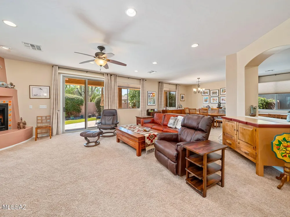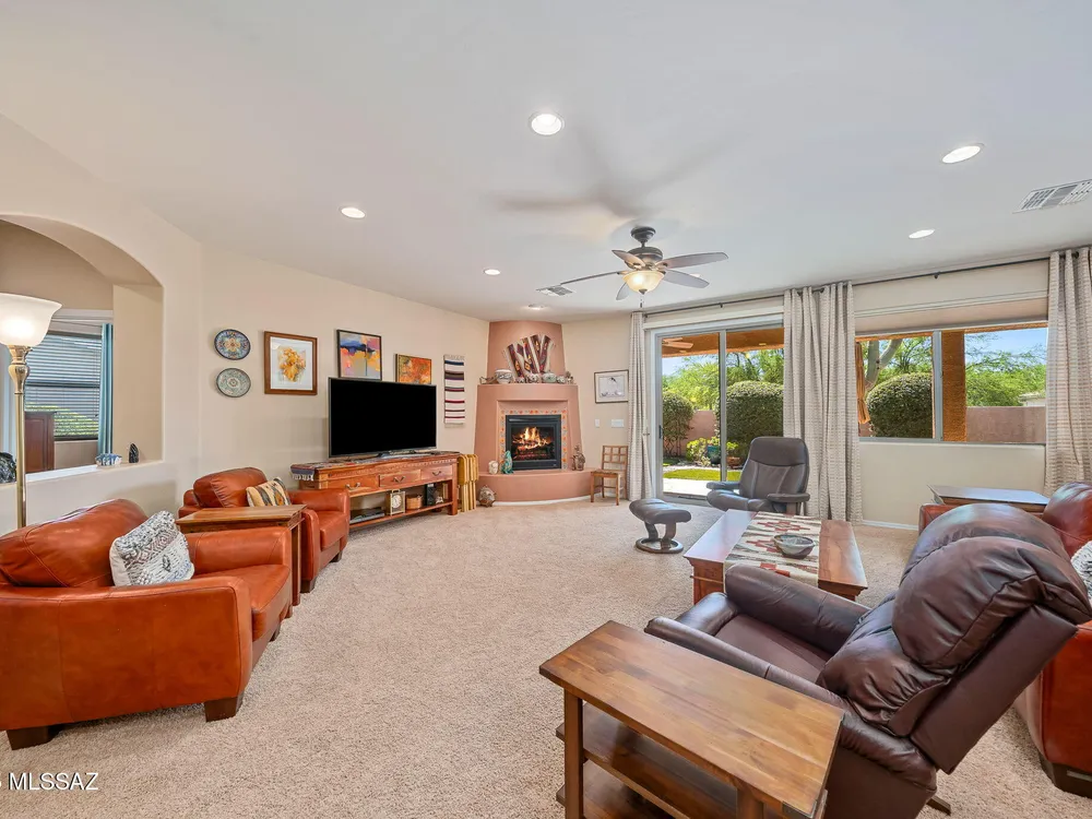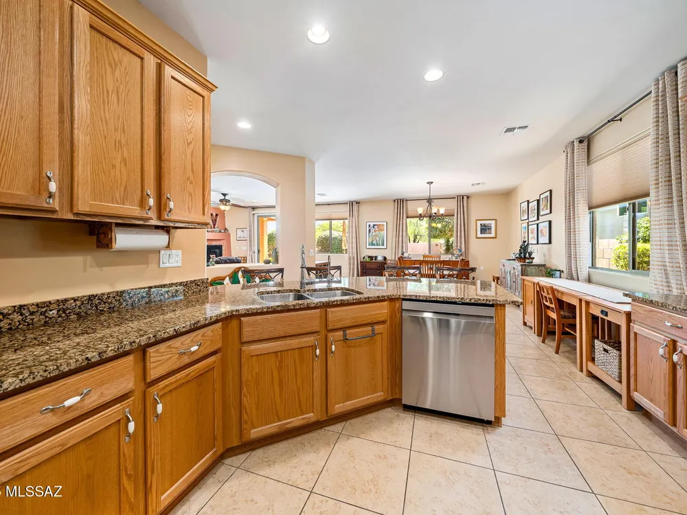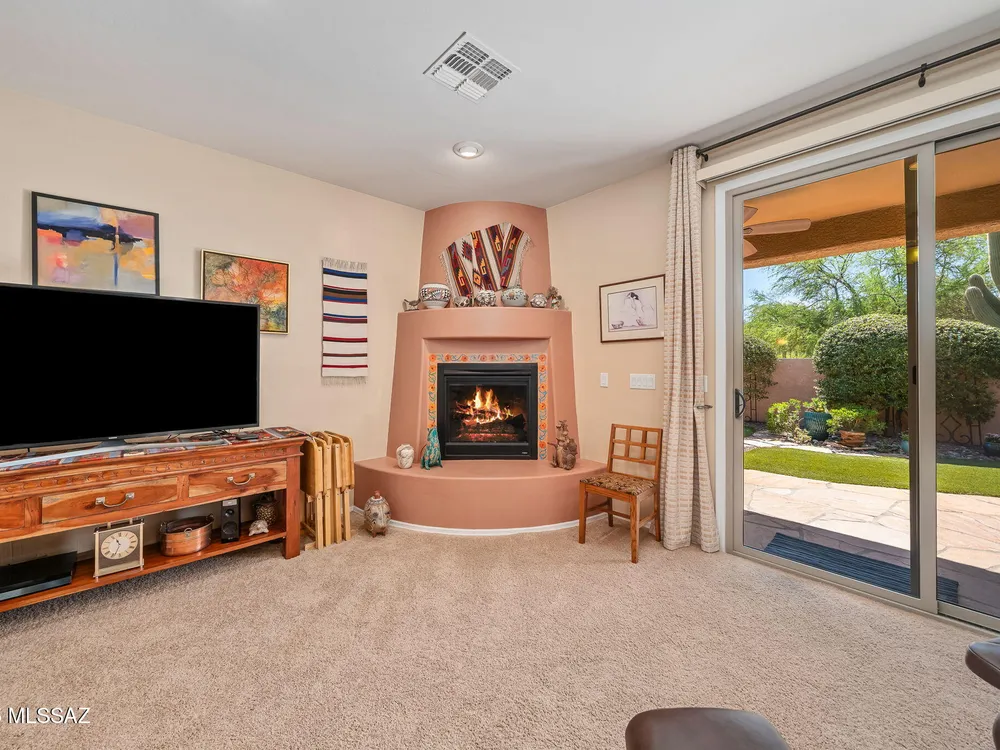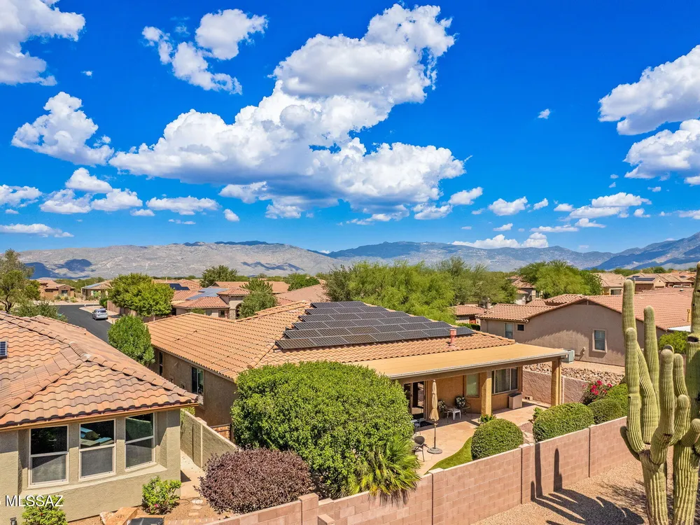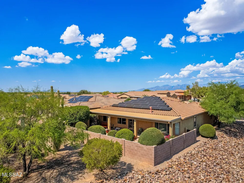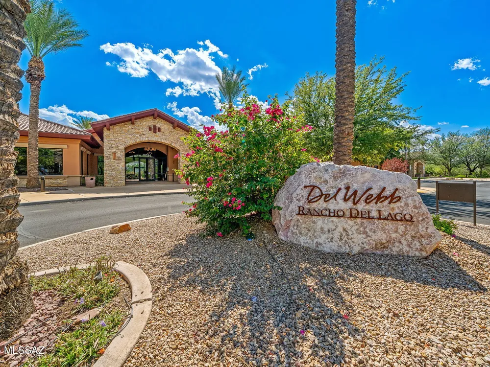 Inviting, airy home looks out to open, maintained space behind in the beautiful gated 55+ community of Del Webb at Rancho Del Lago! This one-owner home shows pride of ownership throughout. Main home features 2 bedrooms, 2 bathrooms, and a flexible den/office. Owned solar panels, a new water heater and newer HVAC add peace of mind. A detached casita with full bathroom is ideal for guests or hobbies. The open floor plan includes high ceilings, granite counters, new stainless appliances, and a charming beehive fireplace. The Owner's Suite features a bay window, walk-in closet, dual vanities, and walk-in shower. Enjoy relaxing under the full-length covered patio and take advantage of Del Webb's resort-style amenities. Close to biking, hiking, walking trails, and Saguaro National Park.