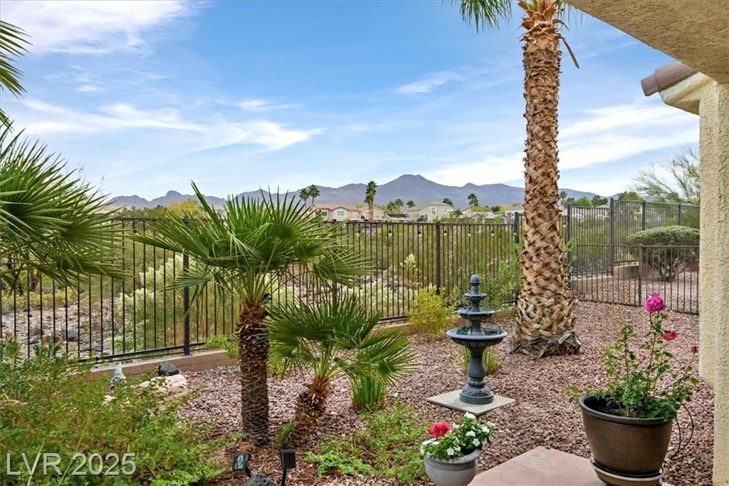 Great curb appeal in front and VIEWS in the back! This lovely home has it all. Natural light makes this home bright with tile floors on the diagonal an upgraded fixtures that include kitchen and primary bath light fixtures inside and new front coach lights and back porch lights outside. Front security door provides privacy too.This house has beautiful tile throughout. Greatroom is spacious and has sliding glass doors to backyard. Backyard with mountain views is perfect for relaxing under the covered patio. The lush landscaping is easy care but brings color.Kitchen has newer and upgraded stainless steel appliances. Kitchen has ample cabinetry, granite counter tops and an eating area. Primary bedroom is spacious and has a window to the backyard. The primary bath has dual sinks, large shower and Walkin closet. Some rooms are newly painted too! The second bedroom has closet and closet to bathroom 2 which has a tub/shower combination. The garage has great storage. Immaculate !!