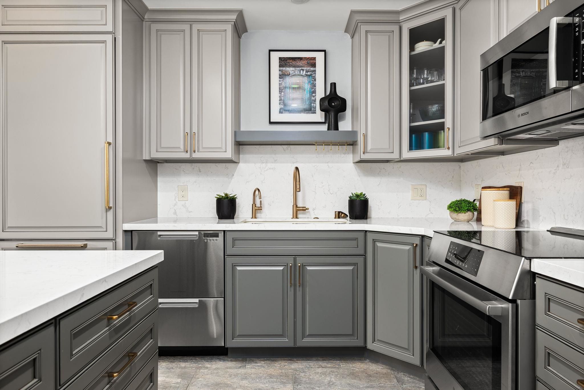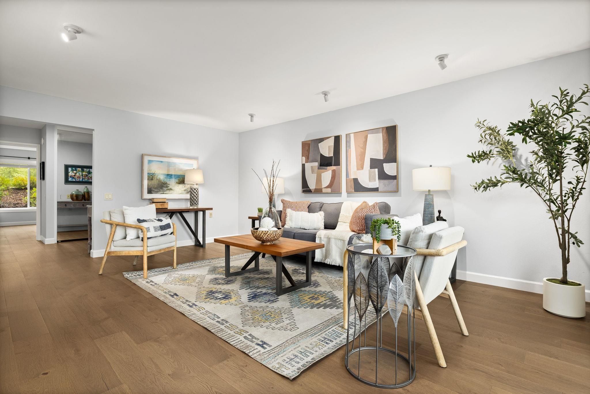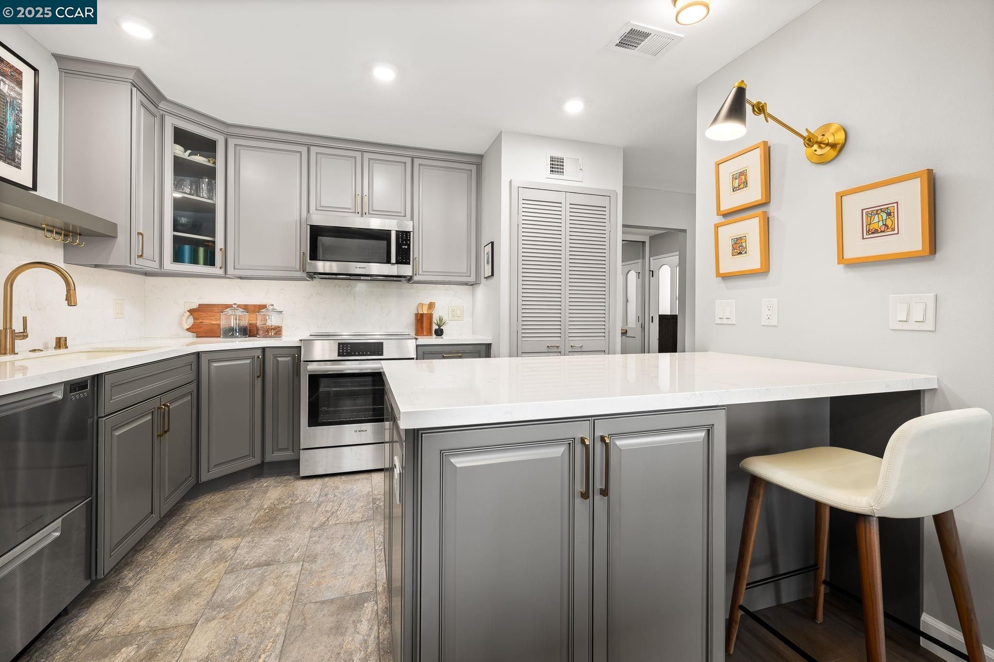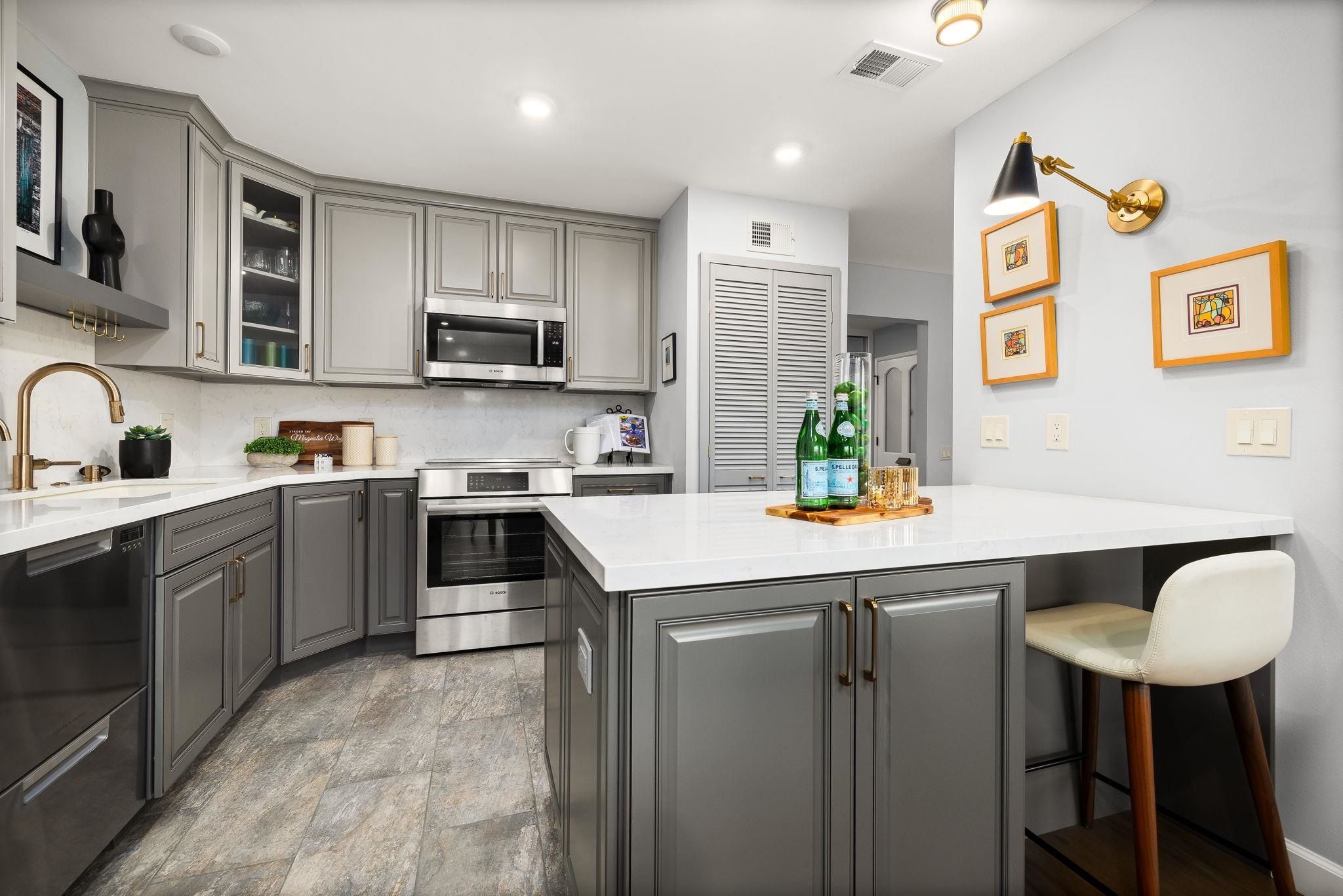 Located in Rossmoor, Walnut Creek’s premier 55+ community, this beautifully renovated Sonoma model blends modern sophistication with serene, park-like surroundings. The open layout features smooth ceilings, hardwood floors, and abundant natural light through triple pane Pella windows and sliders that open to a balcony with peaceful views. The fully remodeled kitchen showcases all wood KraftMaid cabinetry, quartz countertops, a large island with bar seating, Brizo faucet, water filtration system, and premium appliances including a Bosch induction range, Fisher & Paykel two drawer dishwasher, and built in Thermador refrigerator. A custom buffet and Thomas O’Brien lighting enhance the dining area’s style. Both bedrooms include custom closet systems, and the updated bath features quartz countertops, modern cabinetry, and designer fixtures. Additional highlights include an LG washer and dryer, mirrored entry doors, and convenient carport parking. Residents enjoy a vibrant 55+ lifestyle with resort-style amenities including clubhouses, pools, fitness centers, walking trails, social events, and optional golf memberships, plus gated security and community transportation.