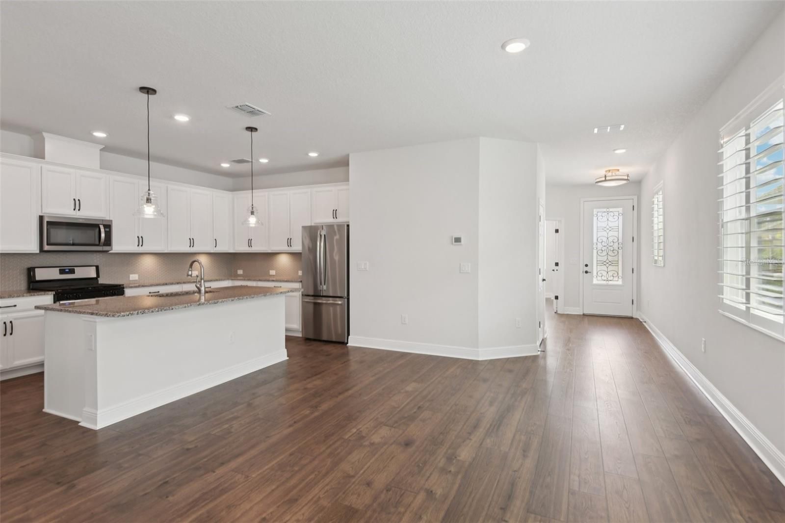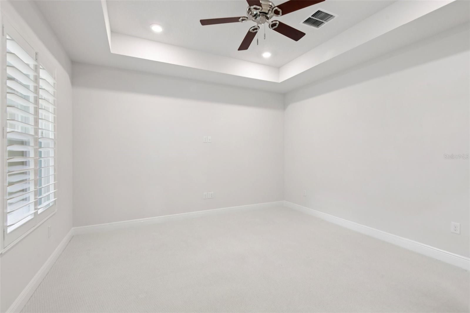 - Ceiling Fan(s), Coffered Ceiling(s), Eat-in Kitchen, High Ceilings, Kitchen/Family Room Combo, Open Floorplan, In-Wall Pest Control, Main Level Primary, Solid Surface Counters, Stone Counters, Thermostat, Walk-In Closet(s)