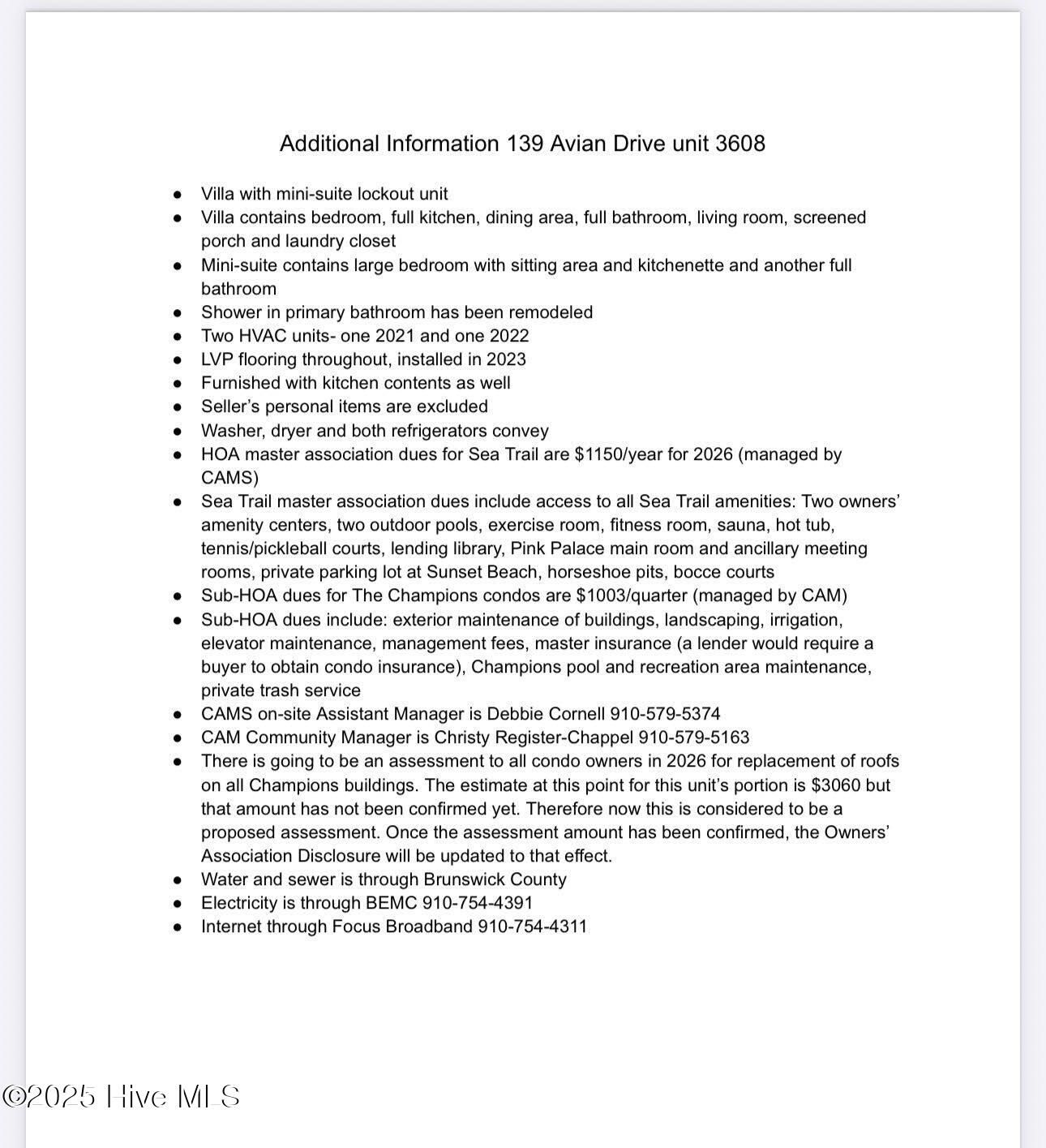 This Champions condo in the vibrant golf community of Sea Trail is ready for a new owner! With LVP flooring throughout and newer HVAC units, there is little to do in this fully furnished unit. This conscientious seller has kept everything neat and tidy and this unit has not been rented. The floor plan is ideal for a vacation home, investment property, and many people live in these units full-time as well. The Villa side offers a full kitchen, dining area, living room, full bathroom, primary bedroom and laundry closet. The mini-suite contains a bedroom area, kitchenette, sitting area and another full bathroom. Each building has its own elevator, and these condos have their own pool, deck and recreation area in addition to all of the amenities available in Sea Trail. Sea Trail master association amenities include two owners' clubhouses, two outdoor pools, an exercise room and fitness room, private parking lot at Sunset Beach, hot tub, sauna, tennis/pickleball courts, a lending library, multiple activity rooms and plenty of organized activities. At barely 5 minutes to the pristine sands of Sunset Beach, a stone's throw from the town areas of Calabash, Sunset Beach and Ocean Isle Beach, and with multiple golf courses nearby, this location could not be more convenient. Sea Trail itself boasts three 18-hole golf courses and two beautiful restaurants. Shopping, dining, golf, beach, boating... what are you waiting for?! Schedule your showing today!