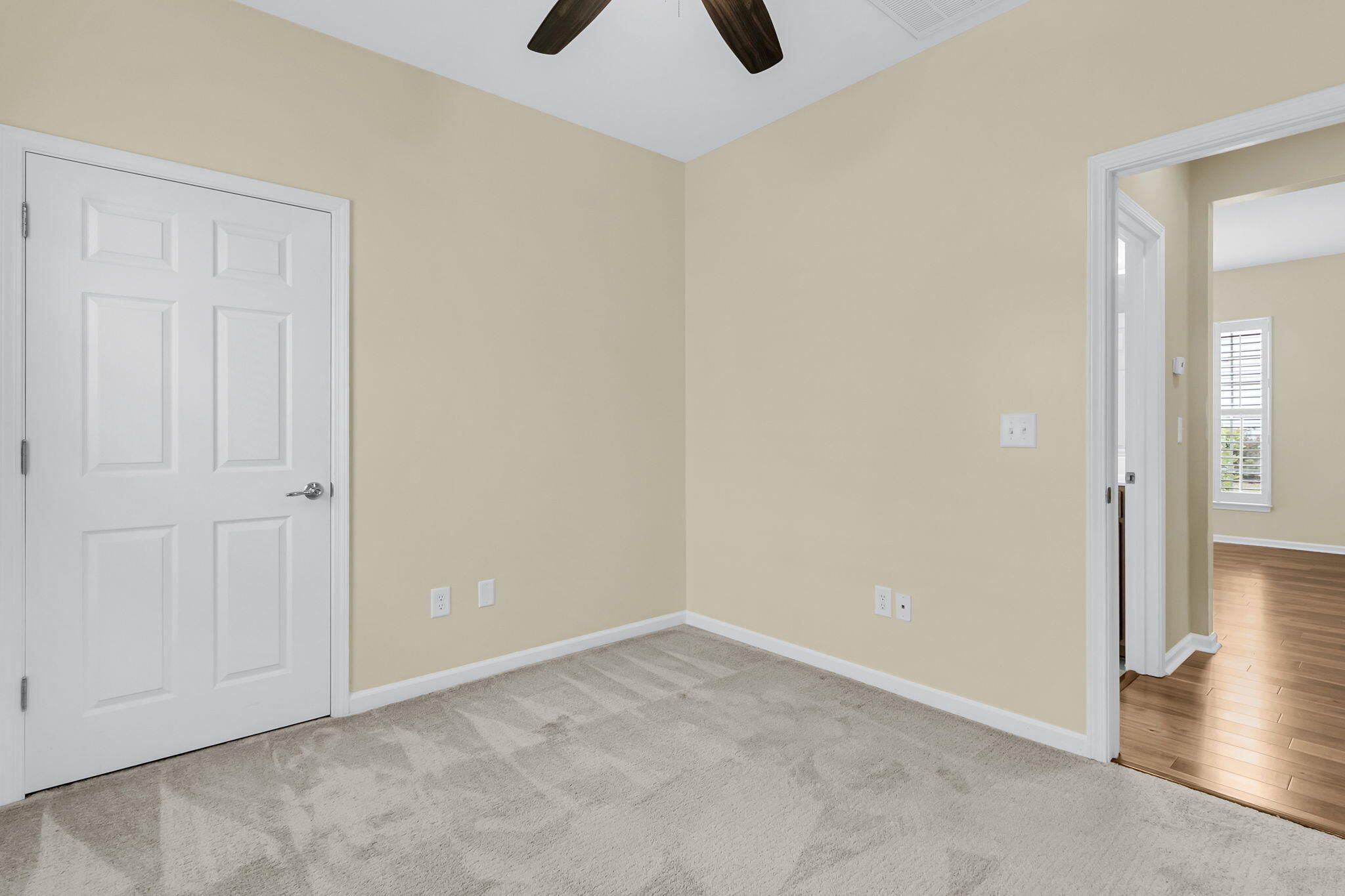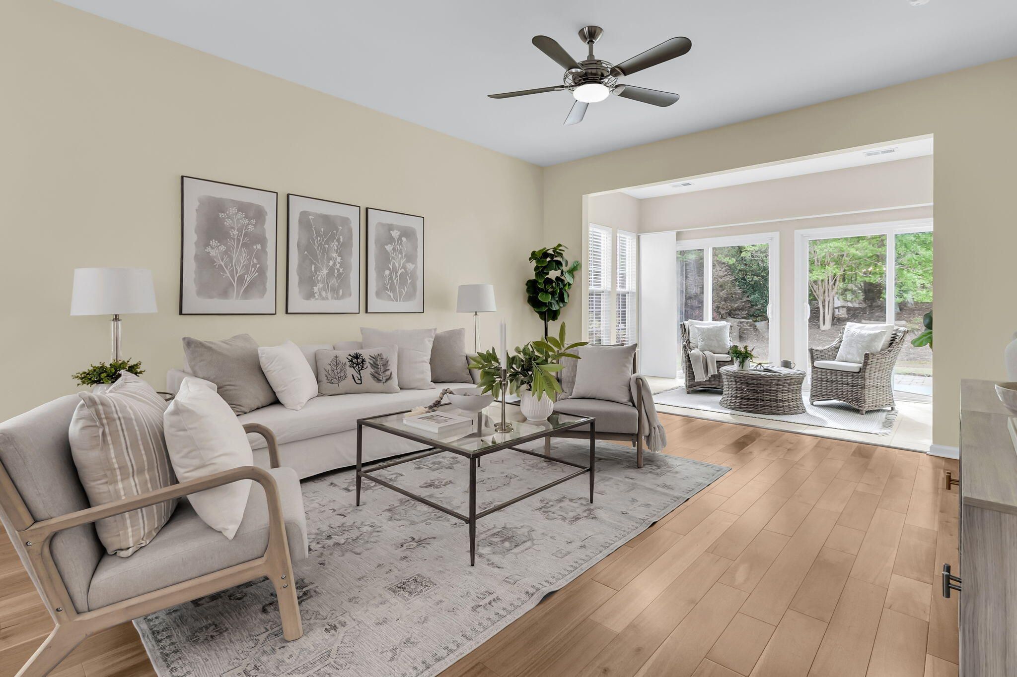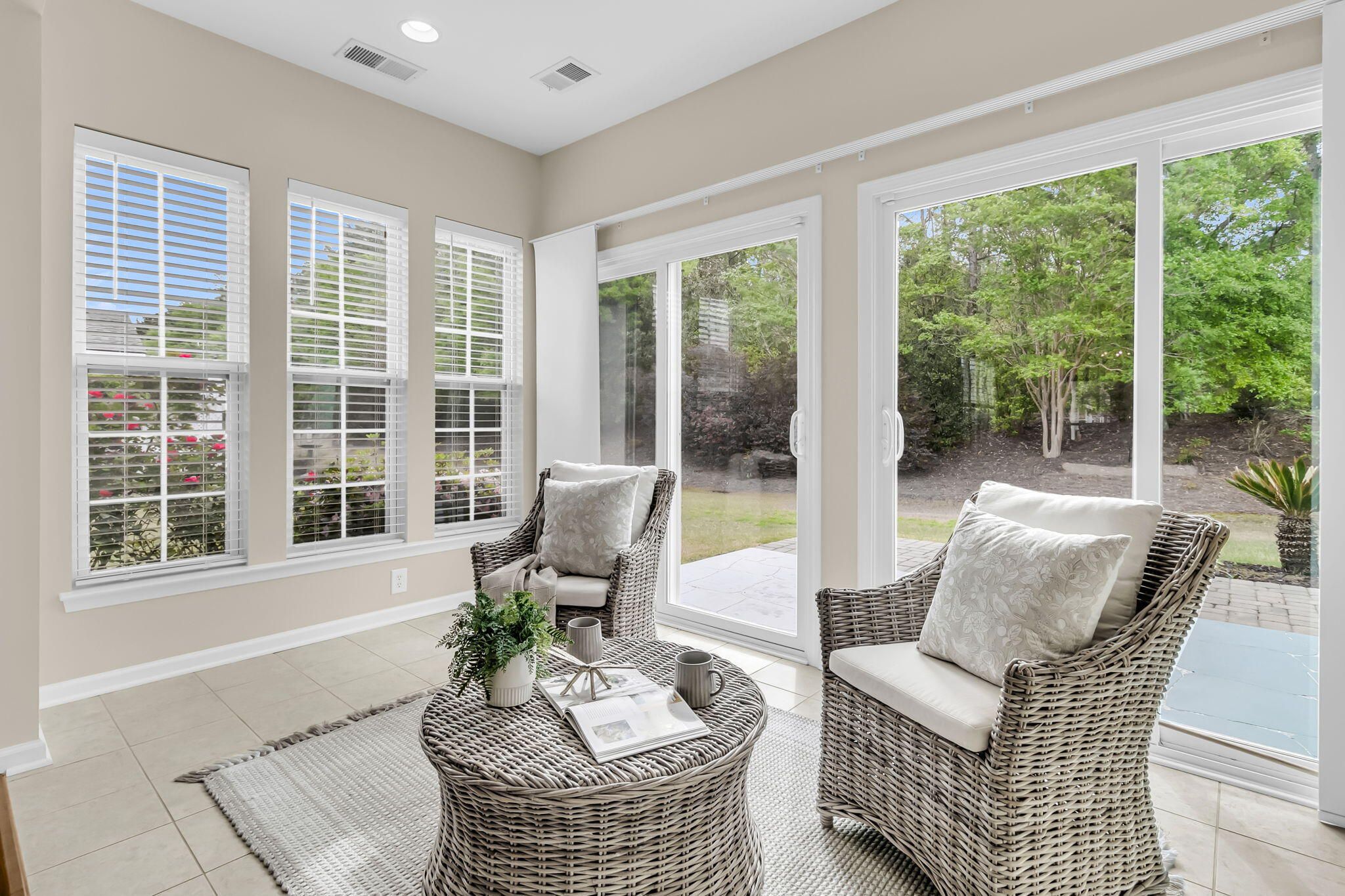 Charming 2 bedroom, 2 bath home with an added sunroom and beautiful updates throughout! Situated on a uniquely private lot with wooded backyard views and extra space between one neighbor, you'll feel as if you're on your own private oasis. Step inside to find tile and hardwood floors extending throughout all the living areas. The island kitchen includes white and blue cabinetry, Corian countertops, tile backsplash, stainless steel appliances with gas range, and a cozy eat-in breakfast nook. The main living area offers plenty of room for both living and dining sets. A light-filled sunroom with two sliding glass doors and outdoor patio with stamped concrete and paver extension overlook a beautiful wooded berm. Back inside, the Owner's Suite offers updated carpeting and an ensuite bath withtile floors, a custom walk-in tile shower with frameless shower door, double sink vanity, and walk-in closet. The guest bedroom sits down its own private hallway, and can easily serve as both a bedroom and home office. Plantation shutters and extra trim detailing throughout private beautiful home enhancements. You're only a short walk to the community's beautiful 20,000sf amenities center featuring indoor and outdoor pools, fitness center, ballroom, and pickle, tennis, and bocce courts. Del Webb Cane Bay is an award-winning 55+ community with a full-time lifestyle director, busy calendar of events, and over 100 chartered clubs. Don't miss out on this precious, move-in ready home is the area's premier Active Adult community!