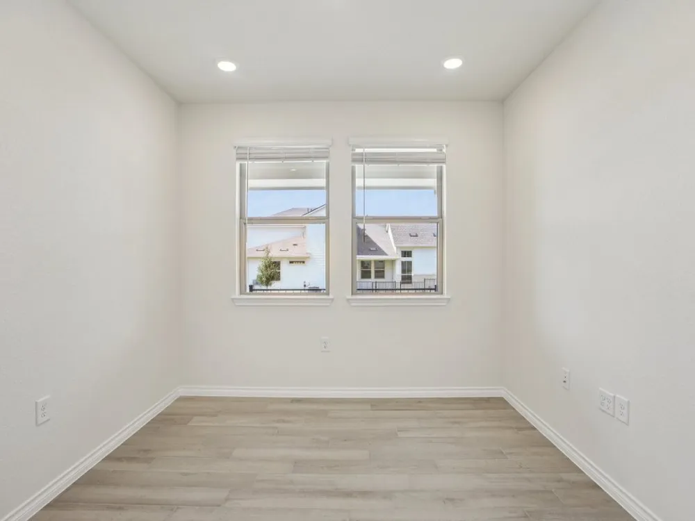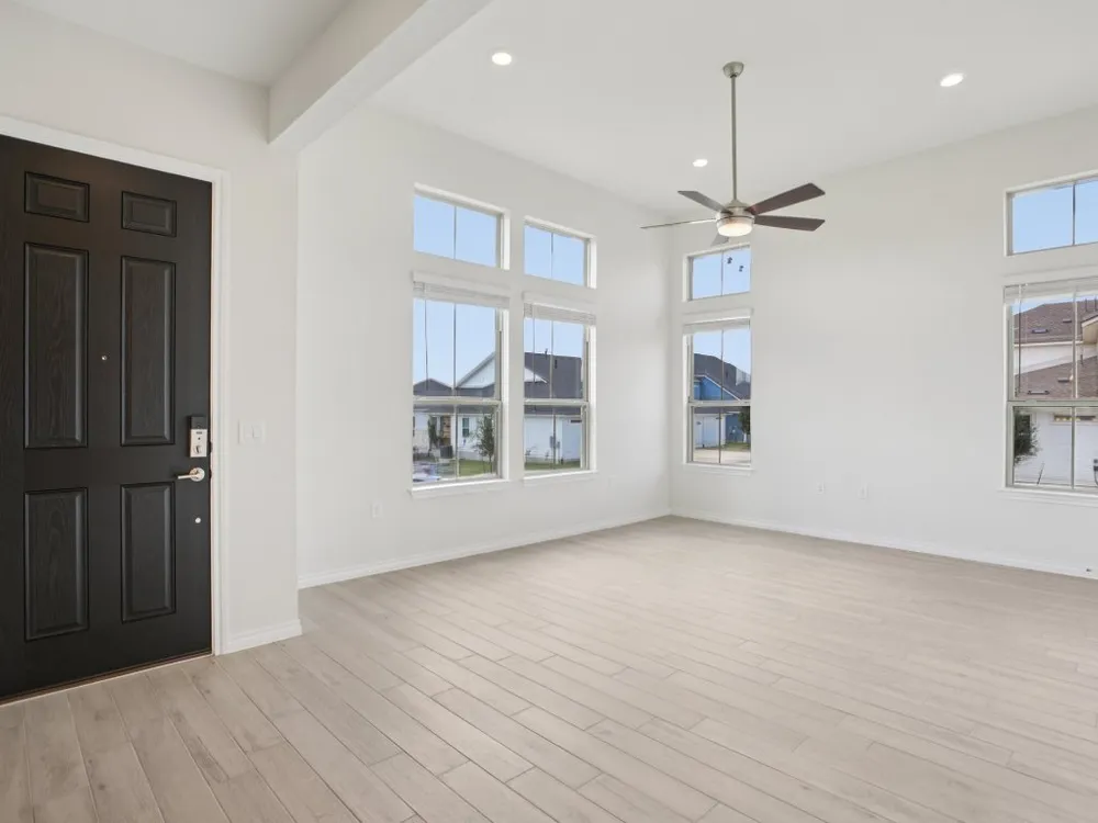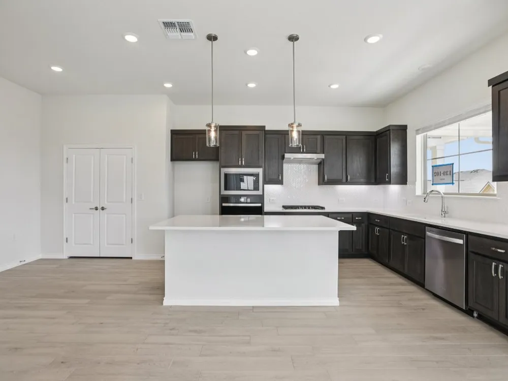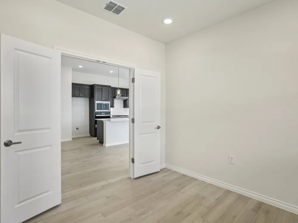 Evia plan with upgraded kitchen, quartz countertops, upgraded tile flooring, optional study with double doors, Express cordless blinds