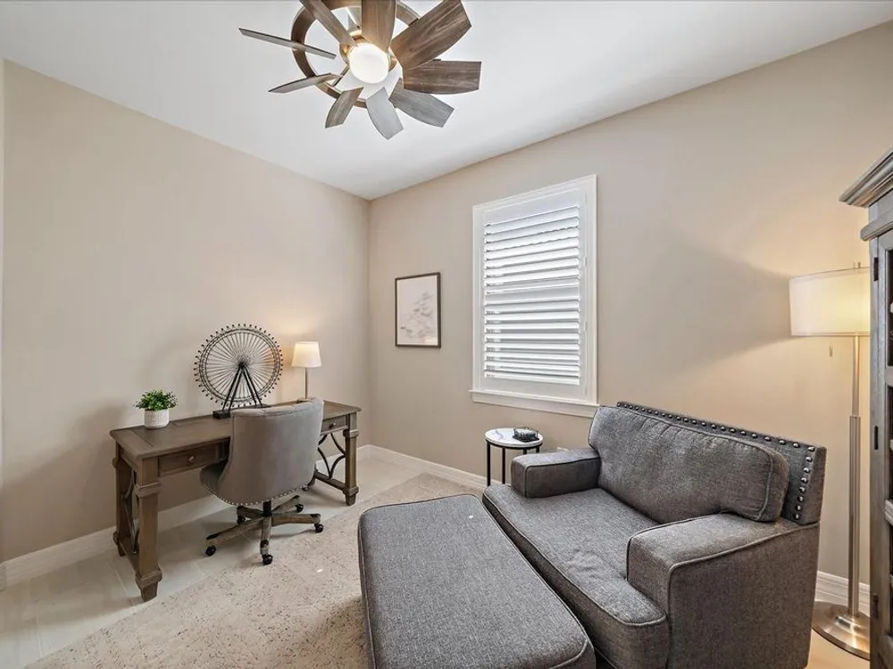 - Ceiling Fan(s), High Ceilings, Living/Dining Room, Stone Counters, Thermostat, Window Treatments