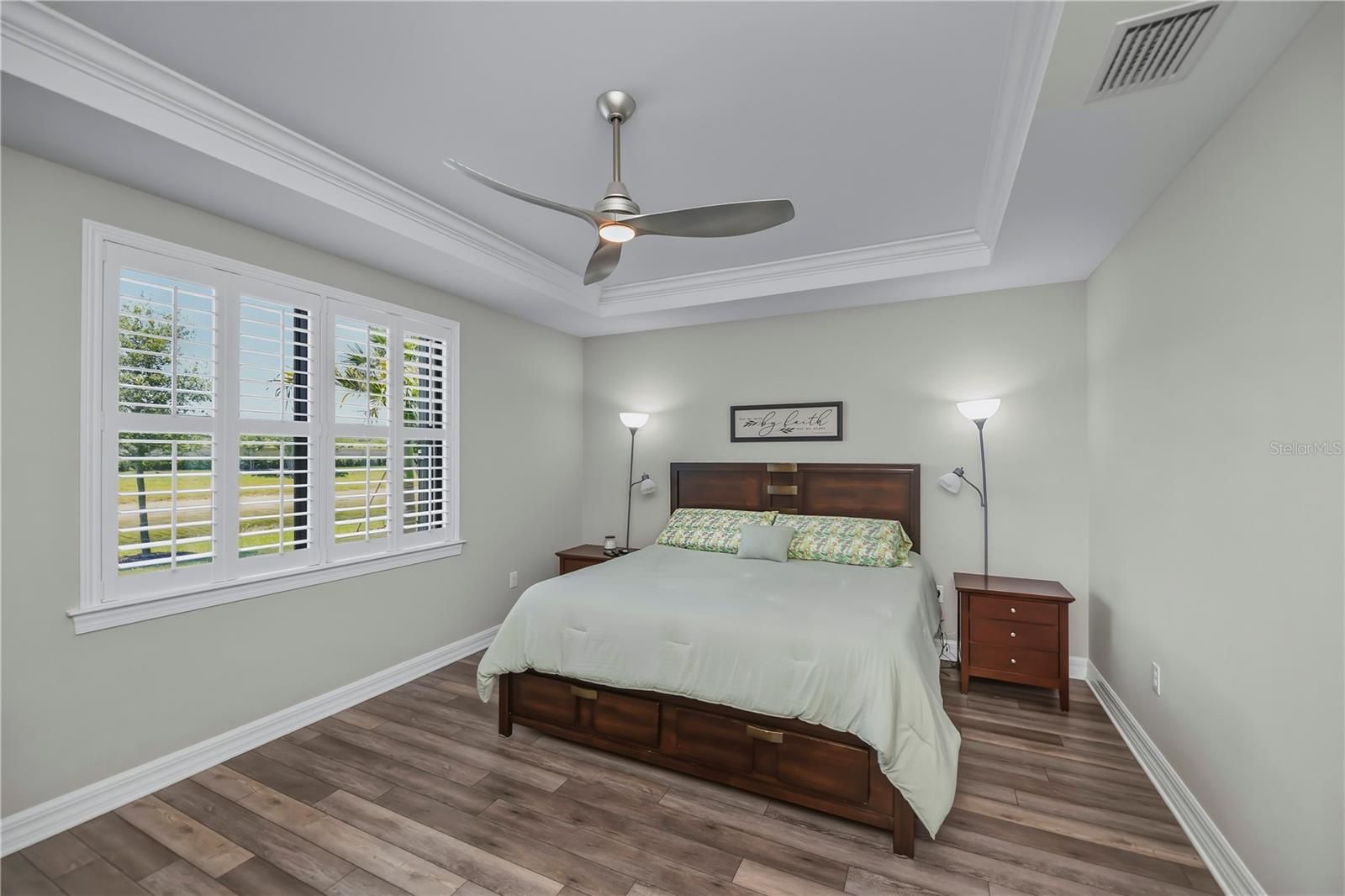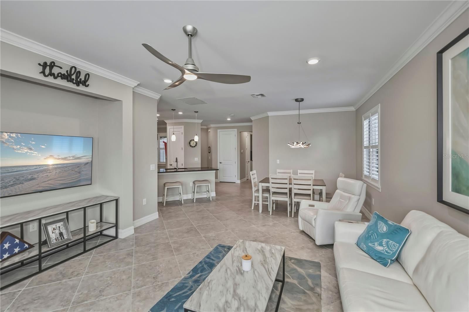 - Ceiling Fan(s), Crown Molding, High Ceilings, Living/Dining Room, Open Floorplan, Main Level Primary, Stone Counters, Thermostat, Tray Ceiling(s), Walk-In Closet(s), Window Treatments