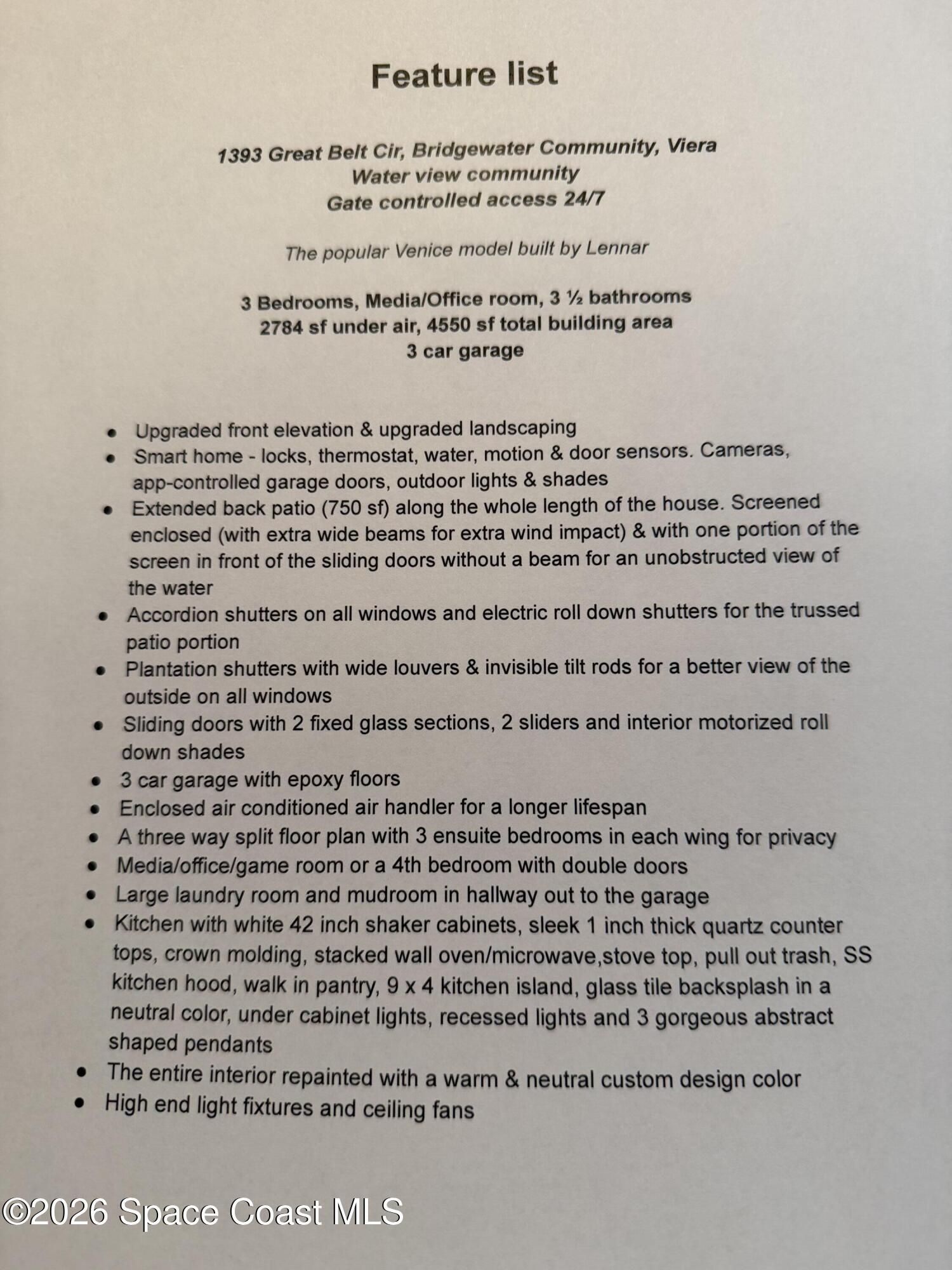 Home crafted with classy sleek lines and a curated comfort that whispers of elegance! The stunning living room, kitchen & 12x12 dining area blend effortlessly together while the 12 X 8 sliding glass opening offers a wide view of the lake & the extended screened lanai. Tray ceiling, crown moldings, plantation shutters, motorized roll-down-shades, earthy neutral tile floors, artsy high-end island pendants & a dining chandelier offer both function & aesthetics. This 2784 sf home consists of 3 bedrooms (all en-suites) / flex/media room / XL laundry / half bath & a ''mudroom'' hall out to the 3 car garage w epoxy floors. Owner's suite w soaking tub, shower, his/hers WI-closets & vanities. The trussed lanai has roll down storm shutters & all windows have accordion shutters. Located in Viera in a gated 55+ resort living community with top-of-the-line amenities (even a movie theater) & miles of scenic sidewalks. Close to shopping, fresh produce & 15 min to the beach.