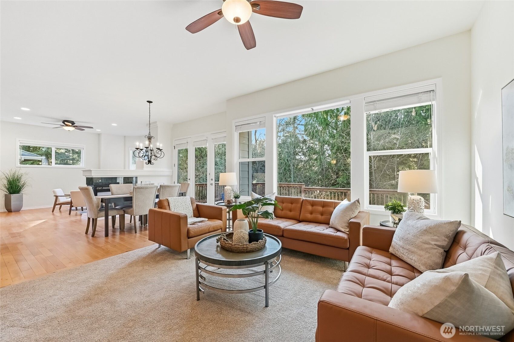 This American Traditional Cedar plan home is located in a quiet cul-de-sac on a beautiful greenbelt site, offering the ultimate in space and privacy. You enter this freshly painted home through the grand gallery hall punctuated by a spectacular circular vestibule that opens up toward the sky. The main living areas are anchored by hardwood floors and a 3-sided fireplace, and you can use the versatile spaces in ways that work best for your lifestyle. Generous island kitchen with 42” cabinets, granite counters & planning desk. You’ll love the generous scale of the owner’s suite that makes it a truly luxurious sanctuary while enjoying the forest views. The en-suite is a 5-piece bathroom with a customized walk-in closet. The second en-suite bedroom makes a perfect spot for guests. Powder room for day guests. Glass French doors lead into the oversized home office. Large laundry/mud room with a handy sink, cabinets and storage closet is the perfect drop point when you come in from the garage. New carpet in the bedrooms and office. The oversized deck is a wonderful extension of your entertaining and living spaces. Three car garage (one is tandem). Air conditioning. As the PNW’s flagship 55+ master-planned community, Trilogy offers a resort lifestyle with a beautiful clubhouse, fitness center, indoor pool & walking track, pickleball & tennis courts, miles of walking trails and a true sense of community. One occupant must be age 55 or older and no permanent occupant under age 18.