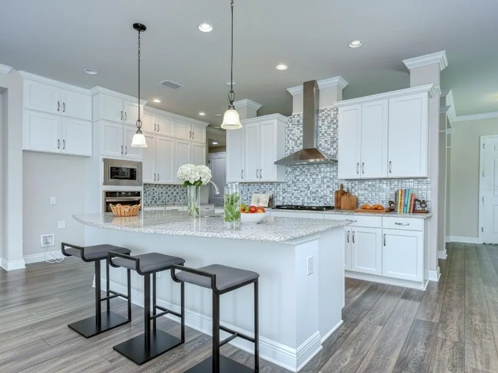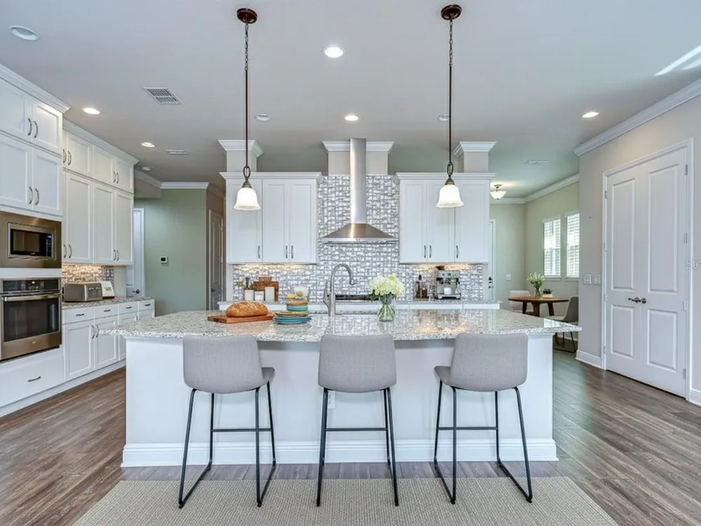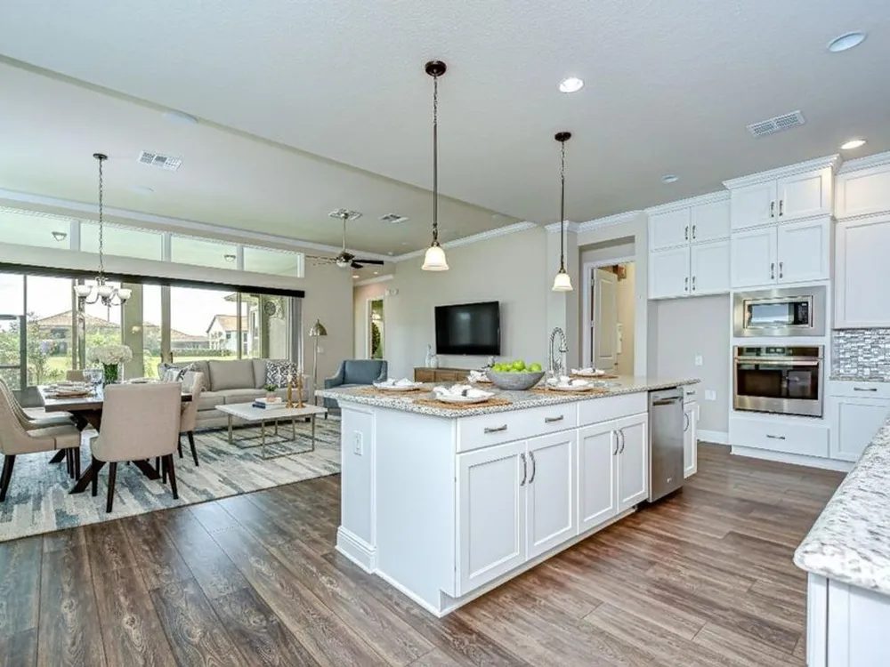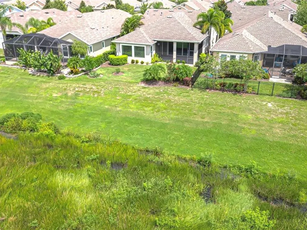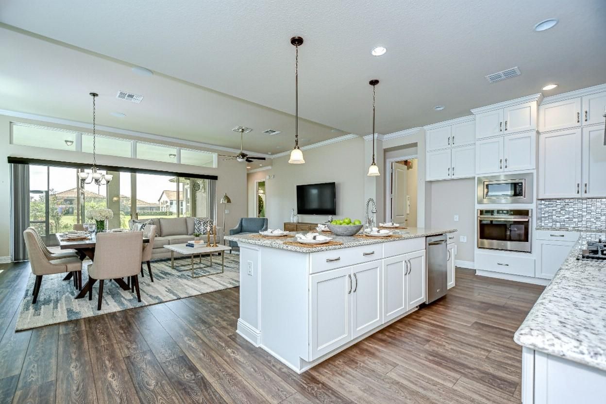 One or more photo(s) has been virtually staged. Imagine waking up every day in a community where it feels like you’re on vacation. That dream becomes reality in this beautifully crafted David Weekley home, perfectly placed in the coveted Encore at FishHawk Ranch West, a 55+ gated neighborhood offering true resort-style living. Set on a private lot with no backyard neighbors, this home blends comfort, elegance, and function. Inside, you’ll find neutral paint, wood-look tile flooring, crown molding, and wide baseboards that create a warm and timeless backdrop. The gourmet kitchen is a showstopper with stone countertops, stainless steel appliances, built-in oven and microwave, soft-close cabinetry, a large island, and a designer backsplash. Flowing seamlessly into the great room, natural light pours in through a wall of sliders that open to the screened lanai—perfect for entertaining or enjoying peaceful conservation views. A convenient half bath is nearby to add thoughtful functionality. The primary suite, tucked at the back of the home for privacy, features a large walk-in shower, dual vanities with plenty of storage, and a spacious walk-in closet. Guests will love the second bedroom with its own en-suite bath and walk-in shower, while the front dining room adds character with plantation shutters and custom built-ins. Life in Encore centers around The Oasis Club, where you’ll enjoy a fitness center, resort-style pools, pickleball and bocce courts, fire pits, miles of walking trails, and a vibrant clubhouse for gatherings and events—all led by a dedicated on-site activities director. This home delivers the perfect balance of luxury, privacy, and an active lifestyle—your next chapter starts here!