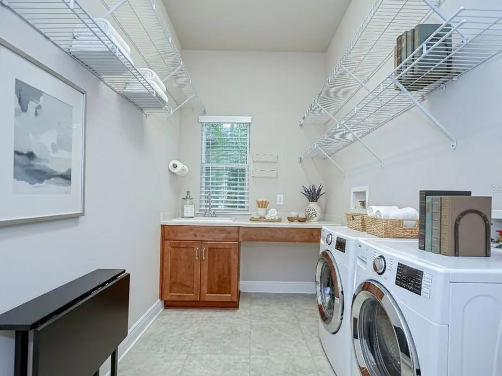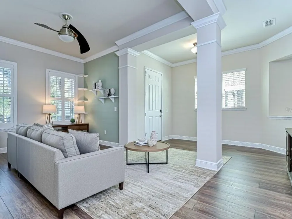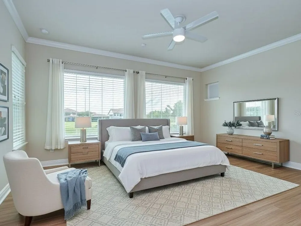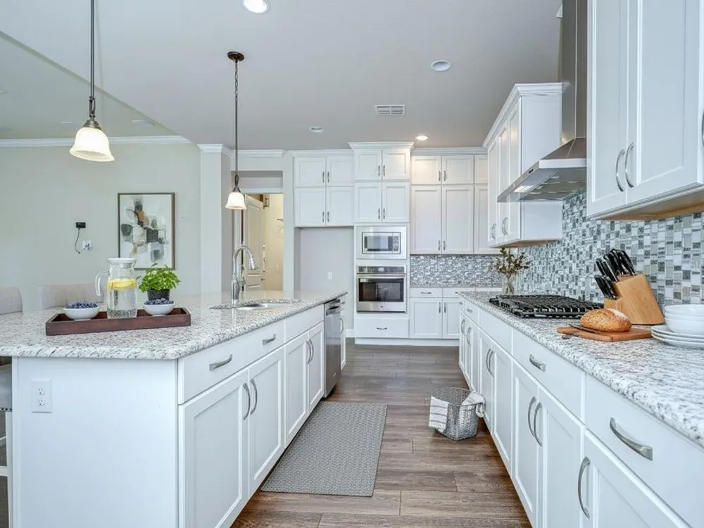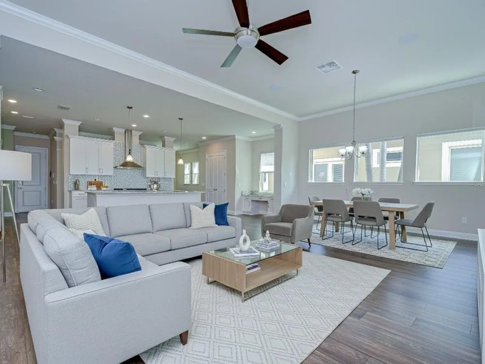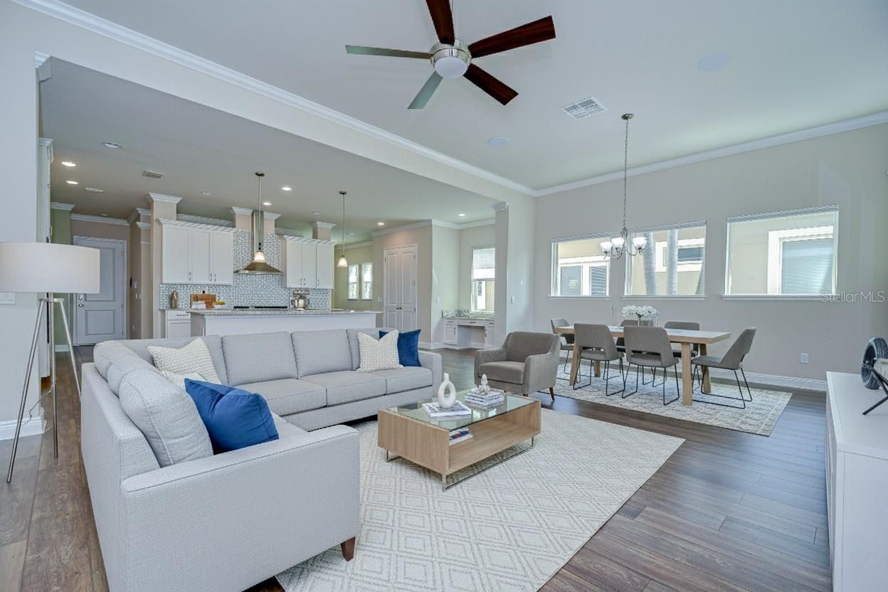 One or more photo(s) has been virtually staged. Imagine waking up every day in a community where it feels like you’re on vacation. That dream becomes reality in this beautifully crafted David Weekley home, perfectly placed in the coveted Encore at FishHawk Ranch West, a 55+ gated neighborhood offering true resort-style living. Set on a private lot with no backyard neighbors, this home blends comfort, elegance, and function. Inside, you’ll find neutral paint, wood-look tile flooring, crown molding, and wide baseboards that create a warm and timeless backdrop. The gourmet kitchen is a showstopper with stone countertops, stainless steel appliances, built-in oven and microwave, soft-close cabinetry, a large island, and a designer backsplash. Flowing seamlessly into the great room, natural light pours in through a wall of sliders that open to the screened lanai—perfect for entertaining or enjoying peaceful conservation views. A convenient half bath is nearby to add thoughtful functionality. The primary suite, tucked at the back of the home for privacy, features a large walk-in shower, dual vanities with plenty of storage, and a spacious walk-in closet. Guests will love the second bedroom with its own en-suite bath and walk-in shower, while the front dining room adds character with plantation shutters and custom built-ins. Life in Encore centers around The Oasis Club, where you’ll enjoy a fitness center, resort-style pools, pickleball and bocce courts, fire pits, miles of walking trails, and a vibrant clubhouse for gatherings and events—all led by a dedicated on-site activities director. This home delivers the perfect balance of luxury, privacy, and an active lifestyle—your next chapter starts here!