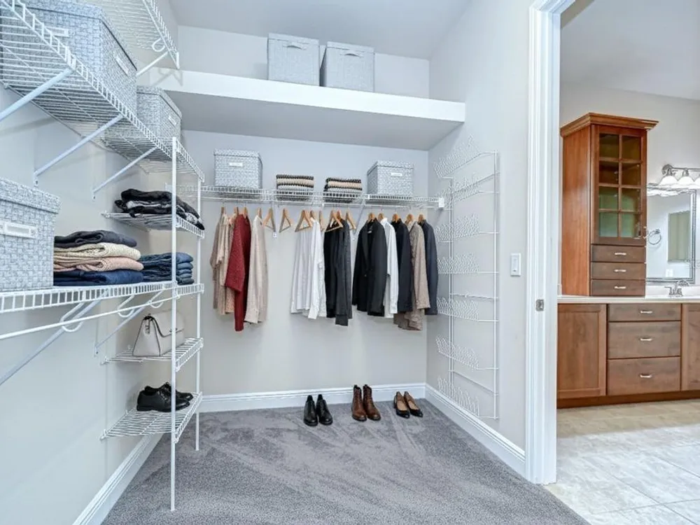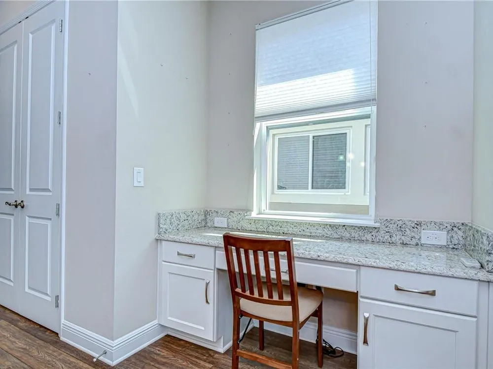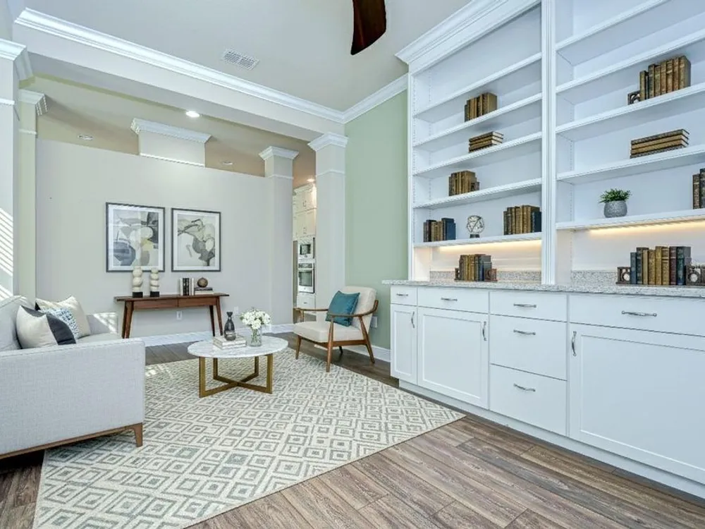 - Built-in Features, Ceiling Fan(s), Crown Molding, Eat-in Kitchen, High Ceilings, Kitchen/Family Room Combo, Open Floorplan, Split Bedrooms, Stone Counters, Thermostat, Walk-In Closet(s)
