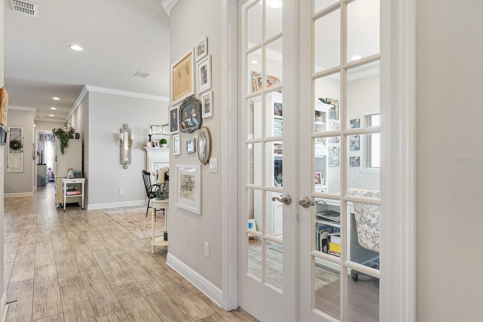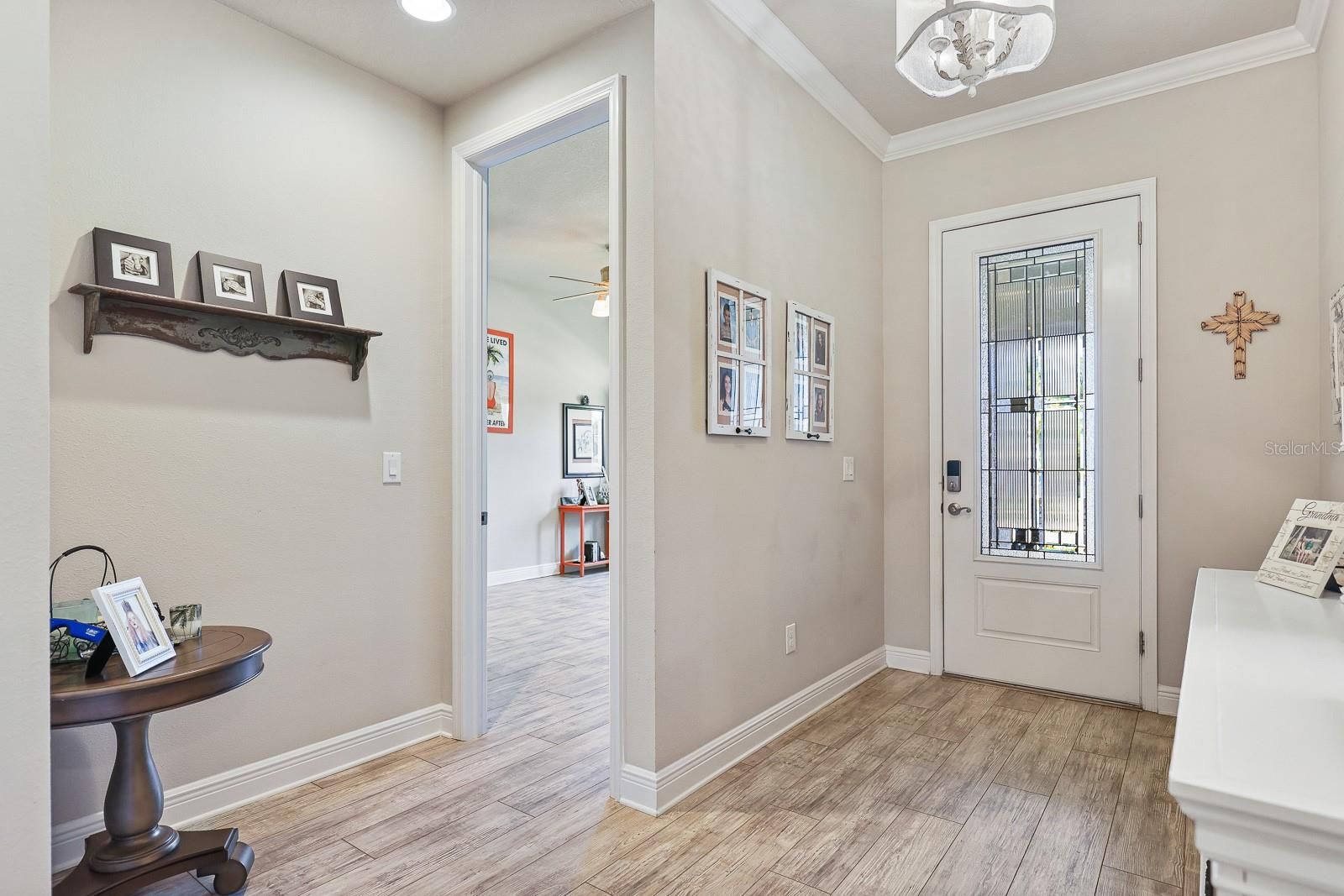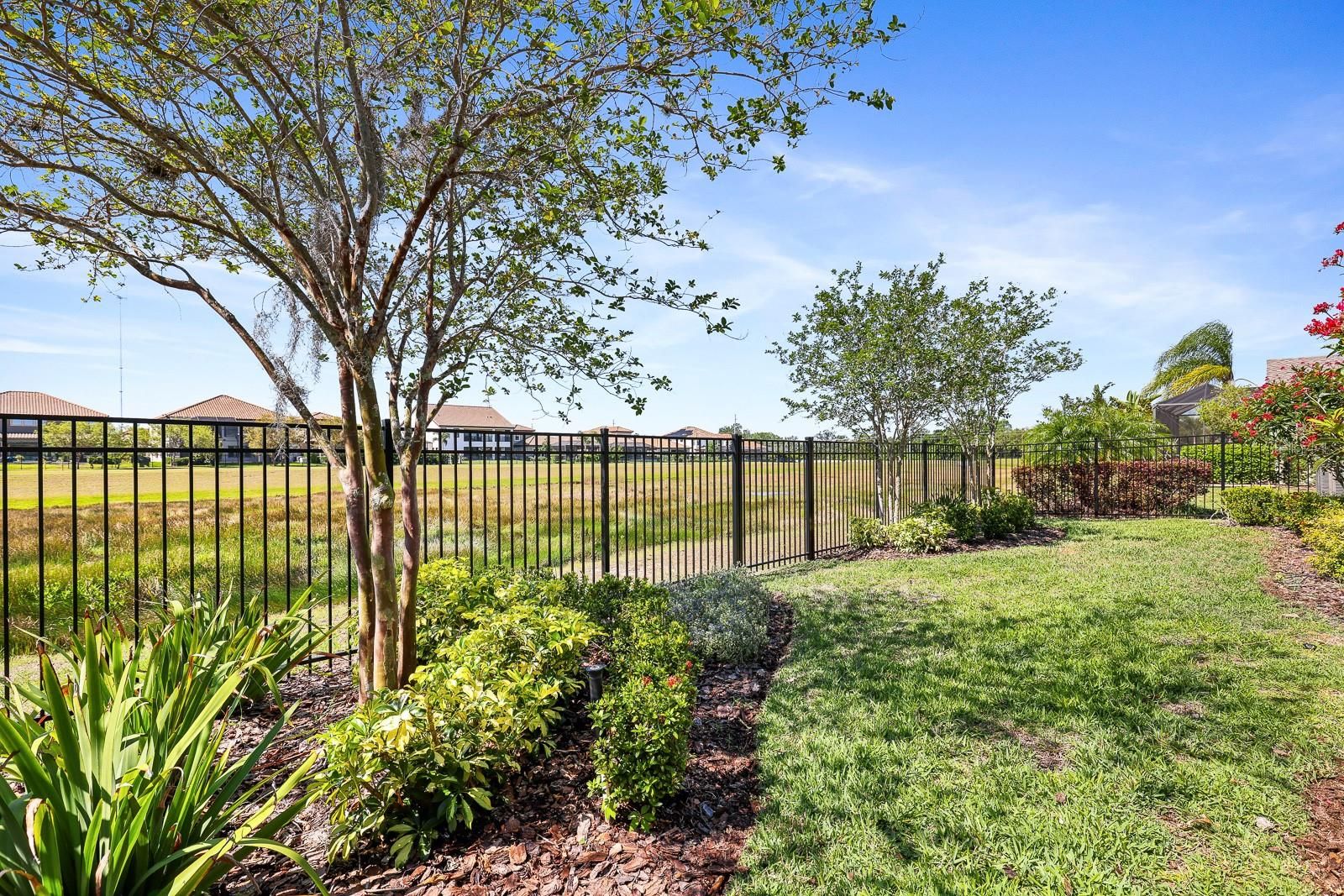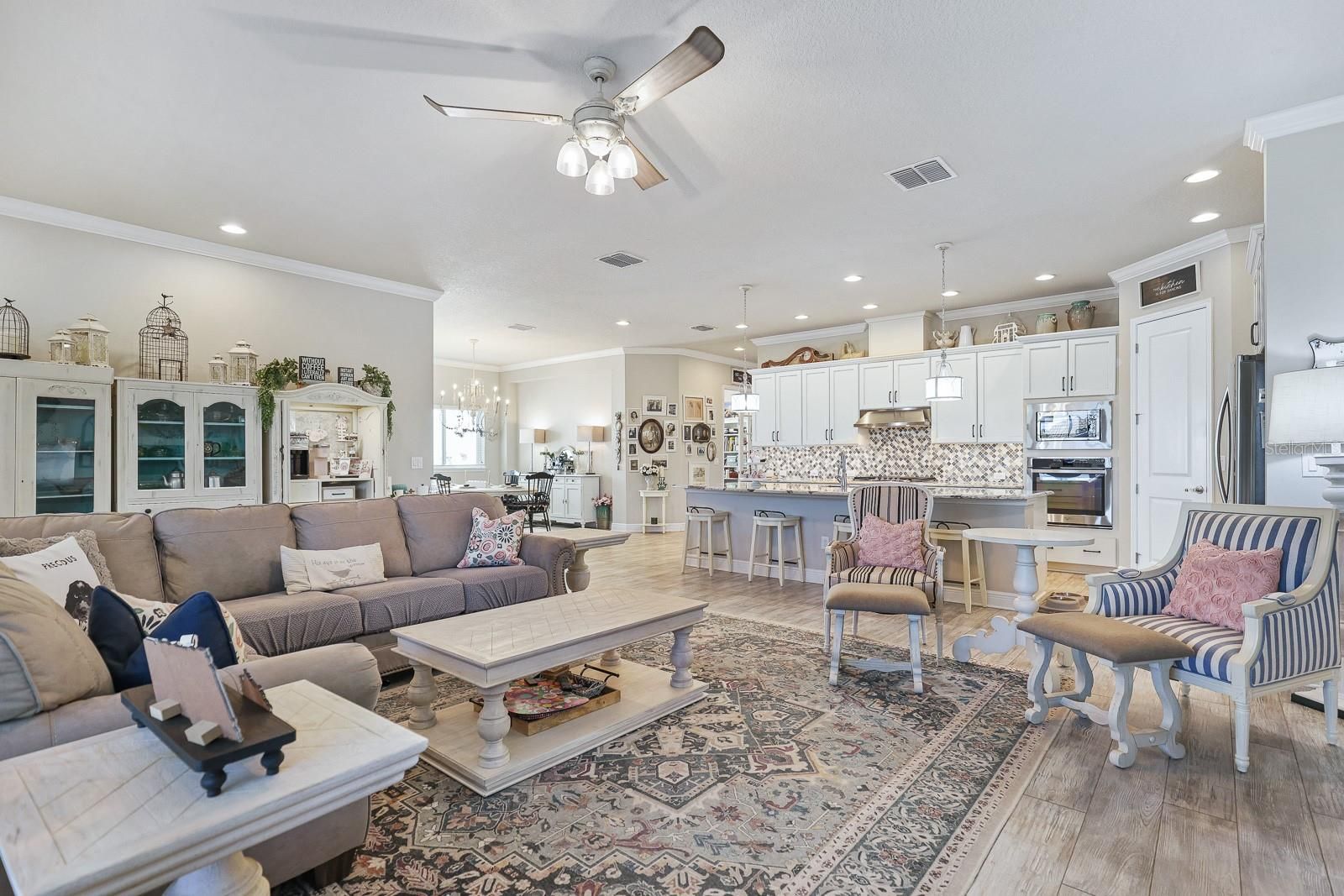 Discover a beautifully upgraded David Weekley home that shows like a model, set within the gated 55+ Encore at Fishhawk Ranch community—one of Tampa Bay’s most sought-after active adult neighborhoods. This thoughtfully planned residence offers an open, airy layout designed to balance everyday ease with effortless entertaining. At the heart of the home is a standout kitchen, complete with generous cabinet and counter space, an eye-catching tile backsplash, gas cooktop with vented hood, built-in convection oven and microwave, a walk-in pantry, and a spacious center island perfect for hosting family and friends. Extensive upgrades throughout the kitchen, interior living areas, and outdoor spaces reflect the care and investment made by the homeowner. The interior is enhanced by crown molding, recessed lighting, and durable laminate plank tile flooring that adds both style and practicality. Just inside the garage, a functional mudroom with a built-in bench offers everyday convenience, while the well-appointed laundry room includes cabinetry, shelving, and a utility sink. Outdoor living shines on the extended, screened, brick-paver lanai featuring a gas firepit and views of a fully fenced backyard overlooking peaceful green space. Gutters and downspouts are already in place to help handle Florida’s seasonal rains. The primary suite serves as a relaxing escape with a large walk-in closet featuring a custom island and a private bathroom showcasing dual vanities, tile flooring, a soaking tub, and a walk-in shower with tiled walls. A spacious secondary bedroom includes its own en-suite bathroom with a tub and shower combination, and a sizable office with glass French doors provides flexible space for work or hobbies. Encore’s HOA provides extensive lawn care services—including mowing, fertilization, irrigation oversight, mulching, shrub maintenance, and pest treatment—along with Spectrum high-speed internet and an enhanced TV package with DVRs. Residents also enjoy exclusive access to the nearby Oasis Club, offering a heated infinity-edge pool, spa, fitness center, pickleball, bocce and basketball courts, grill areas, outdoor televisions, card and game rooms, a wine bar, and a full calendar of activities coordinated by a dedicated lifestyle director. In addition, homeowners have access to Fishhawk Ranch West amenities, including pools, a splash pad, the Lake House with fitness and game rooms, and scenic biking and nature trails. This home delivers both comfort and an exceptional community experience—schedule your private tour and see it for yourself.