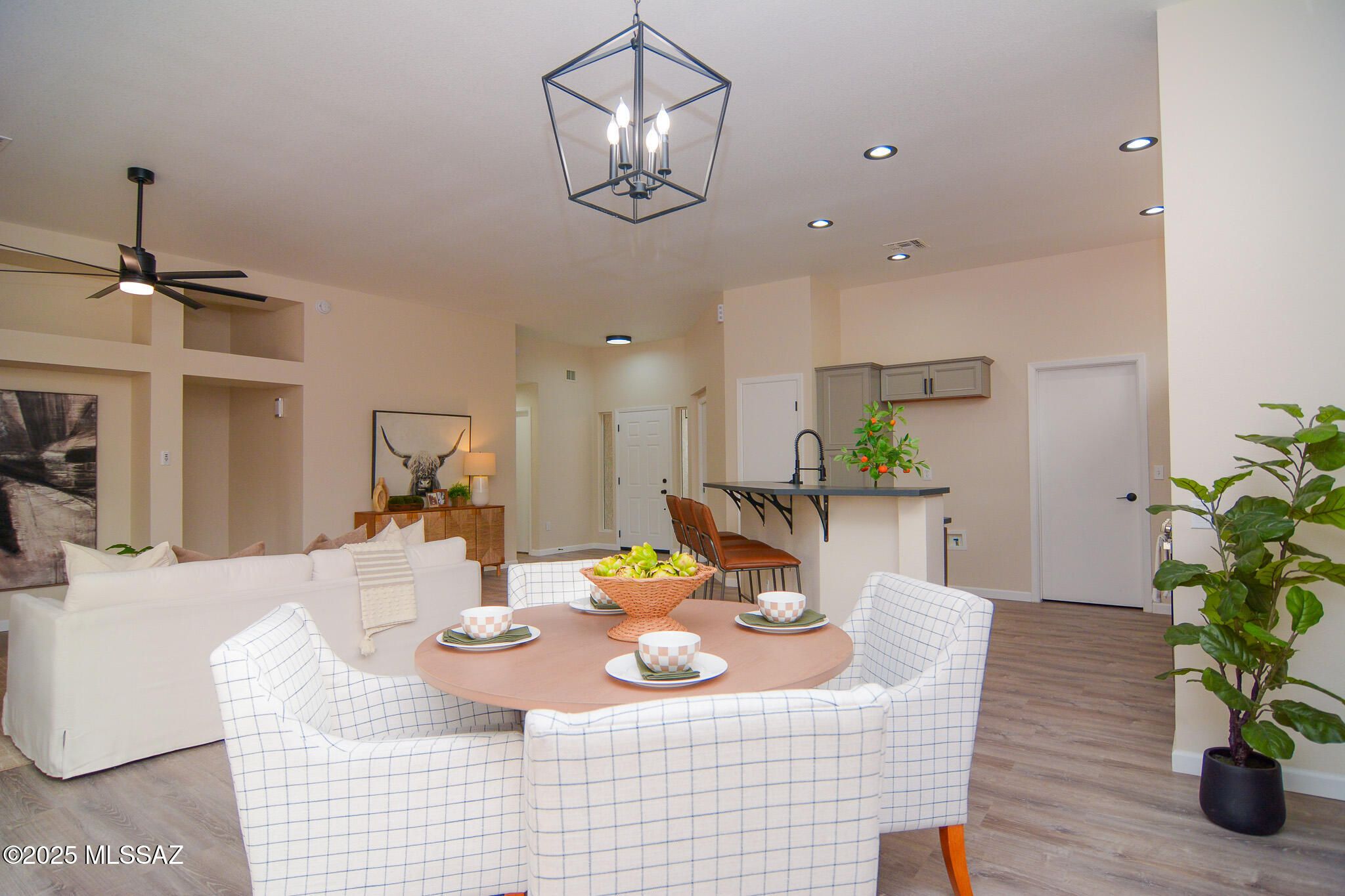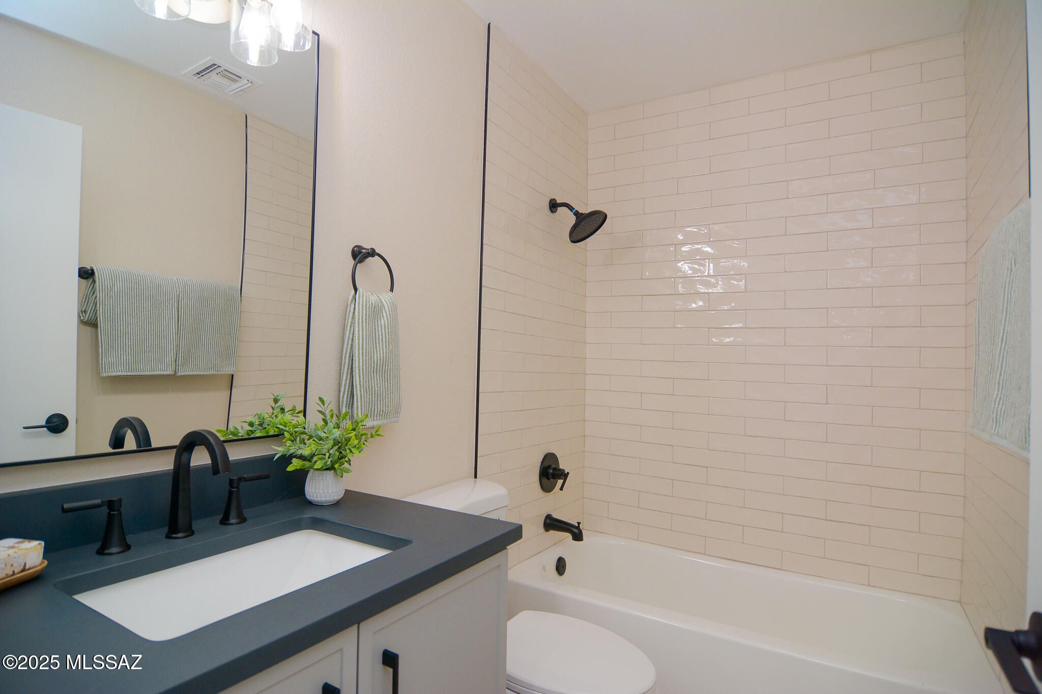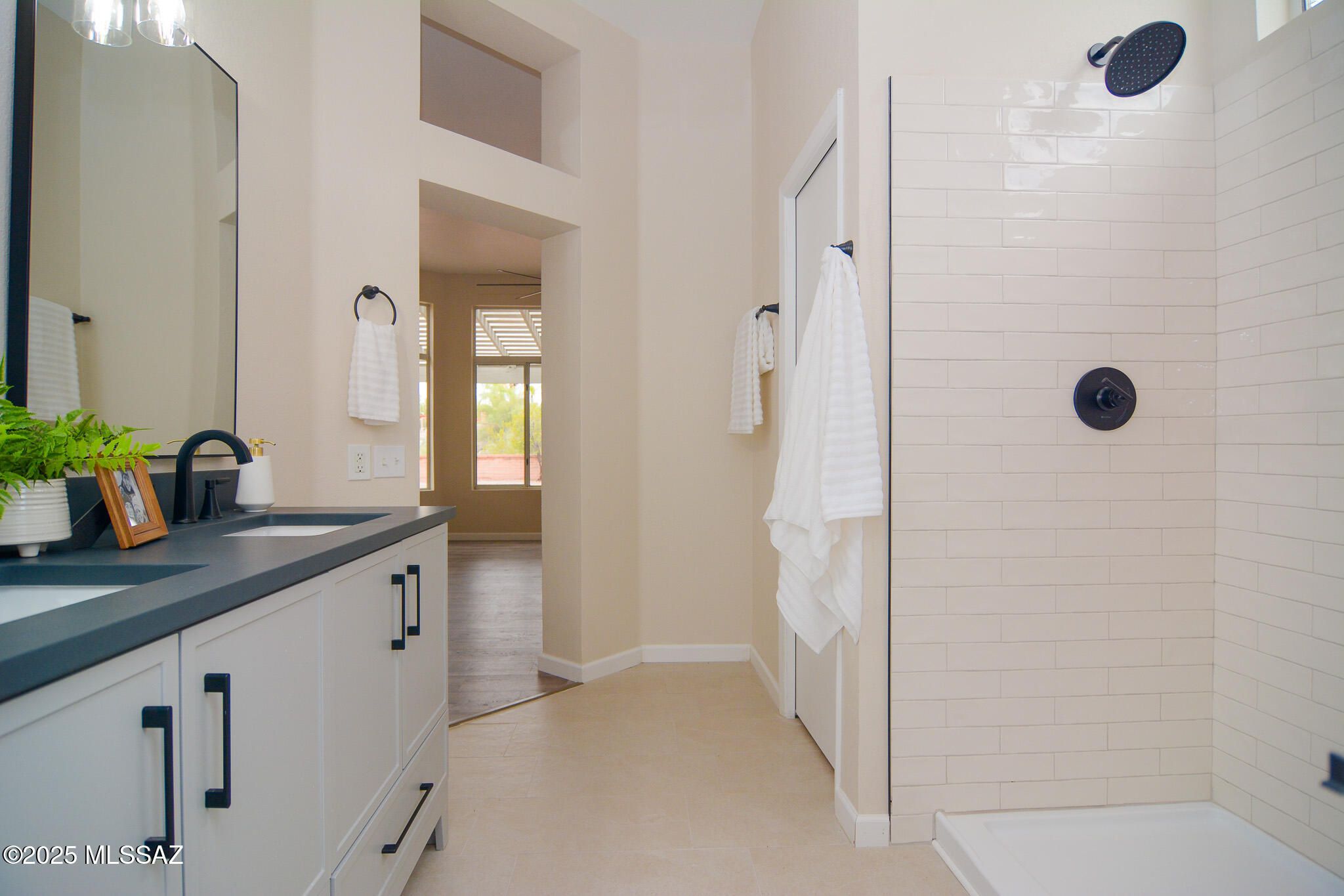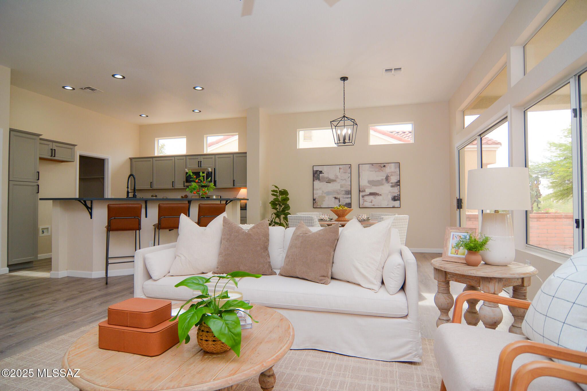 This stunning 3-bedroom, 2-bathroom residence is nestled in the 55+ community of Sun City Vistoso. Beautifully remodeled contemporary style home. Located in a desirable Oro Valley location. Modern wood look tile flooring. Updated modern kitchen with stainless steel appliances and slate countertops. New custom interior paint. Spacious owner's suite with walk in closet. Updated modern bathrooms. Large covered porch. Desert vegetation. Two car garage with built in cabinets. Upgraded door hardware and light fixtures. Owned solar panels. Association amenities includes clubhouse, park, pickleball court, clubhouse, pool, spa/hot tub and tennis courts. This home shows beautifully.