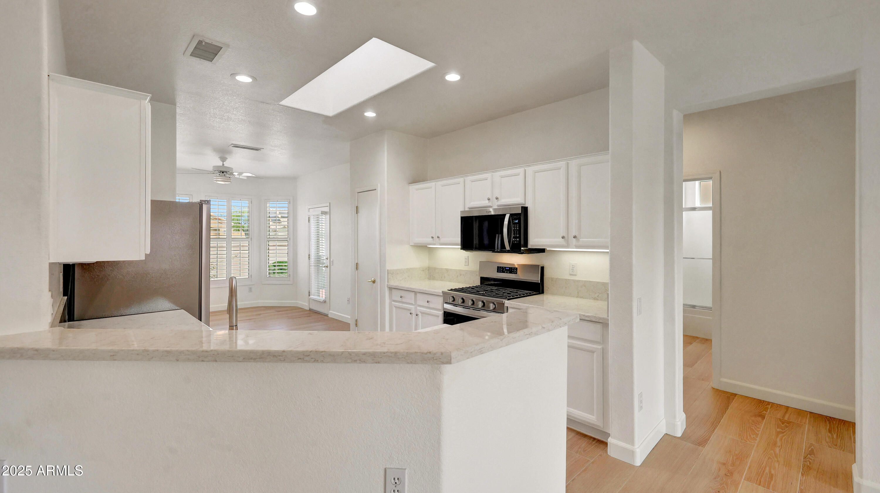 Beautiful golf course community, 3-bedroom, 2-bathroom home that boasts upgrades. New tile floor throughout the house, new baseboard throughout the house. New appliances, new double basin sink, new Quartz kitchen counters, Skylight in kitchen. New ceiling fan in the main bedroom and living room. Garage with custom storage. The exterior offers low-maintenance landscaping, a welcoming secured front patio, and a private backyard. This home has received significant upgrades, including: * Roof replaced in 2022 * Water heater replaced in 2022 * Exterior of the house painted in 2023 * House sealed for pest control in 2024 * Roof installed for pigeon control in 2024 * Air conditioner replaced in 2023 * Air ducts cleaned in 2023. This home is move-in ready for your Sun City West lifestyle