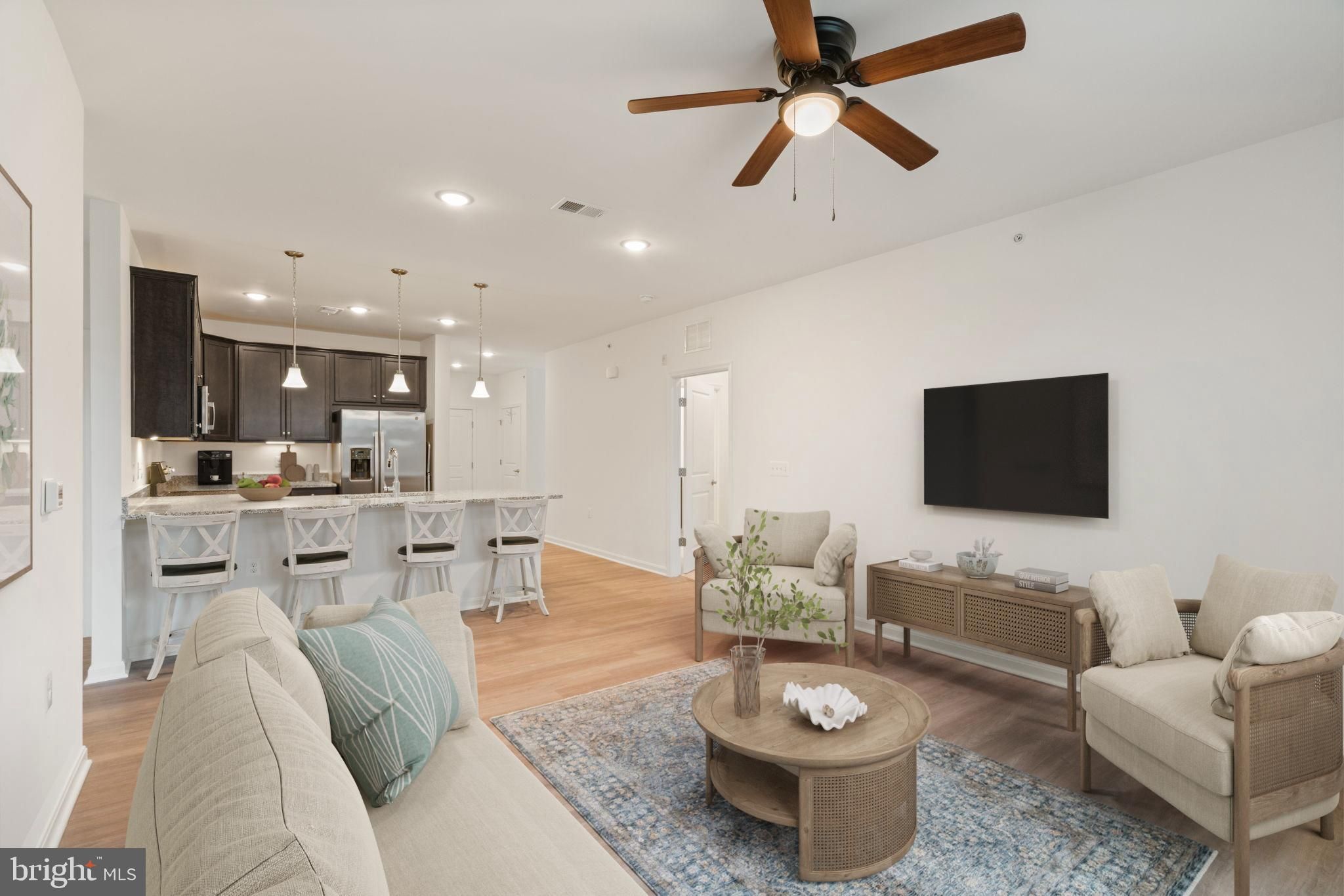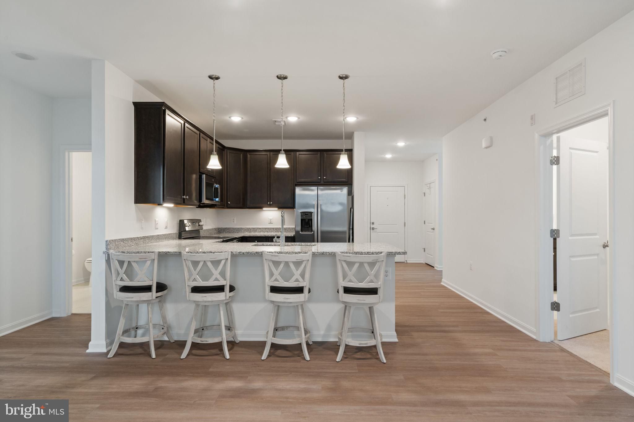 Modern, bright, and beautifully upgraded in this sought after 55+ community! This unit features an open layout with LVP flooring, quartz countertops, soft-close cabinets, stainless appliances, and pendant-lit counter seating. Spacious primary suite with large walk in closet. Second bedroom has its own en-suite full bath. Private garage, driveway, storage! All of this is directly across from the exciting Quartz District that is being built — shops, eateries, events, and walkable lifestyle right outside your door!