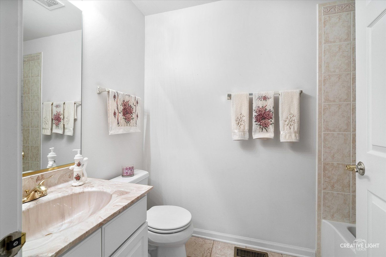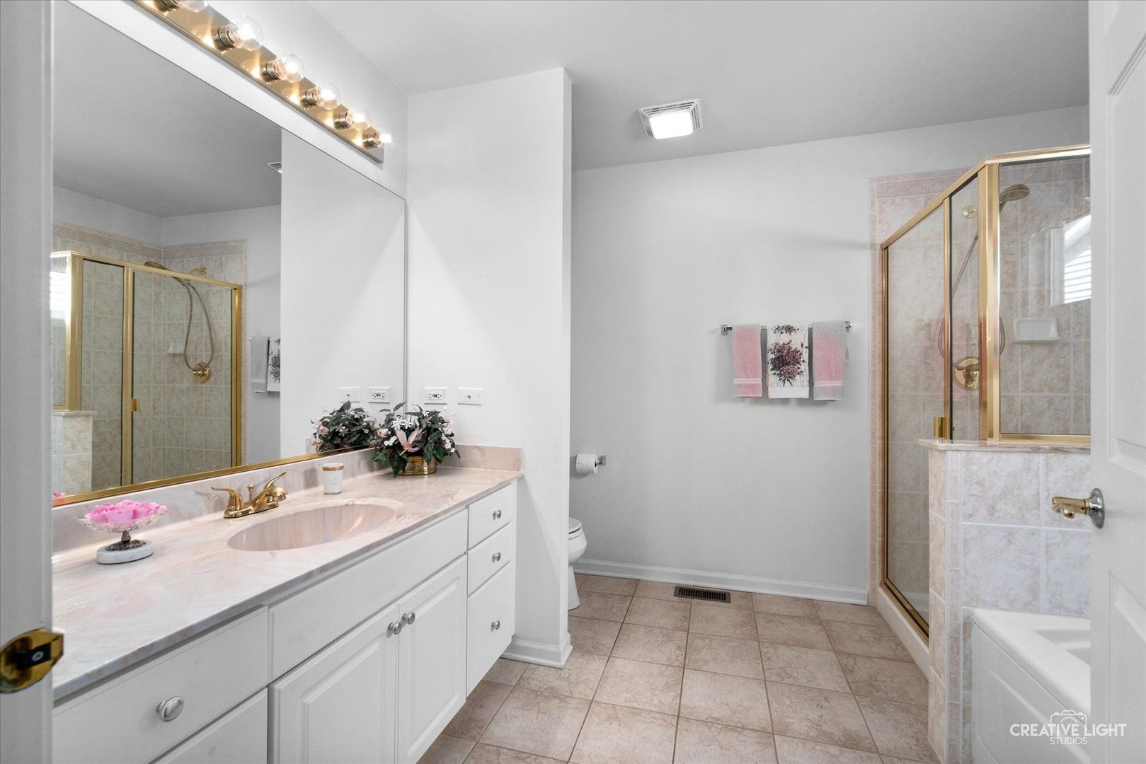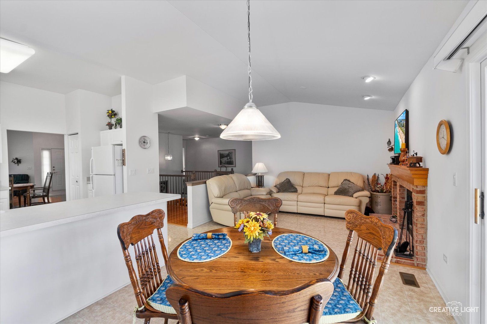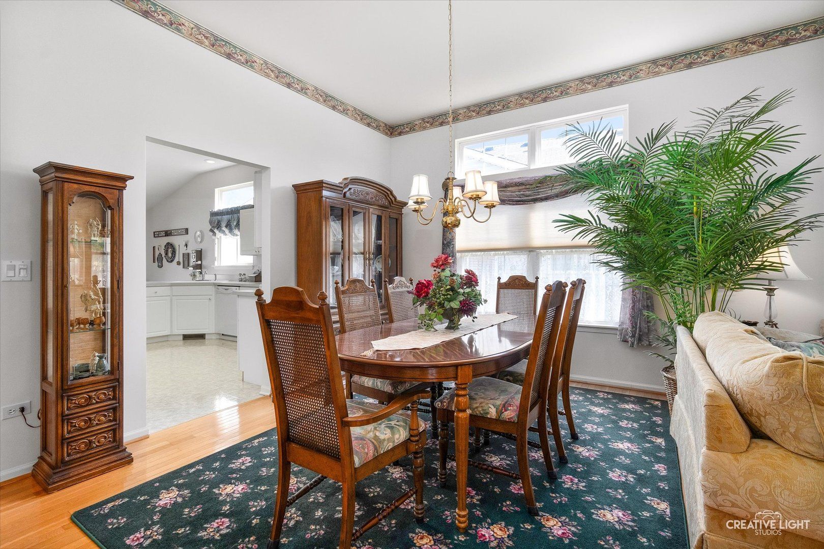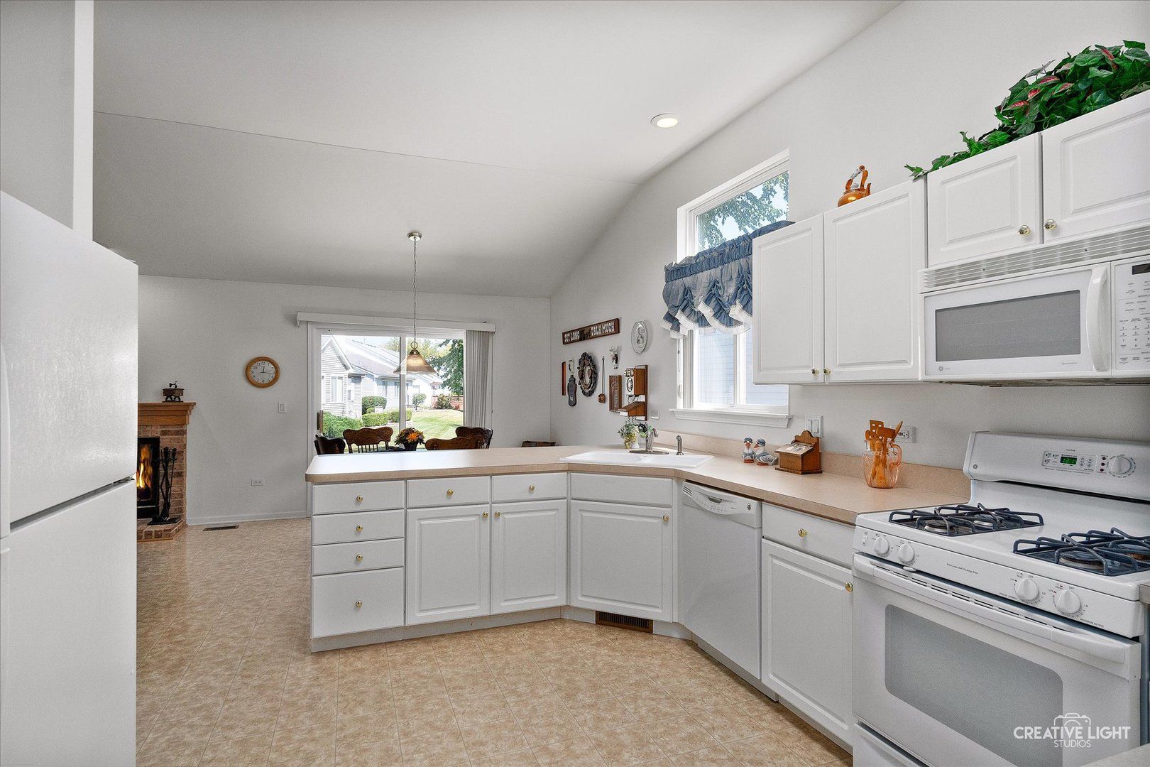 Carillon is a very active adult community. This is one of the best kept homes in the Dover neighborhood. The Tanterra model, 1673 square foot, 2 Bedroom, 3 full baths, with a Full finished Basement has an open view from the front and from the back of the house. You can enjoy the south exposure for a lazy late afternoon reading session on the covered front porch or a grilling session on the private back patio, (there are no home in front or in back ). The home has 3/4" hardwood floors in all but the Kitchen and Family rooms. Living room and Dining room have volume ceilings with the Dining room wired with a wall switch for a future fan. The Kitchen has upgraded white cabinets with white appliances, a comfortable breakfast area and an attached Family room with a brick gas log fireplace and another wired fan in the volume ceiling. A half wall separates the Family Room from the open stair case to the full finished lower level. Instead of the enclosed stair case the owner had installed a beautiful hardwood banister railing. Very attractive. The Main Bedroom consists of a large bedroom with a walk-in closet and a standard 6 foot closet with mirrored doors, and wired for a ceiling fan. A single sink, soaking tub and a separate shower finish the main bath. Finishing the main level is the 2nd Bedroom, Hall Bath and the full size Laundry room with wall cabinets. The full lower level has a large recreation room, a 2nd Kitchen (great for entertaining), a Bonus room/Office/Bedroom with a walk-in closet, and another full bath. A large storage area and utility room finish this area. Utilities are newer: Furnace (2020), AC (2013), Gas water tank (2025) and the ejector pump was just replaced. This room also has a service sink. Carillon is an ACTIVE 55+ adult community w/(3) 9 hole golf courses, Pro shop, (3) pools, Tennis & Pickle ball, Boccie ball, game, craft rooms and an auditorium, lots of Clubs, Activities & Planned Trips, restaurant, ponds for fishing. Easy access to Weber and I-55. It's time to take a permanent vacation from lawn maintenance and snow shoveling. Guard Gated community.