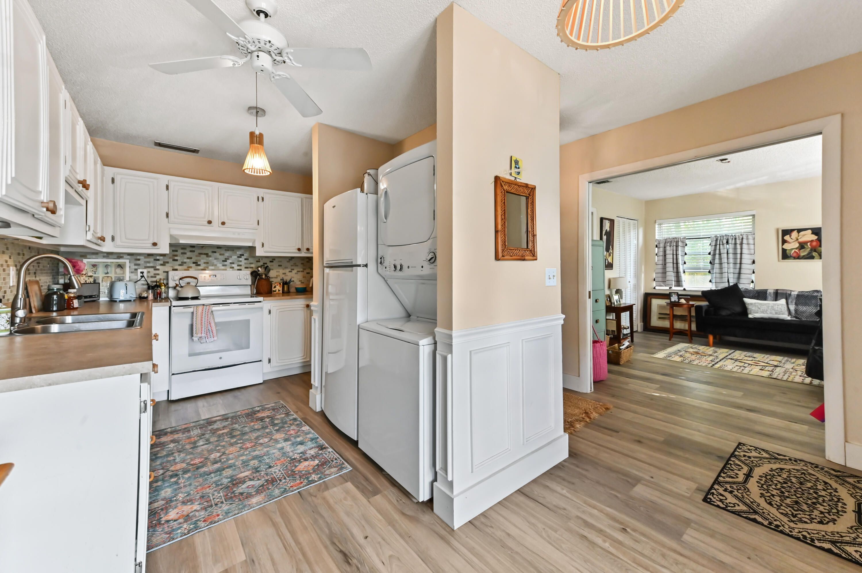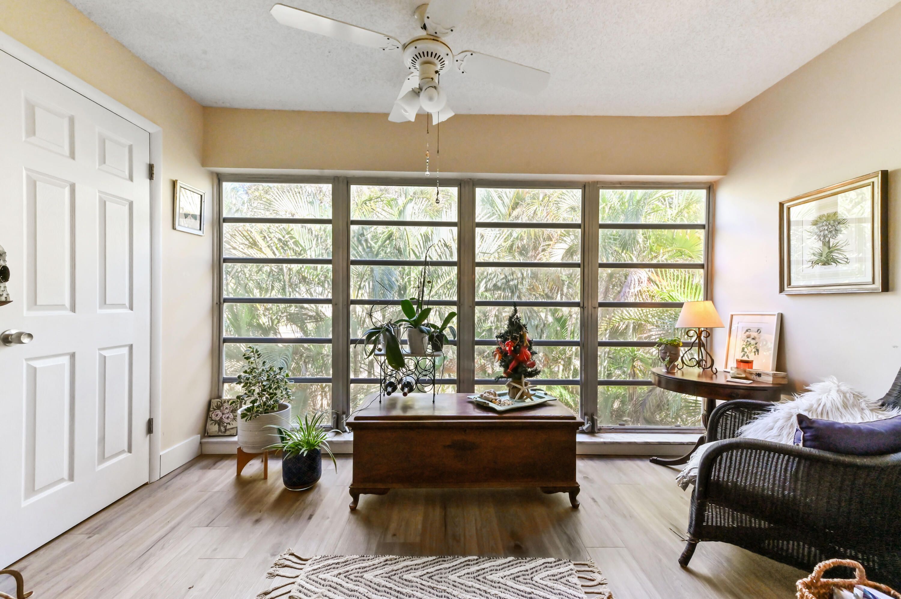 Discover this lovely end unit with extra windows and private views of paradise the minute you step in. The eat in kitchen has been updated and offers loads of white cabinets for plenty of storage. A/C brand new, Washer/Dryer 2022. Remaining appliances 2019. 18'' diagonal ceramic tile flooring. Wainscoting in the hallway leading to the living and dining room areas adds to the enhancements. The balcony has been opened to the living room giving you even more space! The large primary bedroom has 3 windows with a lush, tropical views and easily fits a king sized bed with plenty of space to spare in addition to plenty of closet space. The guest bedroom and second full bath can easily double as a den or office. Enjoy resort-style amenities, pool, spa, tennis, clubhouse, exercise studio, and live entertainment. With a full activity schedule, there's always something to do! NEW state-of-the-art clubhouse & amenities being constructed to bring a modern and upscale lifestyle to Palm Greens. Just minutes to Delray's award-winning downtown and gorgeous beach, highways, shopping restaurants and much more! Come live & play in paradise!