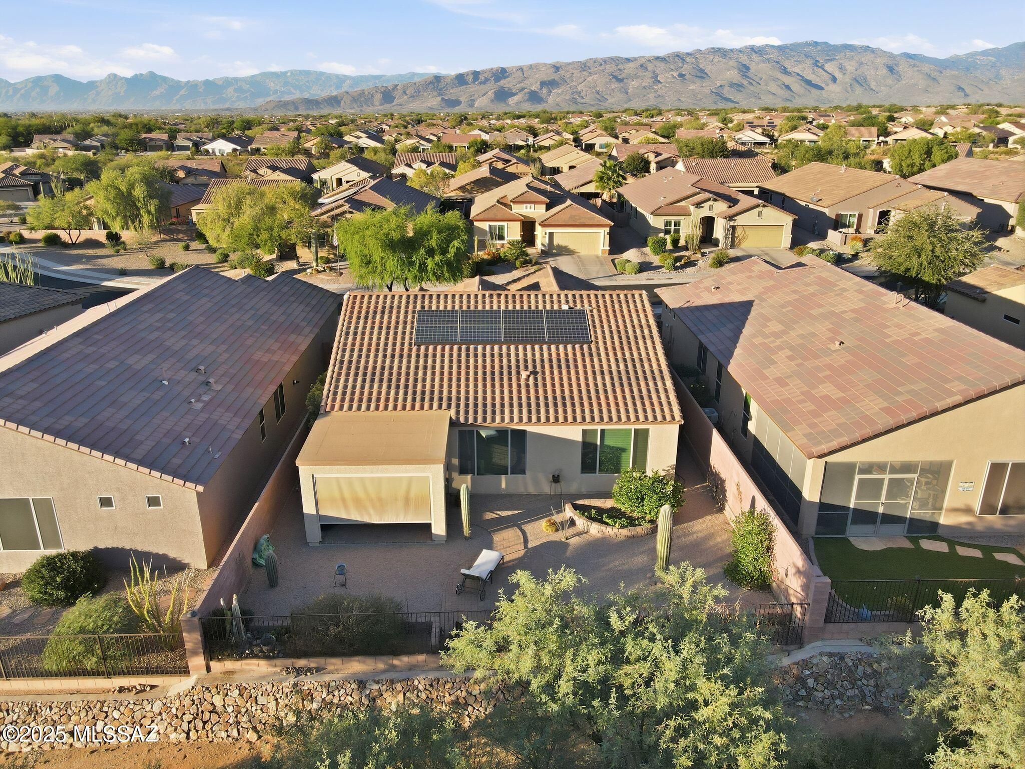 Hard to find newer golf course home in 55+ community of Del Webb at Rancho del Lago.This 2BR/2BA,3 car tandem garage original owner home is situated on the 7th tee box of beautiful Del Lago golf course.Newly painted exterior. 8 panel (owned) solar system keeps electric costs low.Mostly tile throughout except guest BR has wood floor.Carpet in Primary BR only.Wonderful gourmet kitchen w/large breakfast bar,granite countertops,upgraded cabinetry,gas cooktop & walk in pantry.Very private lot w/mature tree's in the back providing shade & bird watching.Relax w/a cold drink by the firepit and surrounding sahuaro cactus on our cool winter evenings. 3rd bay of garage great for workshop,golf cart,boat,camper, or classic car. coffered ceiling in entryway & primary BR. Great Price & Great Home !