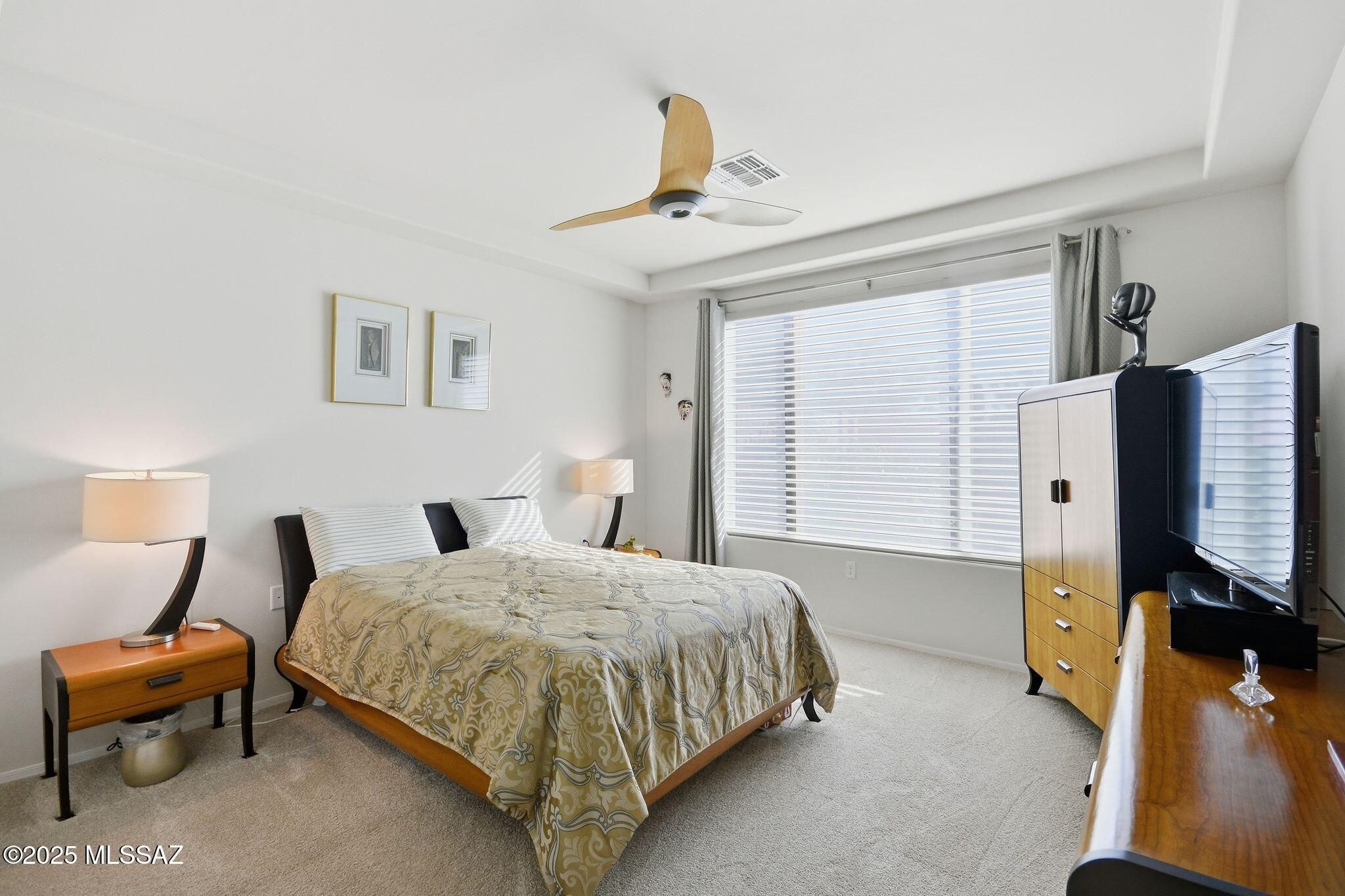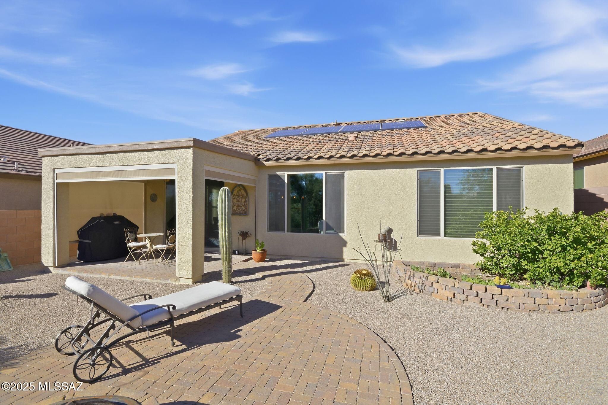 Hard to find newer golf course home in a 55+ community. This of Del Webb at Rancho del Lago 2BR/2BA,3 car tandem garage original owner home is situated on the 7th tee box of beautiful Del Lago golf course.Newly painted exterior. 8 panel (owned) solar system keeps electric costs low.Mostly tile throughout except guest BR has wood floor.Carpet in Primary BR only.Wonderful gourmet kitchen w/large breakfast bar,granite countertops,upgraded cabinetry,gas cooktop & walk in pantry.Very private lot w/mature tree's in the back providing shade & bird watching.Relax w/a cold drink by the firepit and surrounding sahuaro cactus on our cool winter evenings. 3rd bay of garage great for workshop,golf cart,boat,camper, or classic car. coffered ceiling in entryway & primary BR. Great Price & Great Home