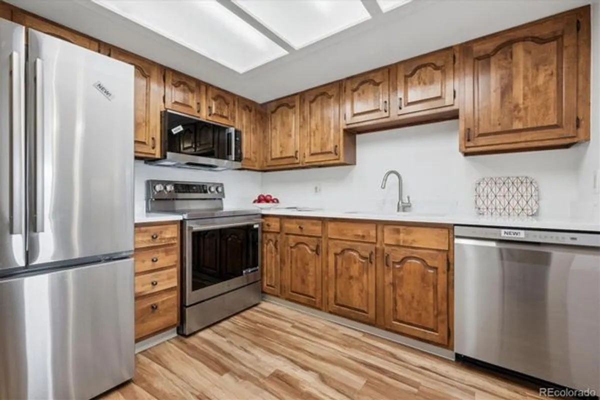 Welcome to 13991 E Marina Drive #501, a stylishly refreshed 1-bedroom, 1-bathroom condo offering 838 square feet of comfortable living in Heather Gardens—Aurora’s premier 55+ community. Perched on the fifth floor, this home enjoys fantastic views of the mountains in the distance, adding a beautiful backdrop to everyday living.Inside, durable LVT flooring flows through the entry, living room, and kitchen, creating a fresh, modern feel. The kitchen has been fully upgraded with brand-new 4-piece LG stainless steel appliances, quartz countertops and sinks, and fully renovated cabinetry, making it both functional and stylish for daily living and entertaining.The open living room is filled with natural light, features fresh paint throughout, and offers direct access to the private balcony, where you can relax and take in the expansive mountain views. Comfort is ensured year-round with two newer A/C units, including a new GE unit. The bedroom includes neutral carpeting and a large walk-in closet, while the bathroom has been refreshed with matching quartz counters, new sink, and updated finishes.Additional highlights include:New electric service panel,Underground parking space #96 for year-round convenience,Storage locker #501 for extra belongings,Bright, move-in-ready interior with a clean, neutral palette. Living in Heather Gardens means enjoying an active lifestyle with access to a golf course, clubhouse, fitness center, swimming pool, walking trails, and a full calendar of social activities and events.With extensive updates already completed and mountain views from your private balcony, this move-in-ready condo offers an exceptional opportunity to enjoy low-maintenance living in one of Aurora’s most sought-after active adult communities. Schedule your showing today!