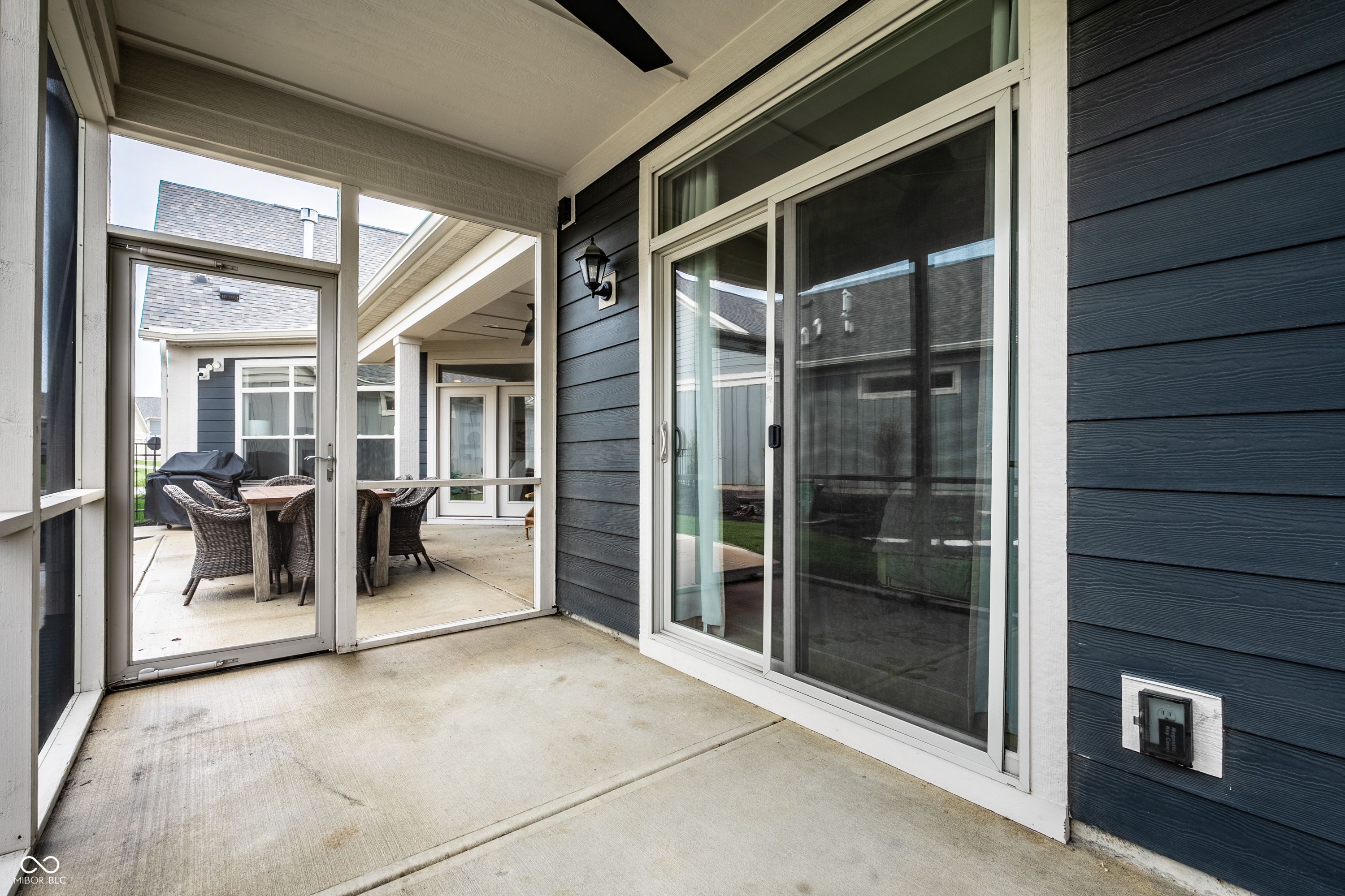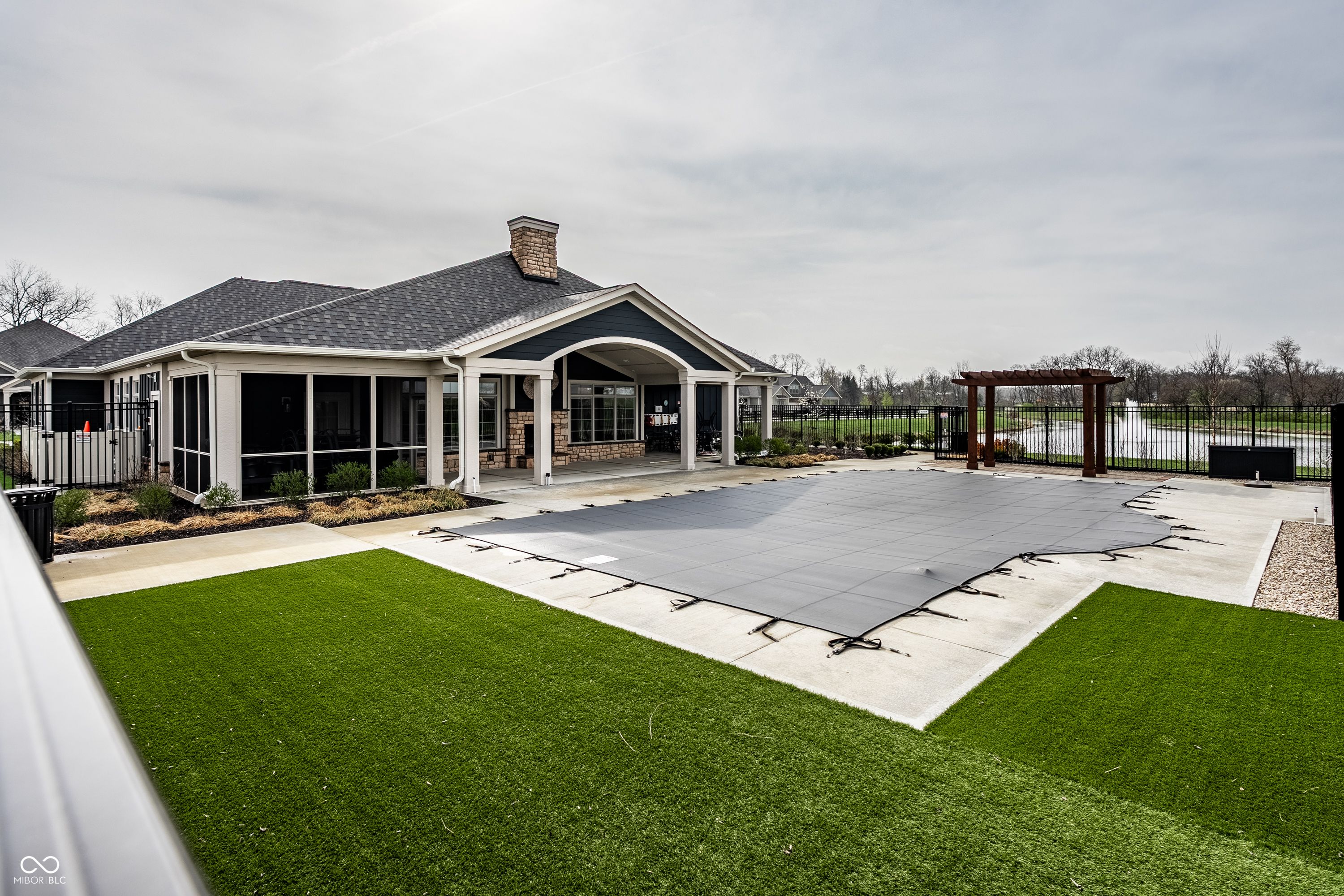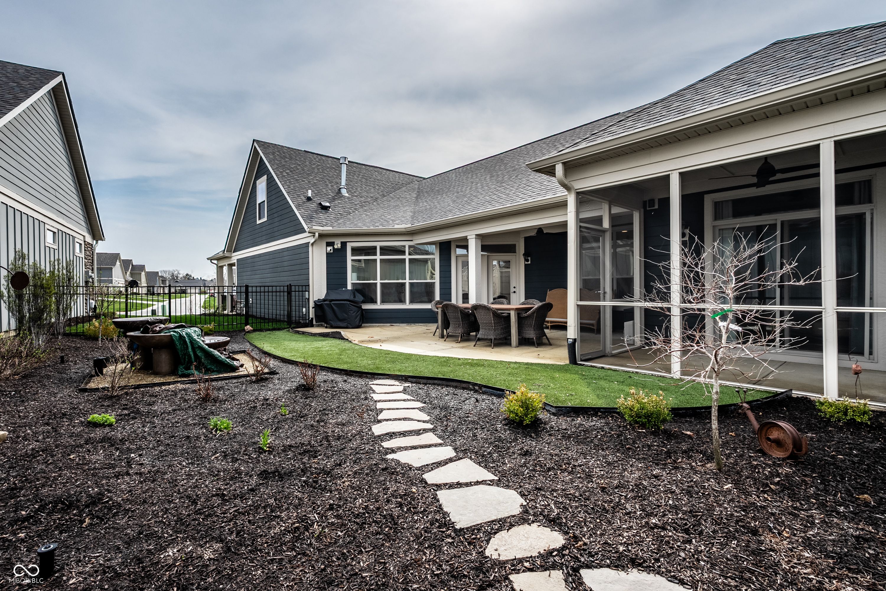 Welcome to 13944 Matt Street, a beautifully crafted home in the highly sought-after Courtyards of Carmel-Carmel's premier 55+ active lifestyle communities. Built by Epcon Communities, this residence offers low-maintenance living with refined finishes in an exceptional location. This one is loaded with all of the premium upgrades. The attractive exterior features cement board siding, stone accents, and a welcoming covered front porch. Inside, the large main-level living spaces showcase engineered hardwood floors throughout, high ceilings, and an open, light-filled layout. The heart of the home is a seamless living space combining the great room, dining area, and kitchen. A gas fireplace with stone surround anchors the living room, while the kitchen features quality cabinetry, a large island with large farmhouse sink, tile backsplash, premium appliances, and a walk-in pantry. A private office/den with sliding doors sits just off the main living area. The main-level primary suite offers a tray ceiling, spacious layout, and spa-like bath with dual vanities, a large marble-tiled walk-in shower, and walk-in closet. A screened-in porch off the bedroom provides a peaceful retreat. A second main-level bedroom with full bath is ideal for guests. Upstairs, a versatile loft, third bedroom, and full bath create the perfect private guest suite or flex space. Additional highlights include a well-appointed laundry room with custom California Closets cabinetry and utility sink. The fenced outdoor space offers privacy along with room for grilling and entertaining. Residents enjoy a clubhouse, pool, pickleball courts, and an active social calendar-all just minutes from the best of Carmel. This one has all of the quality upgrades and is the definition of a "lock & leave" turnkey home for your active lifestyle and travel schedule.