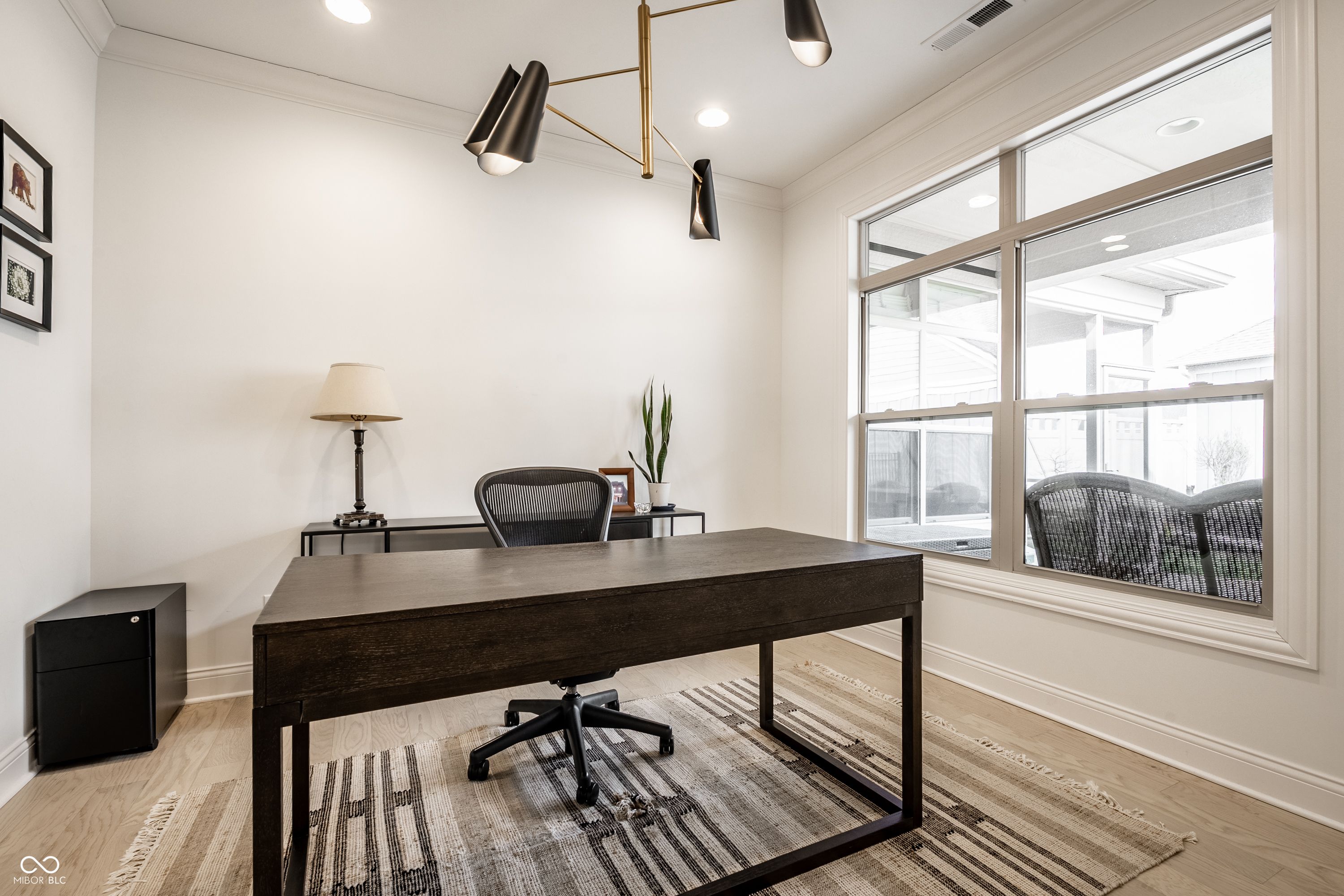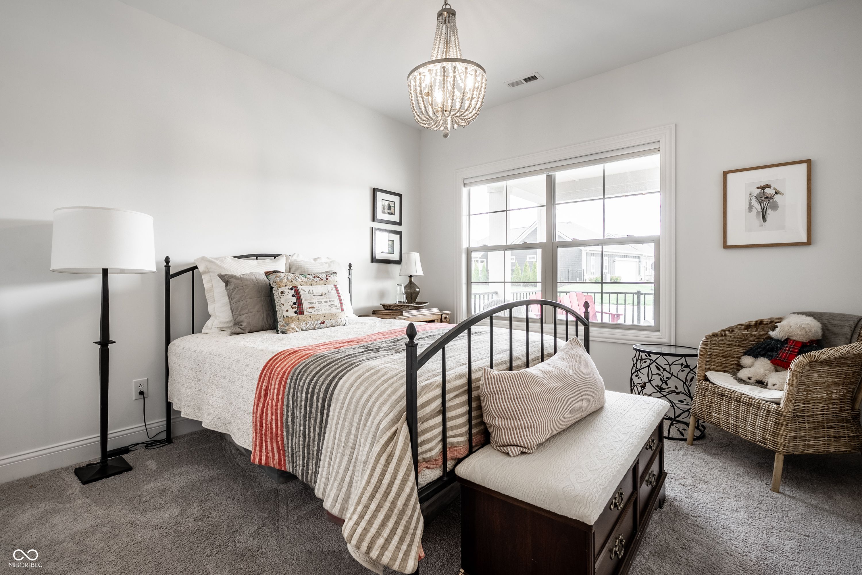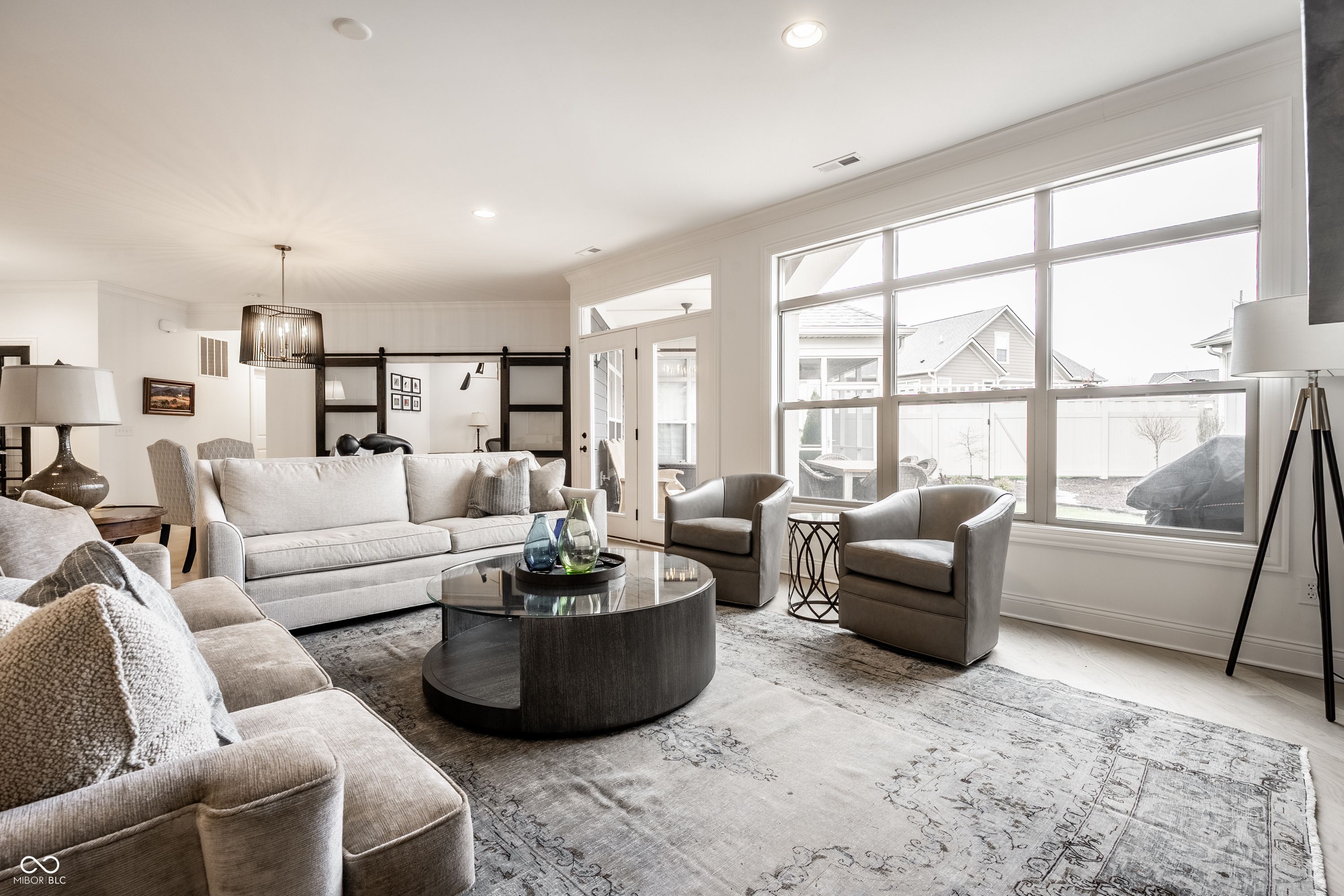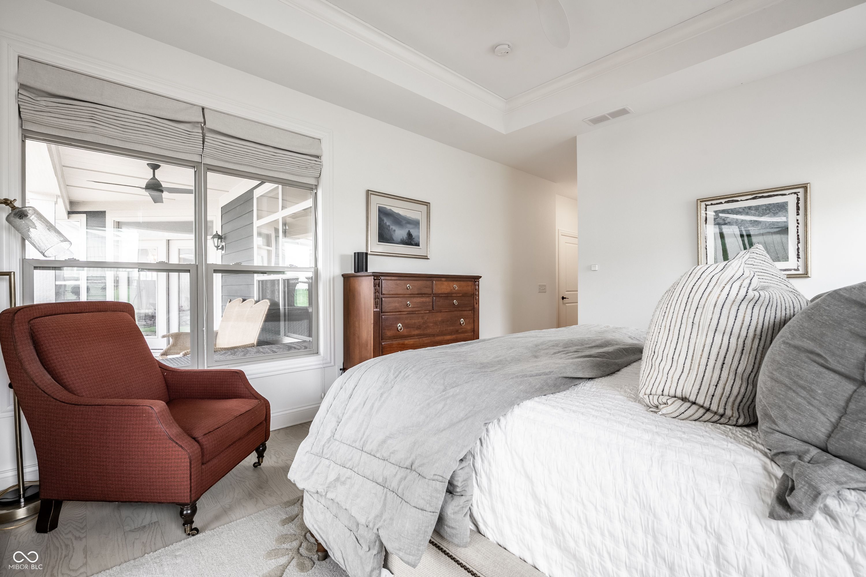 Welcome to 13944 Matt Street, a beautifully crafted home in the highly sought-after Courtyards of Carmel-Carmel's premier 55+ active lifestyle communities. Built by Epcon Communities, this residence offers low-maintenance living with refined finishes in an exceptional location. This one is loaded with all of the premium upgrades. The attractive exterior features cement board siding, stone accents, and a welcoming covered front porch. Inside, the large main-level living spaces showcase engineered hardwood floors throughout, high ceilings, and an open, light-filled layout. The heart of the home is a seamless living space combining the great room, dining area, and kitchen. A gas fireplace with stone surround anchors the living room, while the kitchen features quality cabinetry, a large island with large farmhouse sink, tile backsplash, premium appliances, and a walk-in pantry. A private office/den with sliding doors sits just off the main living area. The main-level primary suite offers a tray ceiling, spacious layout, and spa-like bath with dual vanities, a large marble-tiled walk-in shower, and walk-in closet. A screened-in porch off the bedroom provides a peaceful retreat. A second main-level bedroom with full bath is ideal for guests. Upstairs, a versatile loft, third bedroom, and full bath create the perfect private guest suite or flex space. Additional highlights include a well-appointed laundry room with custom California Closets cabinetry and utility sink. The fenced outdoor space offers privacy along with room for grilling and entertaining. Residents enjoy a clubhouse, pool, pickleball courts, and an active social calendar-all just minutes from the best of Carmel. This one has all of the quality upgrades and is the definition of a "lock & leave" turnkey home for your active lifestyle and travel schedule.