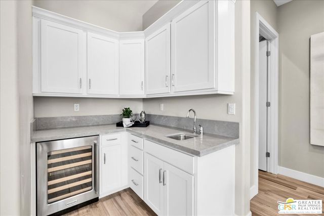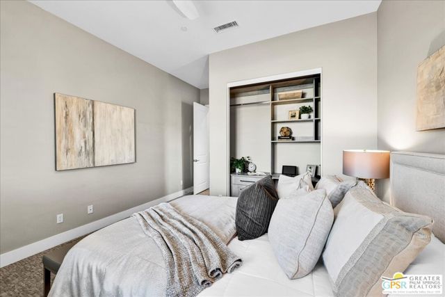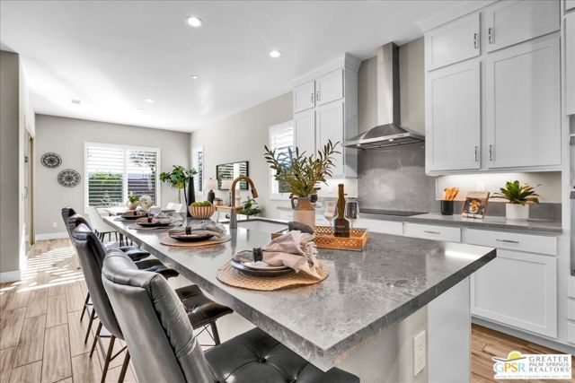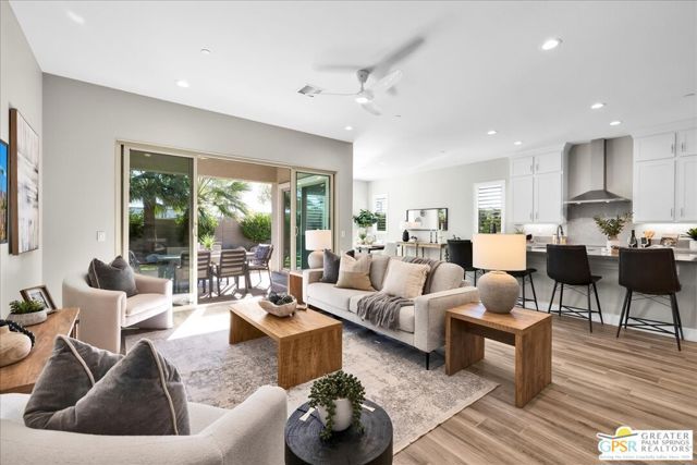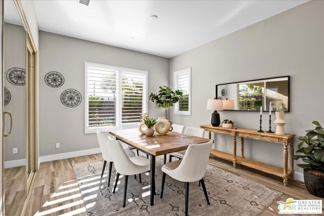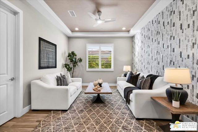 Elegant Desert Retreat in Del Webb Rancho Mirage - Step into refined desert living with this stunning Phase 4, Expanded Plan 7 Refuge featuring a timeless Prairie elevation. From the moment you enter, you're greeted by elegant tray ceilings in the round foyer and down the entry hall, accented by designer-selected wallpaper and rich wood-look plank tile flooring that sets a tone of sophistication throughout. This highly upgraded residence offers exceptional comfort and style, featuring plush upgraded carpet, 5 1/2" baseboards, and high-end ceiling fans in every room. The versatile floorplan includes dual ensuite bedrooms plus a powder room and a flex space with tray ceiling and walk-in closet - ideal as a media room, den, or easily converted third bedroom. At the heart of the home, the open-concept kitchen flows seamlessly into the dining and living areas. A chef's delight, it boasts quartz countertops, upgraded 42" upper cabinets and jewel cabinets with crown molding, soft-close drawers, induction cooktop, stainless appliances, and a large island with ample seating. The living area showcases an upgraded wet bar with a high-end wine fridge and dual sliding glass doors that open to the covered patio, creating effortless indoor-outdoor living. The primary suite is a serene sanctuary featuring tray ceilings, abundant natural light, and views of the lush backyard. The ensuite bath is a spa-worthy escape with a zero-threshold rain shower, dual vanities topped with natural granite, and a custom walk-in closet. The secondary suite, located on the opposite end of the home for added privacy, is equally impressive - offering San Jacinto Mountain views, a built-in desk and closet system, and full bathroom with granite countertops, and designer wallpaper accents. Additional highlights include leased SOLAR, a thoughtfully designed mudroom with a built-in shoe station and coat hooks, a spacious laundry room with cabinetry, granite counters, utility sink, and skylight. The fully finished, climate-controlled three-car garage features sealed floors, a 220V EV outlet, dedicated workshop space with upgraded outlet package, and remote-controlled HVAC for year-round comfort. The backyard is a private oasis, complete with real grass, natural stone walkways, citrus trees, ambient lighting, and peekaboo mountain views. A covered patio with remote-controlled zipper shade and a full rain gutter system add comfort and practicality to this outdoor retreat. Located near the clubhouse within the prestigious guard-gated 55+ community of Del Webb Rancho Mirage, residents enjoy access to world-class amenities including pools, spa, tennis and pickleball courts, fitness center, and a vibrant social scene. Experience the perfect balance of elegance, comfort, and resort-style living - this home truly stands apart.
