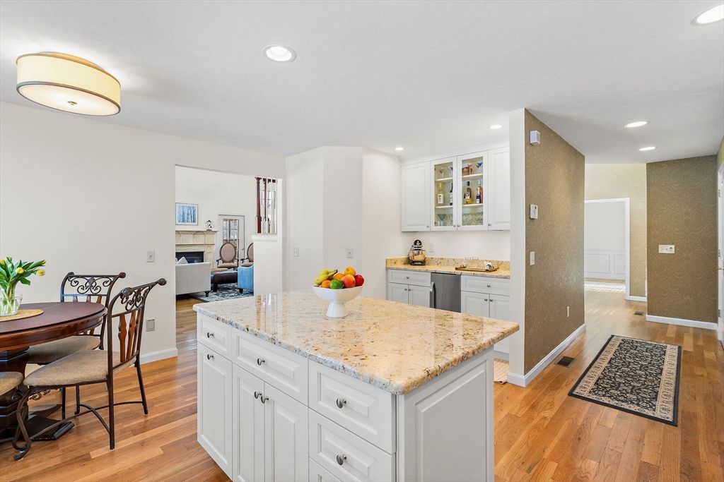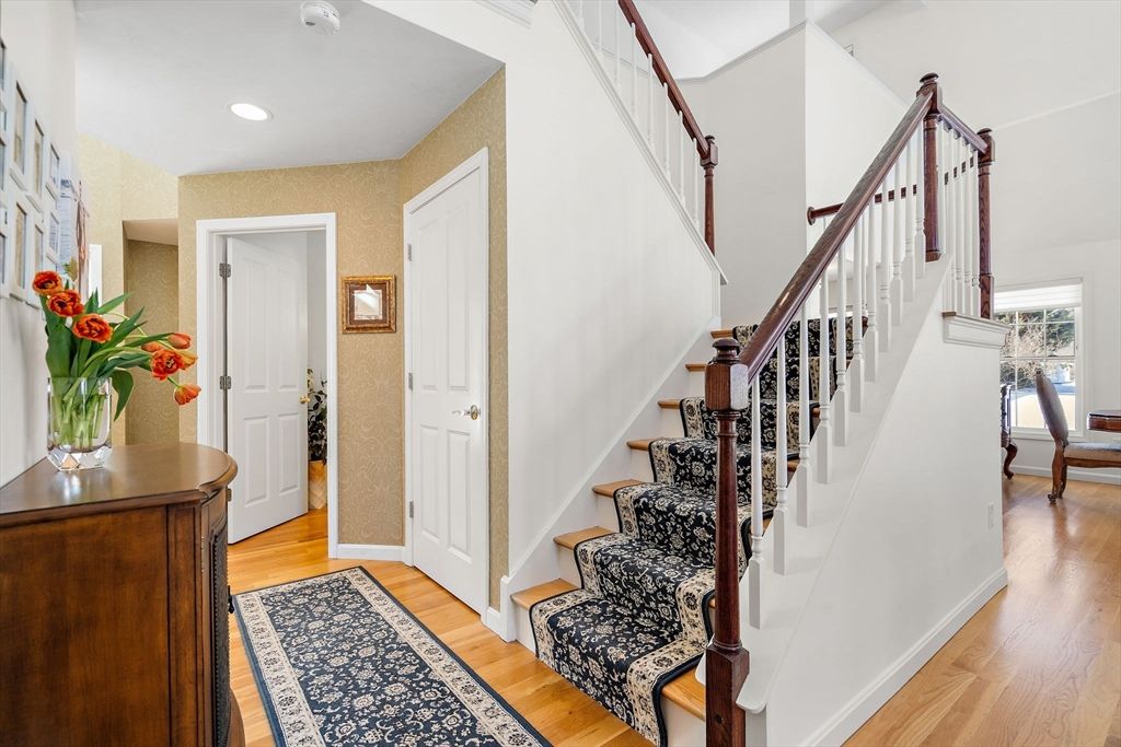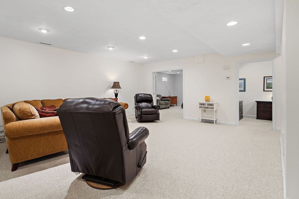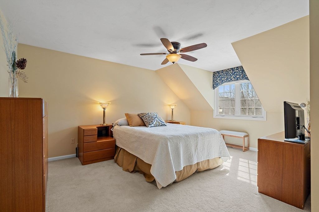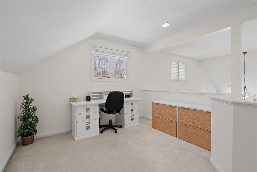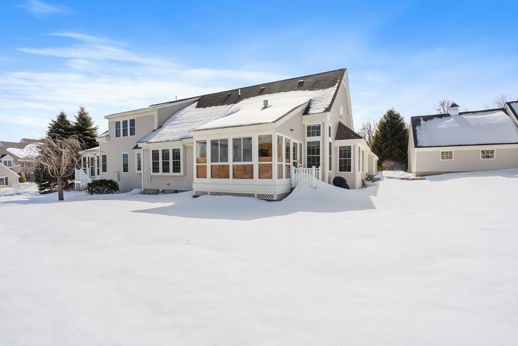 Refined sophistication meets effortless living. This sensational, designer-decorated home showcases exceptional custom detail throughout. The fully renovated kitchen shines with high-end appliances, custom cabinetry, granite counters, and a coffee bar with mini fridge. The dining room area is wide open and leads out to a charming 3-season room overlooking a private, lush rear yard. Hardwood floors span the first level, including a sun-filled vaulted great room with a gas fireplace and walls of windows. The first-floor primary suite offers a luxurious bath with glass enclosed walk-in shower and exceptional custom closet space. A second-floor guest suite with full bath, walk-in closet, and loft provides wonderful flexibility. The finished lower level features a media room, office, and exercise space plus abundant storage. Surrounded by conservation land, walking trails, and a vibrant clubhouse community. A detailed list of updates is attached—You will LOVE this home!