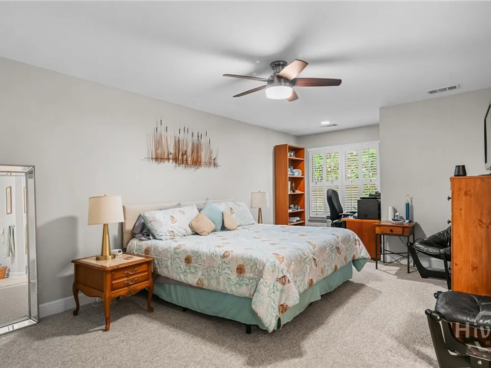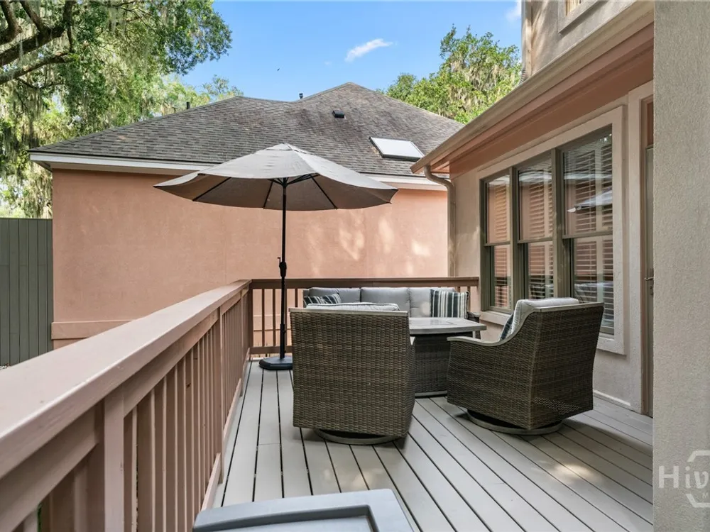 Beautiful 3BR/3.5BA hard coat stucco patio home near the gate for easy access. Primary suite on main with updated bath, hardwood floors, formal dining, and a spacious great room with fireplace. Updated kitchen features granite counters, stainless steel appliances, breakfast area, and wet bar. Two guest suites upstairs with private baths and walk-in attic storage. Enjoy two large decks—perfect for grilling, entertaining, or bird watching—set in a private, greenbelt-adjacent setting. Professionally landscaped with zoysia grass, paver walkway/driveway, 2-car garage + golf cart garage. Walk to fitness center and Oakridge Club.