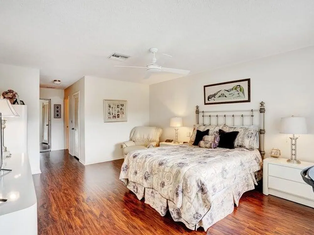 Beautiful second floor unit overlooking the tranquil lake, unit has laminate floors throughout, 2nd bathroom was completely renovated in 2023, elevator (belongs to unit and maintained by owner)and roof replaced in 2023, dishwasher replaced in 2023. Unit opens to an enclose porch with tile floors and wall full of windows. Master bathroom boasts oversized shower with bench and frameless doors, jetted tub master bedroom features 4 closets. This unit is within walking distance to the Westgate pool. Hunter's Run amenities include a beautifully appointed clubhouse with numerous dining rooms, state of the art fitness center and spa, tennis center, pickleball....you will be the envy of all your friends.