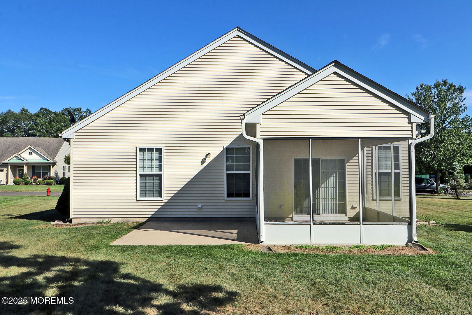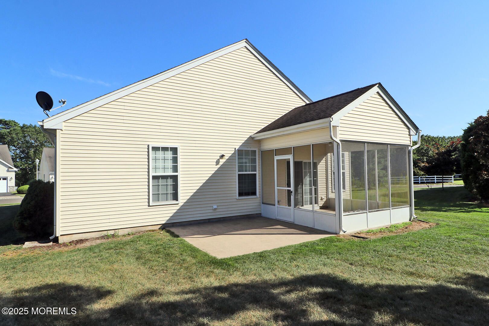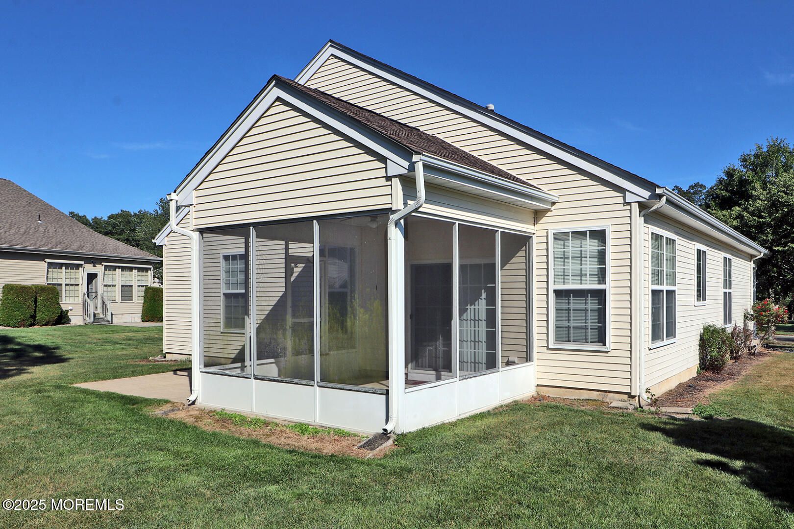 Many times, potential buyers in 55+ communities, complain that homes are often too close to one another. This is NOT the case with this Barnegat Model, situated on a premium lot in Heritage Point. Home has 2 bedrooms, 2 full baths, living room/dining room, eat-in kitchen and breakfast nook/family room. Granite kitchen countertops recently installed. Air conditioner just replaced on September 15, 2025. 3 season sunroom [with fan] and patio are great area for entertaining. Master bedroom has walk-in closet. New hot water heater. Home recently power washed. Rugs just shampooed. For active buyers there are MANY clubs, activities and trips. Indoor/outdoor heated salt water pools, tennis, bocce, exercise room, etc. What's missing here? Only YOU!