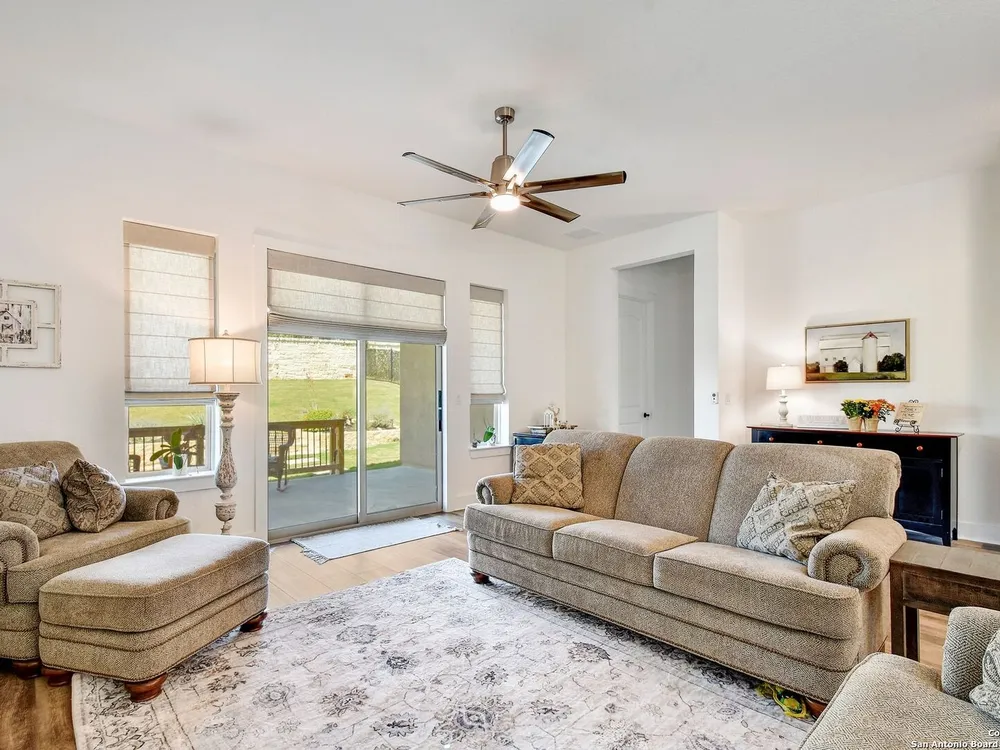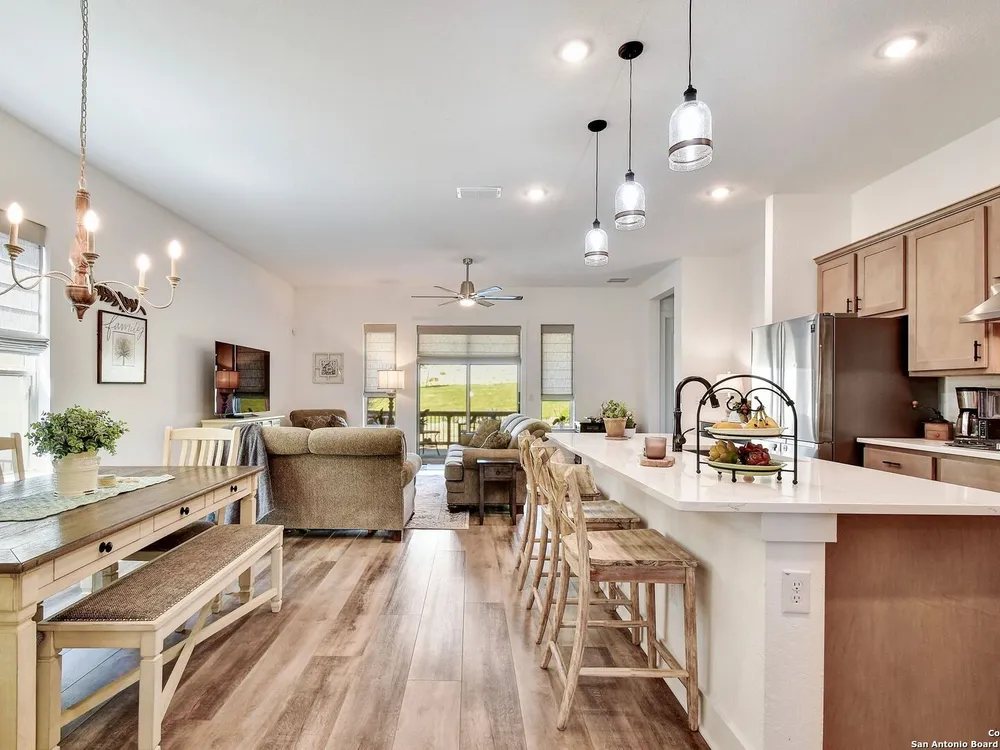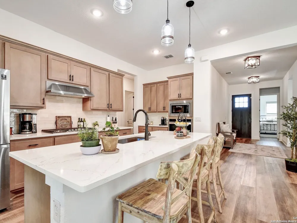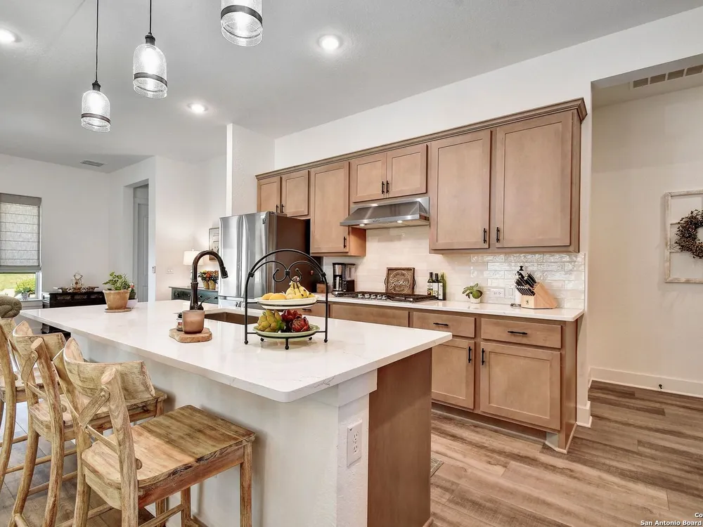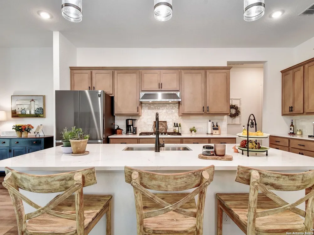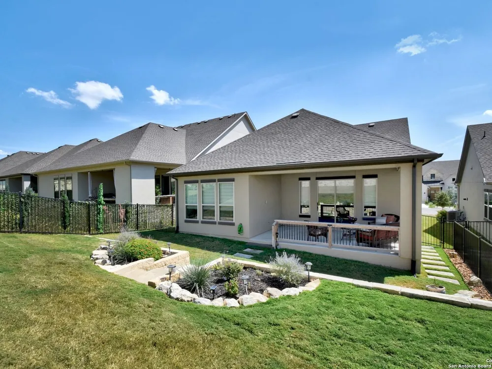 Move in and begin your next chapter in this practically brand-new, single-story home, built in 2023, and located just steps from the amenity center of a premier 55+ community in Boerne, TX. This 1,873-square-foot residence offers a low-maintenance lifestyle with luxurious modern features and the convenience of resort-style living right outside your front door. Why wait to build when you can own this stunning, turn-key home, perfect for a quick and stress-free closing process? This home showcases a contemporary, single-level floor plan with two spacious bedrooms and two full baths. The stylish eat-in kitchen is equipped with high-end stainless steel appliances, pristine quartz countertops, and a large island for casual dining or entertaining guests. The owner's suite features a private bath with a double vanity and a sizable walk-in closet, providing a serene retreat. The home's prime location offers unparalleled access to the community's exclusive amenities, including the clubhouse, fitness center, multiple sport courts and pool. Enjoy an extensive calendar of social events and activities planned by a lifestyle director. Located minutes from Boerne's historic Main Street, you'll have boutique shopping and highly-rated dining at your fingertips.