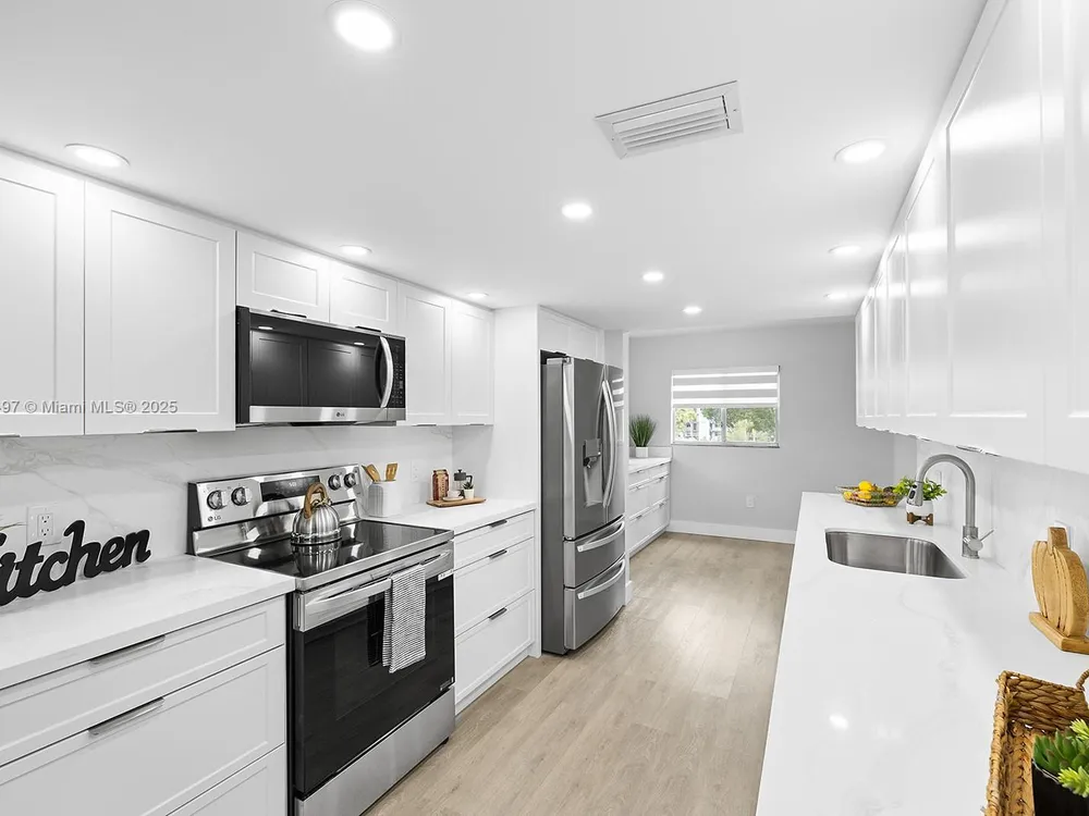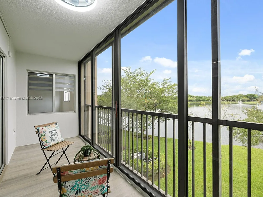 Experience the perfect blend of comfort and modern design in this beautifully updated 2BD/2BA corner unit with peaceful lake views. The new kitchen features ceiling-height custom wood cabinetry, quartz countertops, breakfast nook, stainless steel appliances and LED lighting. Waterproof vinyl flooring adds elegance throughout. The oversized primary suite includes a walk-in closet and remodeled en-suite with dual sinks. Both bathrooms have modern finishes, and zebra blinds add a stylish touch. Relax on the screened balcony with storage and serene views. Upgrades include new water heater and in-unit washer/dryer. Located in desirable 55+ Century Village with 24-hour gated security and resort-style amenities: clubhouse, fitness center, heated pools, tennis, theater, and shuttle. Move-in ready!