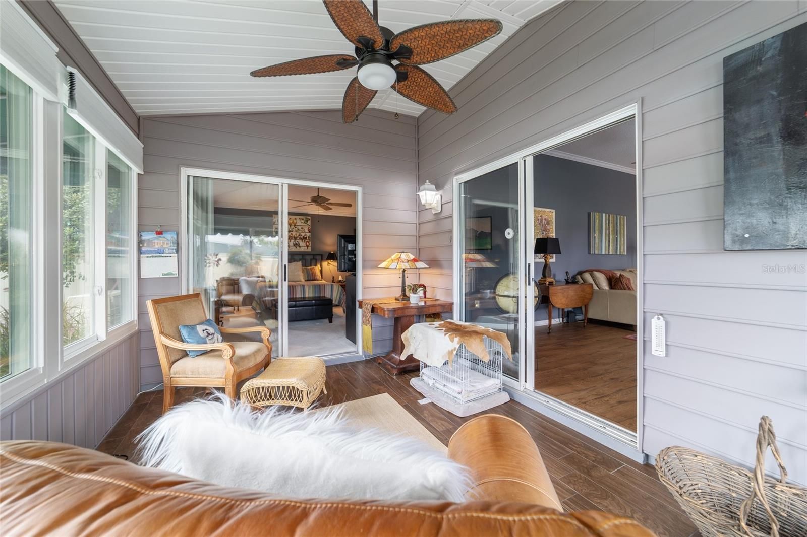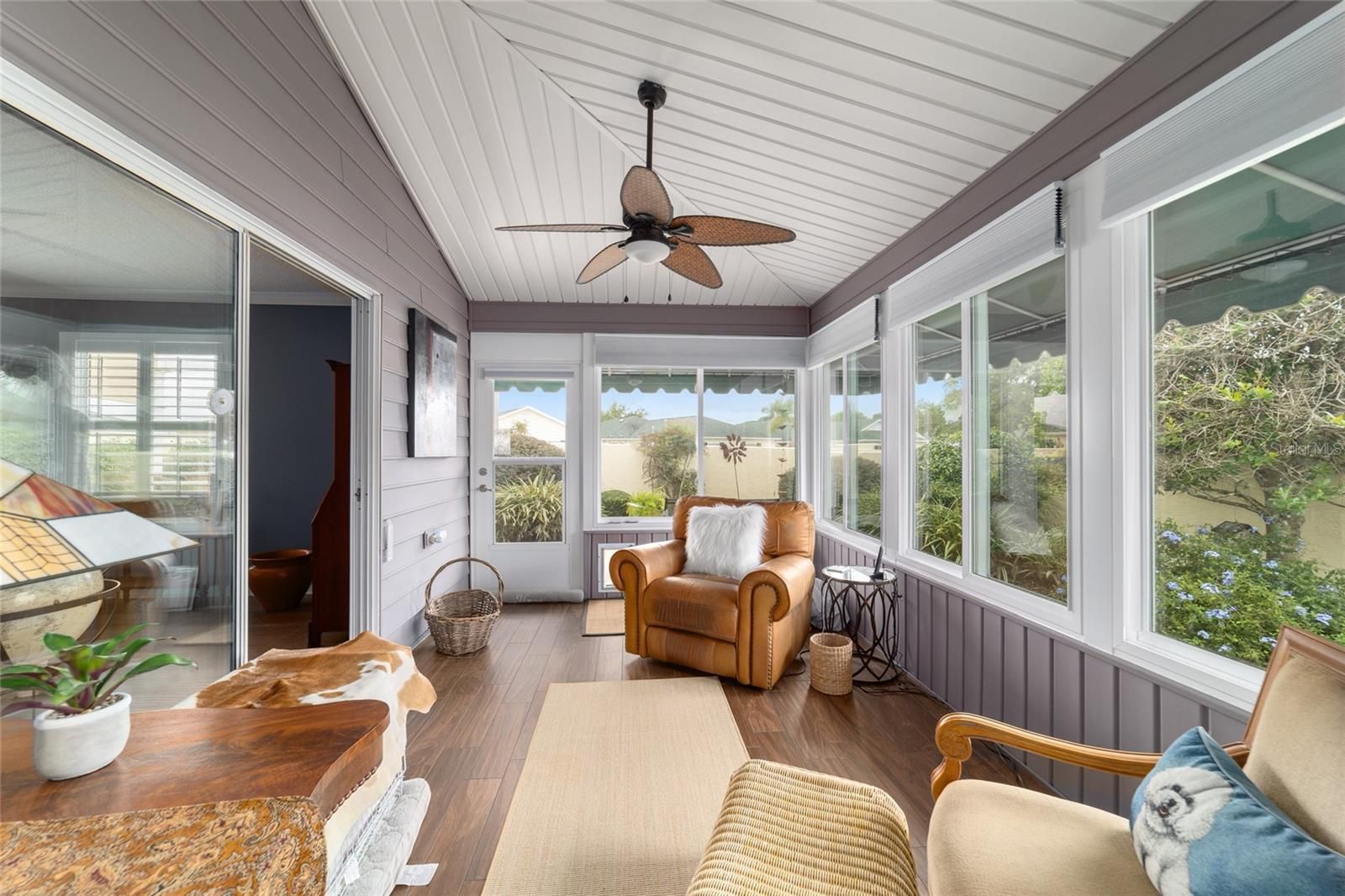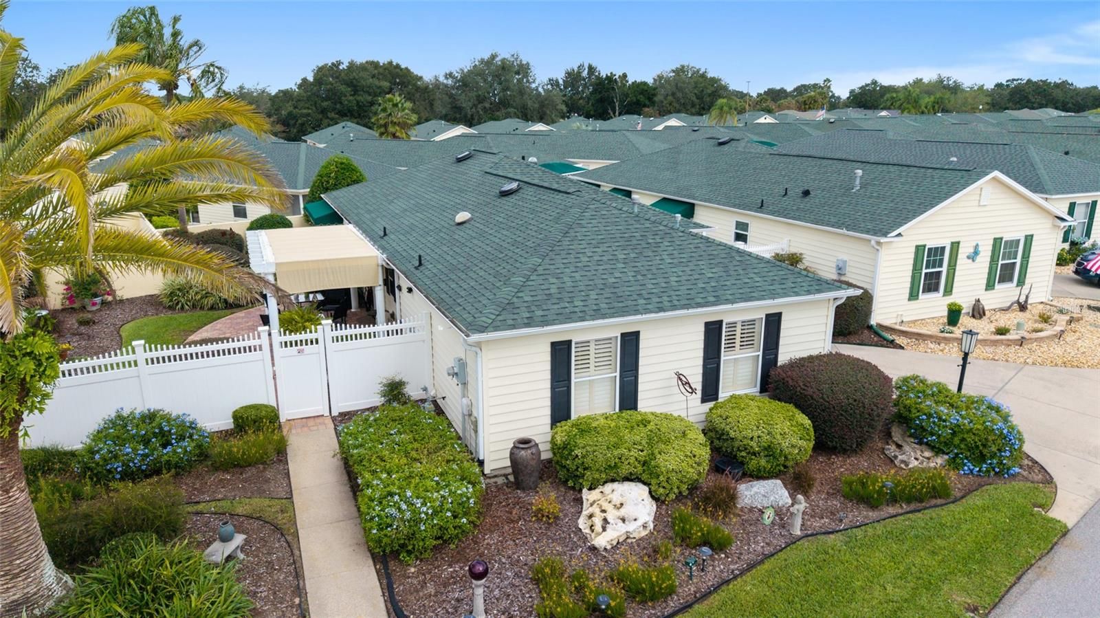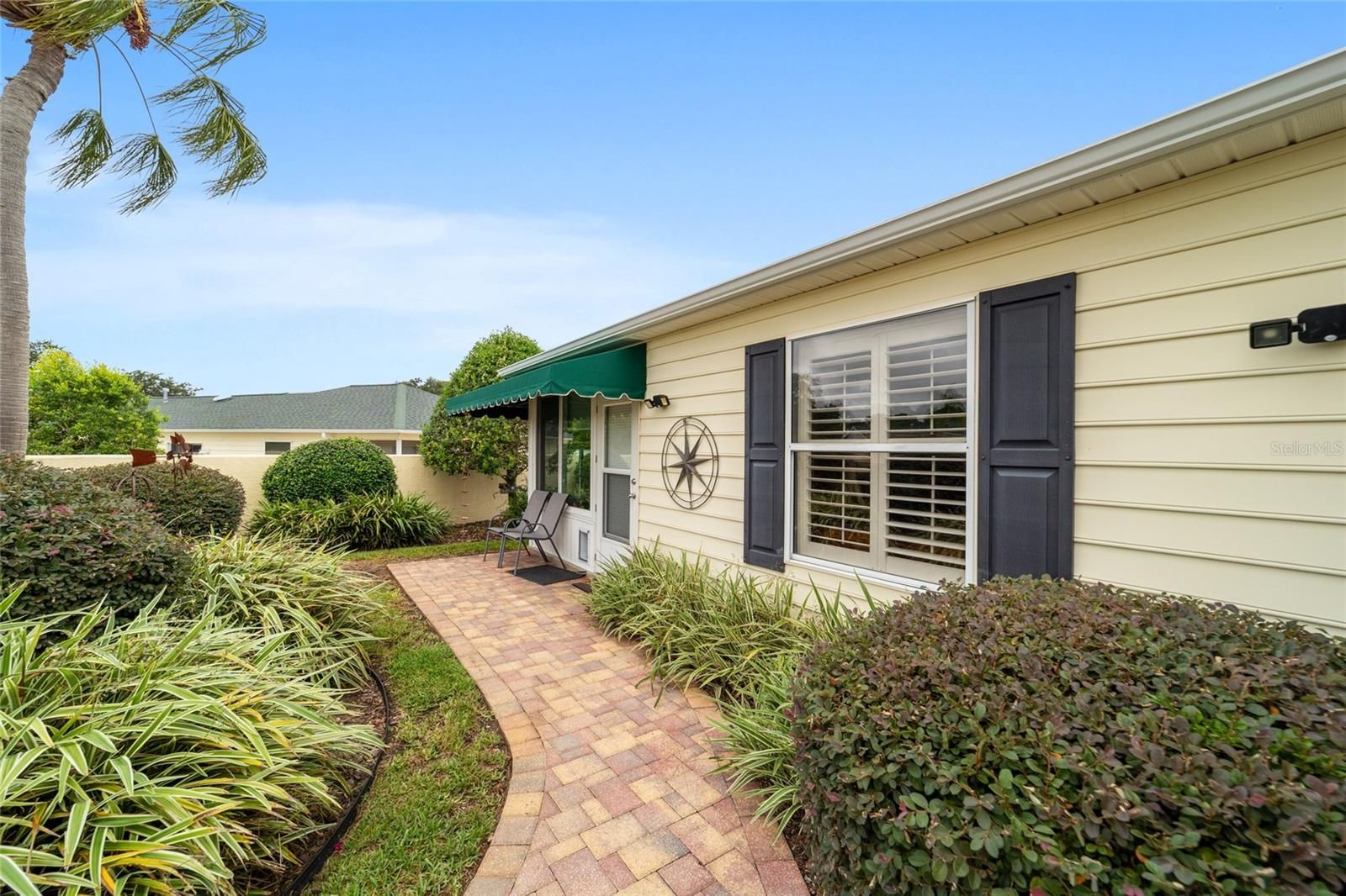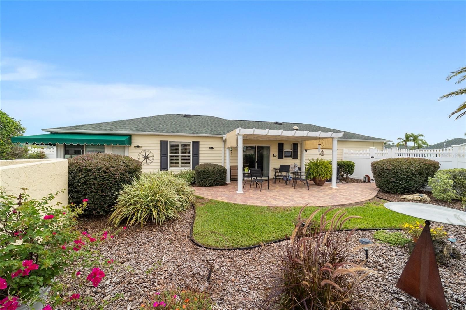 Welcome to this PRIVATE, UNIQUE, PET-FRIENDLY, FULLY FENCED beautiful courtyard villa home that sits on an OVERSIZED CORNER HOMESITE and is packed with character, comfort, and thoughtful upgrades throughout — all just minutes from multiple golf courses, nightly entertainment, the Glenview Country Club, the Savannah Center, restaurants, and more! Step inside to discover PLANTATION SHUTTERS, CUSTOM PAINT, elegant CROWN MOLDING, UPGRADED LIGHTING, and a thoughtfully designed layout perfect for modern living. The REMODELED KITCHEN (2020) features GRANITE COUNTERTOPS, STAINLESS STEEL APPLIANCES including a REFRIDGERATOR (2025), DISHWASHER (2021), and GAS STOVE (2020), along with a PANTRY CLOSET and ample cabinet space to inspire your inner chef. A CUSTOM MURPHY BED adds flexible living or guest space to the second bedroom, while the ENCLOSED LANAI invites you to relax year-round. Entertain outdoors on the PRIVATE, PAVER PATIO under a charming PERGOLA, surrounded by STUNNING LANDSCAPING with UNDERGROUND LIGHTING that completes the tranquil backyard oasis. Guest parking is located just around the corner, offering convenient access for visitors while you're entertaining. Additional features include a NEW ROOF (2017), A/C (2022), HOT WATER HEATER (2021), and a WATER SOFTNER SYSTEM. The garage includes a PRIVACY SCREEN and BUILT-IN CABINETRY offering workspace functionality and extra storage. This comfortable, stylish, and move-in ready home with NO BOND is a rare gem waiting for you to call home. Schedule your private showing today! *Outdoor birdbath does not convey.